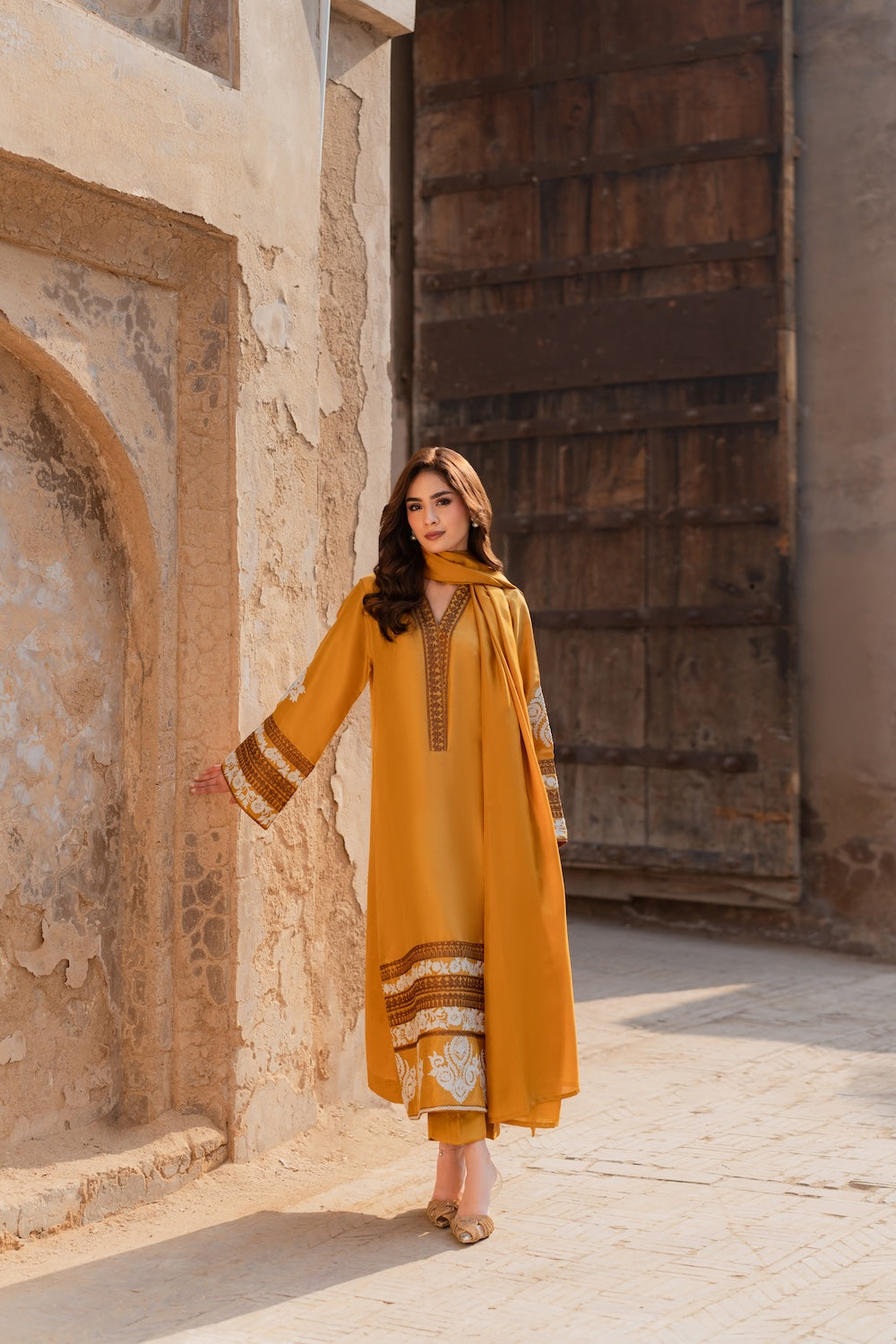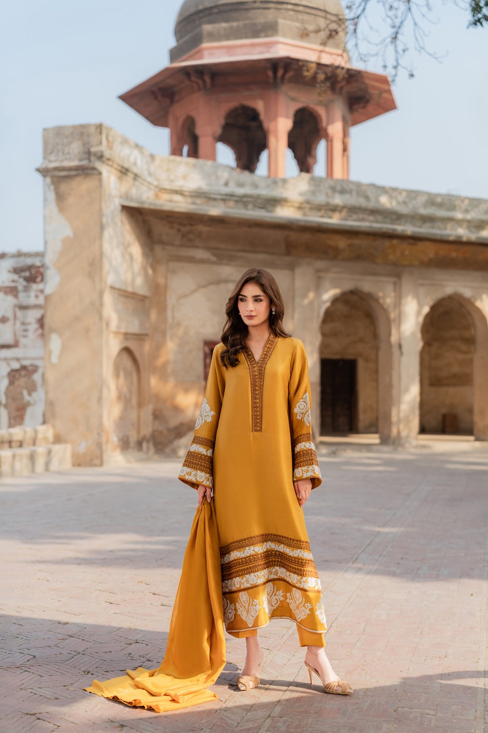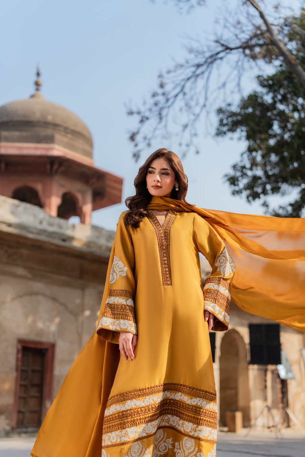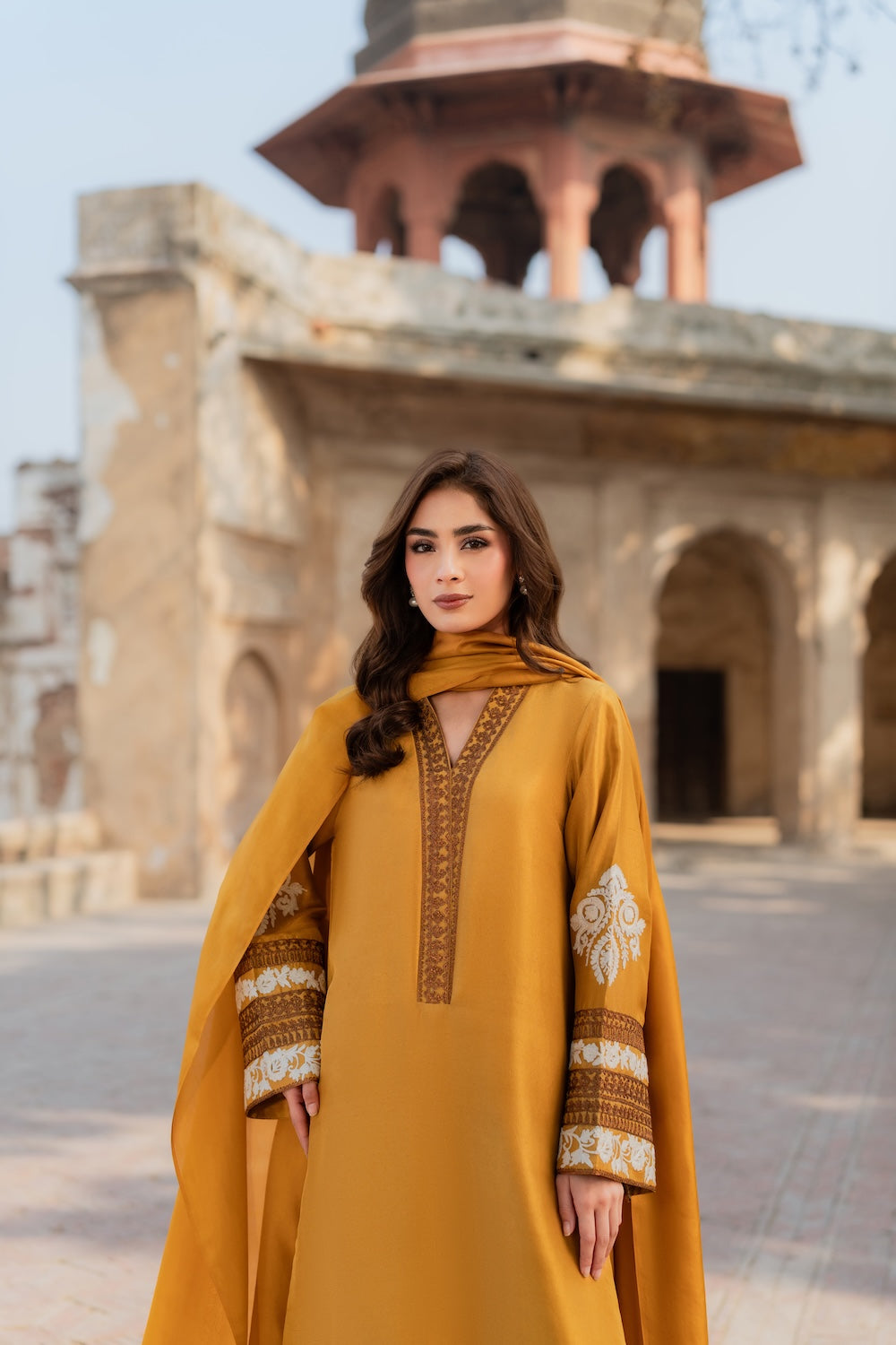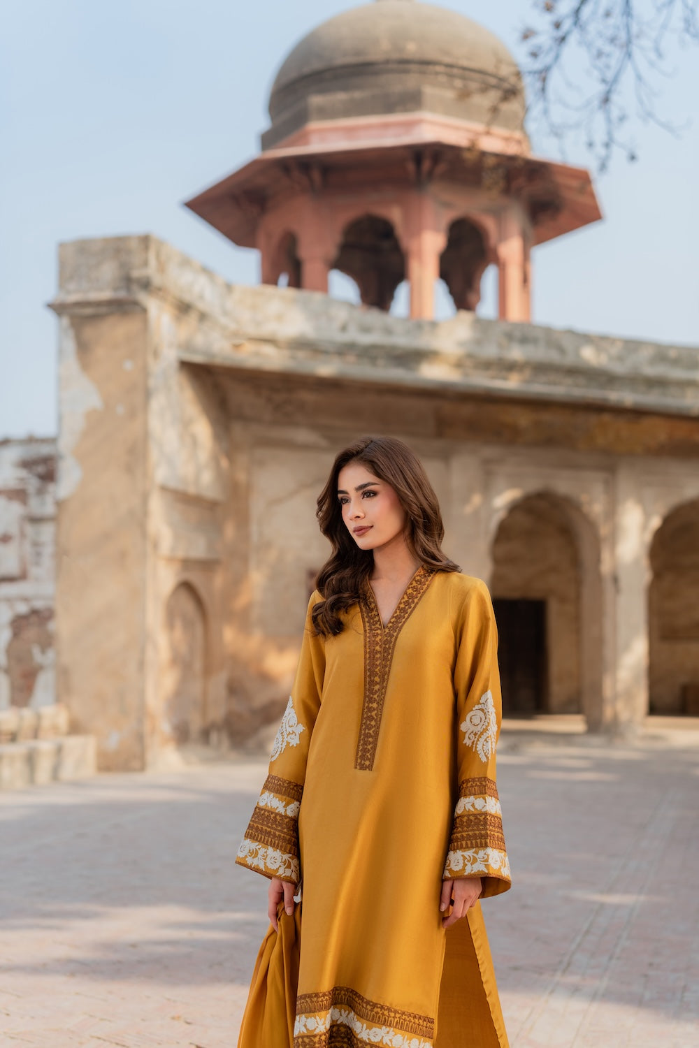 Draped in luxurious Korean rawsilk, AIMA is where mustard bliss meets multicolored artistry — featuring hand aari embroidery with simple yet perfect pattern, paired with PK silk dupatta for shining, sophisticated presence.