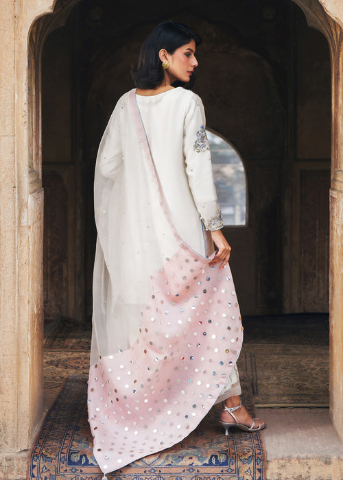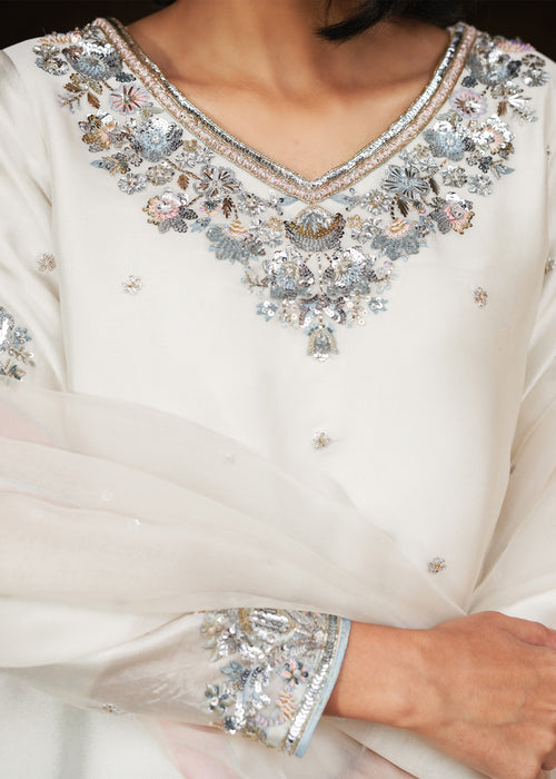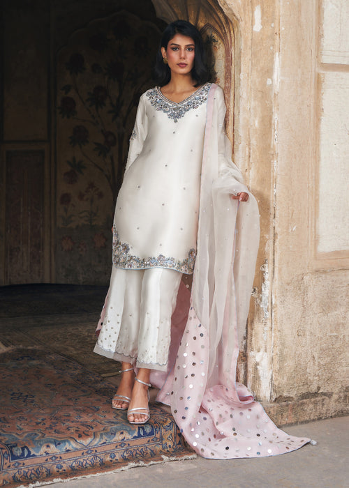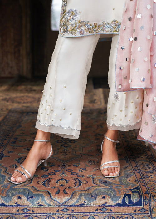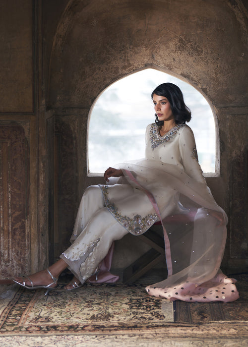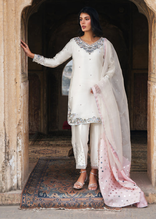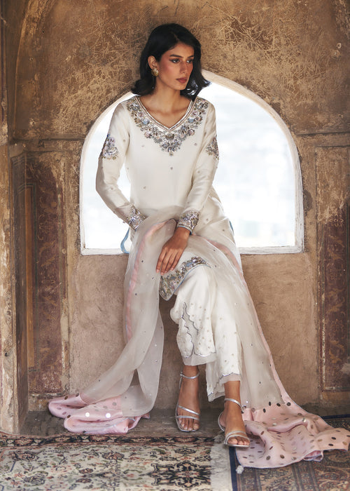 Discover timeless elegance with ALVORA, where luxurious tissue silk meets contemporary design — featuring an impeccably tailored ensemble paired with straight wide Korean raw silk Trouser and sheer kataan organza dupatta for effortless sophistication.