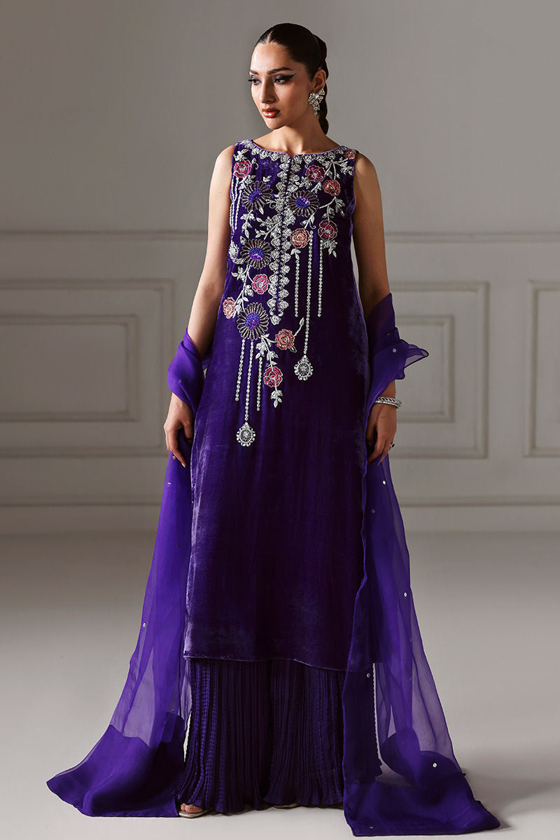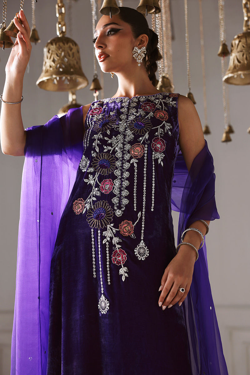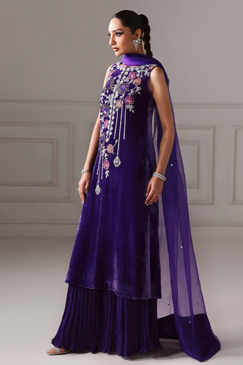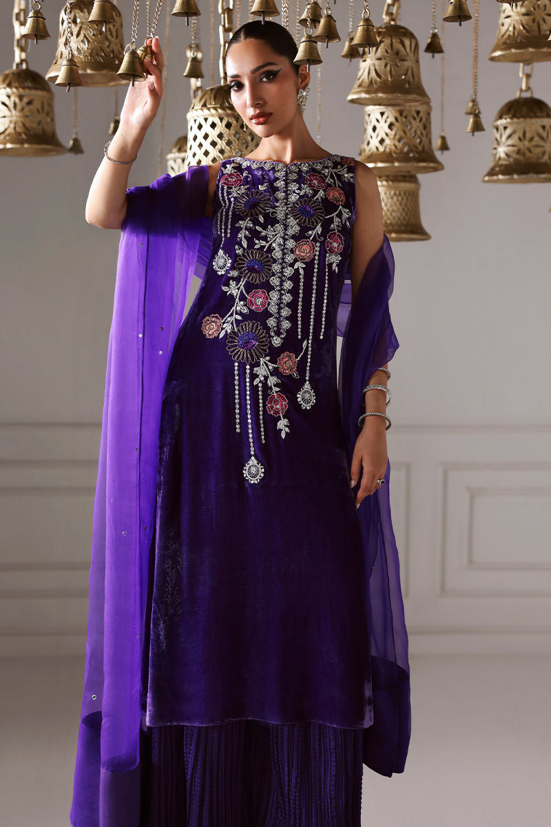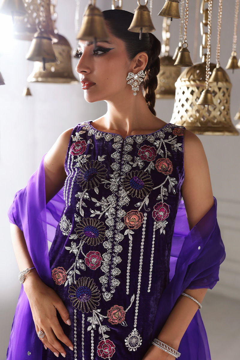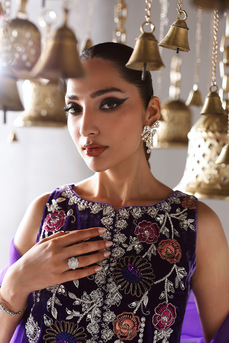 Draped in pure velvet, AMARAINE is where heavy embroidery meets lavish opulence — featuring deep purple shirt with floral embellishments for eye-catching charm, paired with medium silk sharara and pure organza dupatta for airy, elegant sophistication.