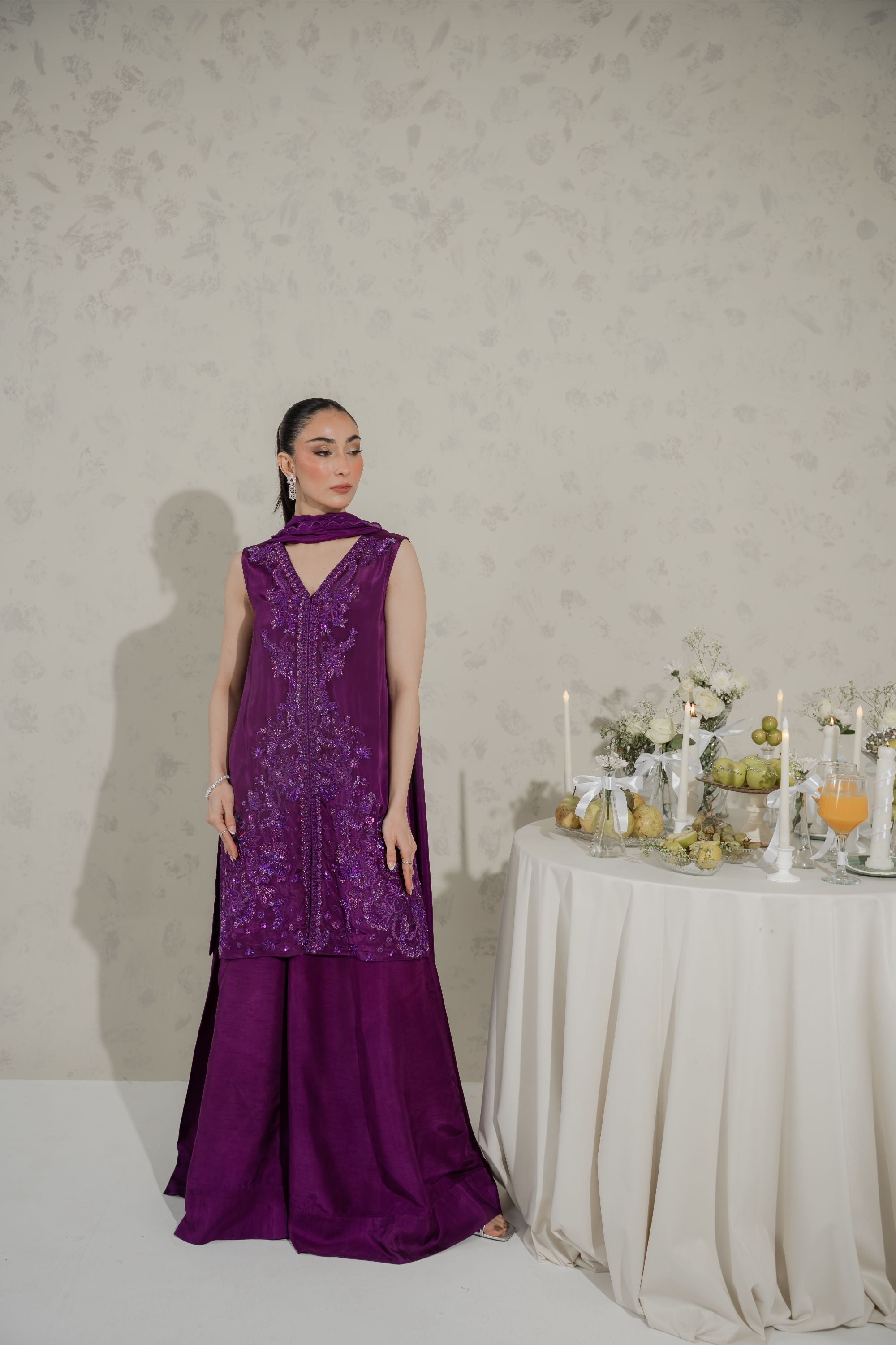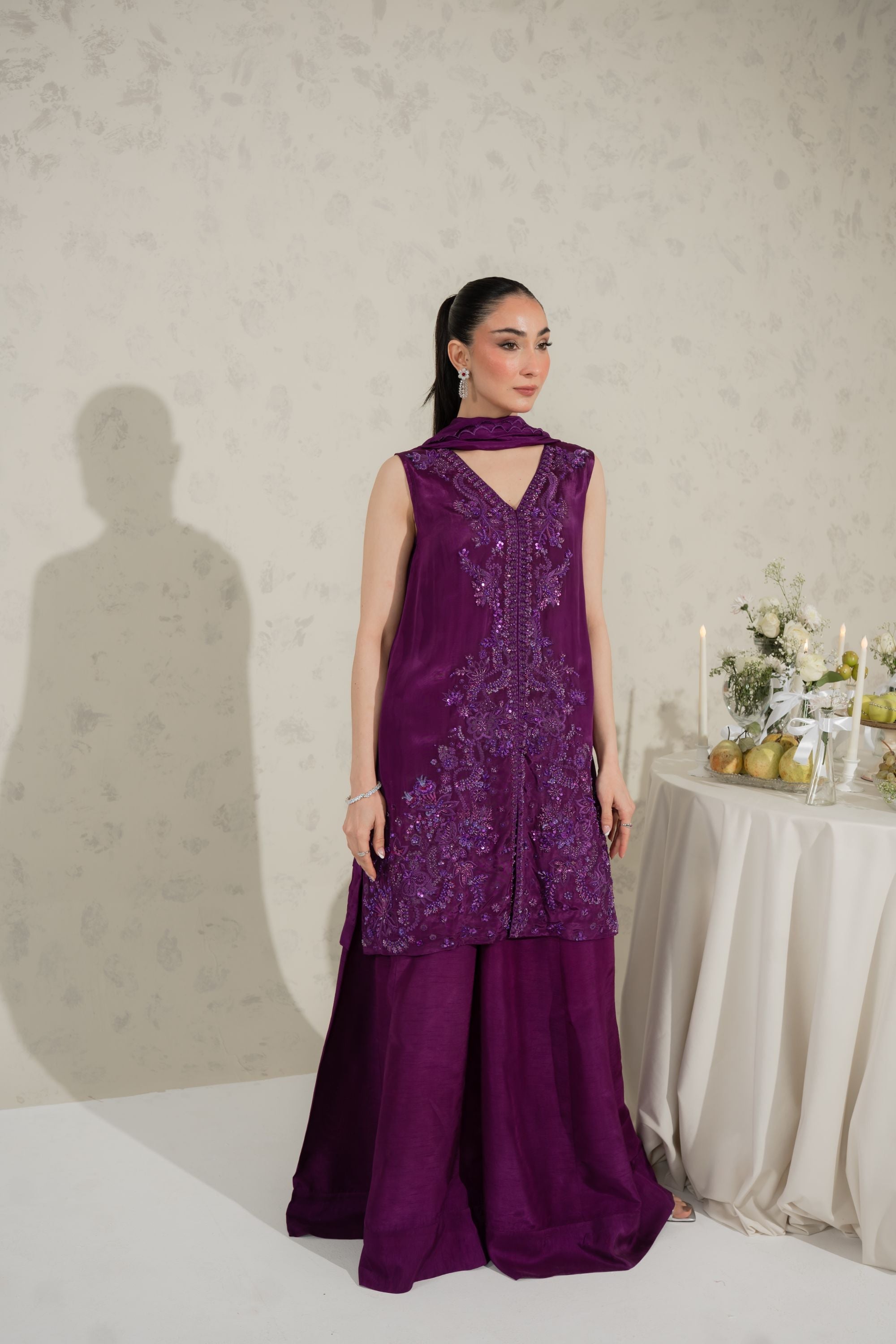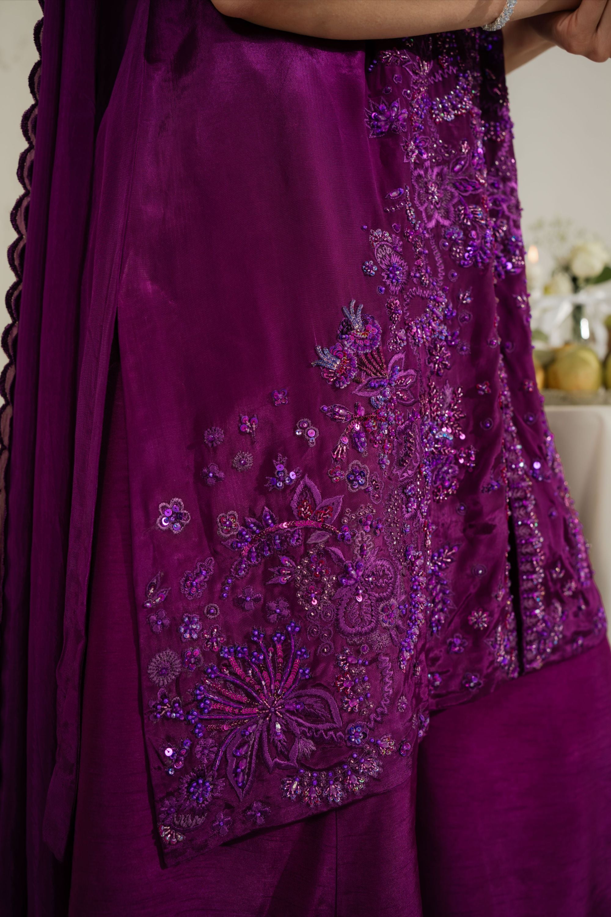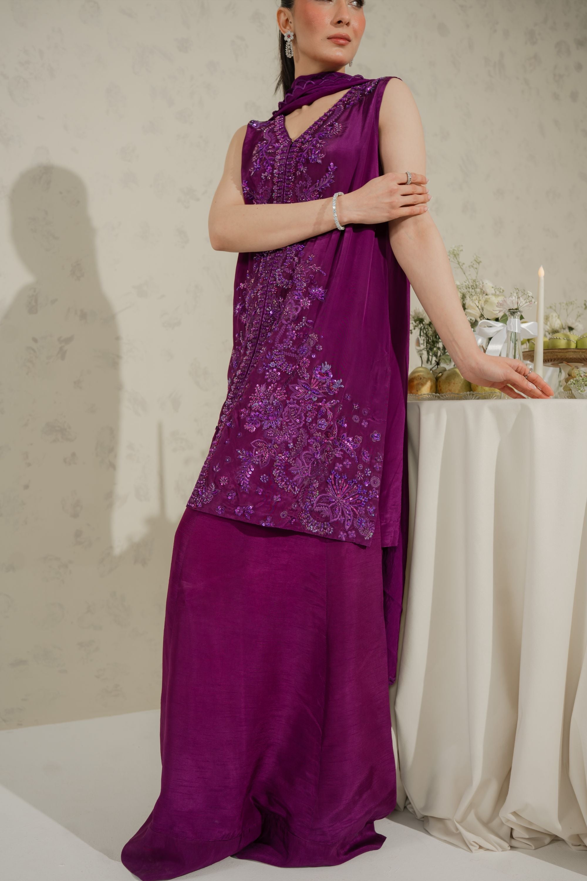 Understated yet utterly captivating — AMETHYST is a hand embroidered sheesha silk ensemble where monotone resham thread work weaves a rich, tonal tapestry across the entire shirt front. Highlighted with pearls, sequins, crystals, and katdana, the embellishment catches light with a refined, multi-dimensional shimmer that feels both luxurious and effortlessly elegant. Paired with a Korean raw silk azaar and a sumptuous medium silk dupatta, this is a masterclass in quiet, confident luxury.
