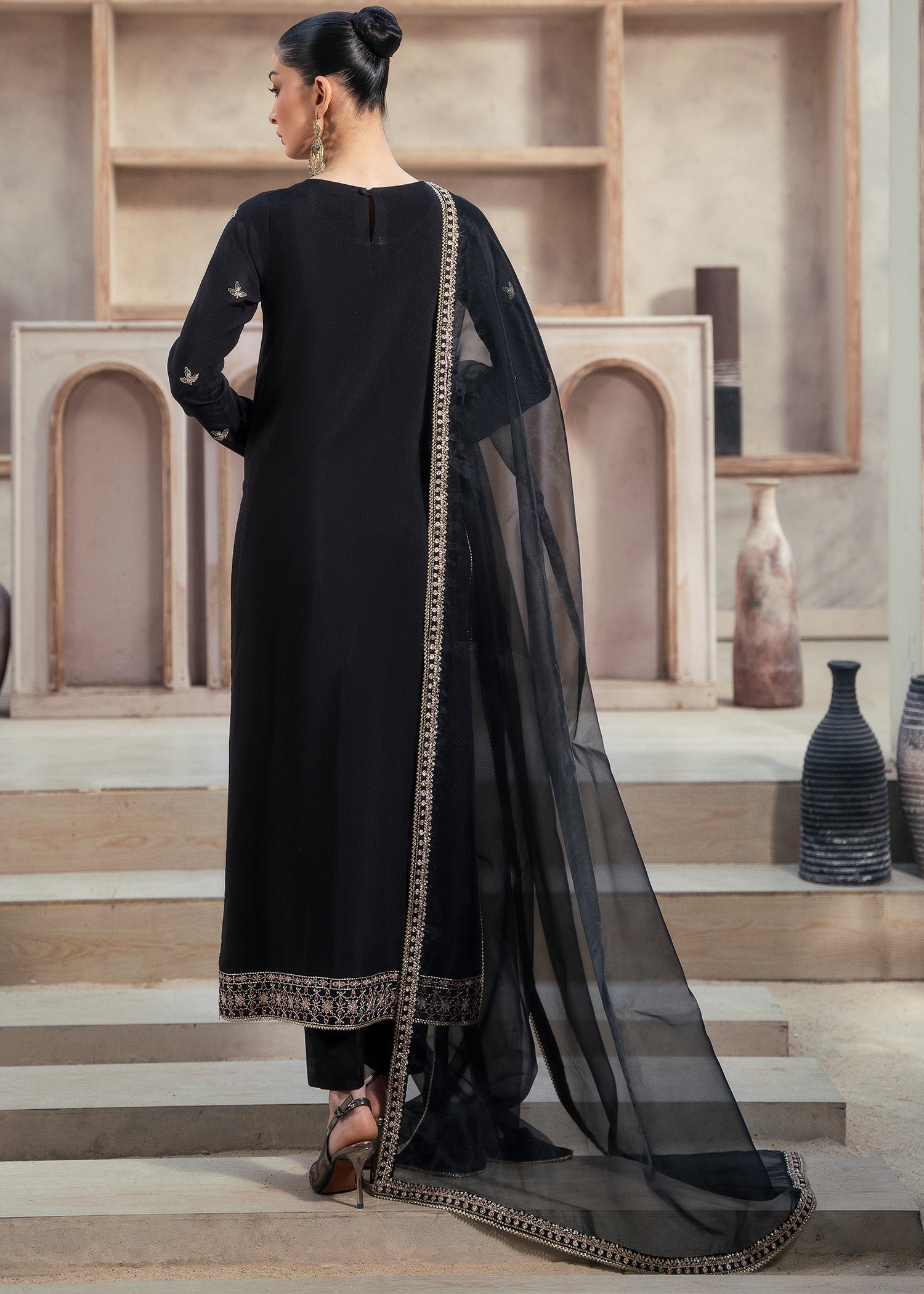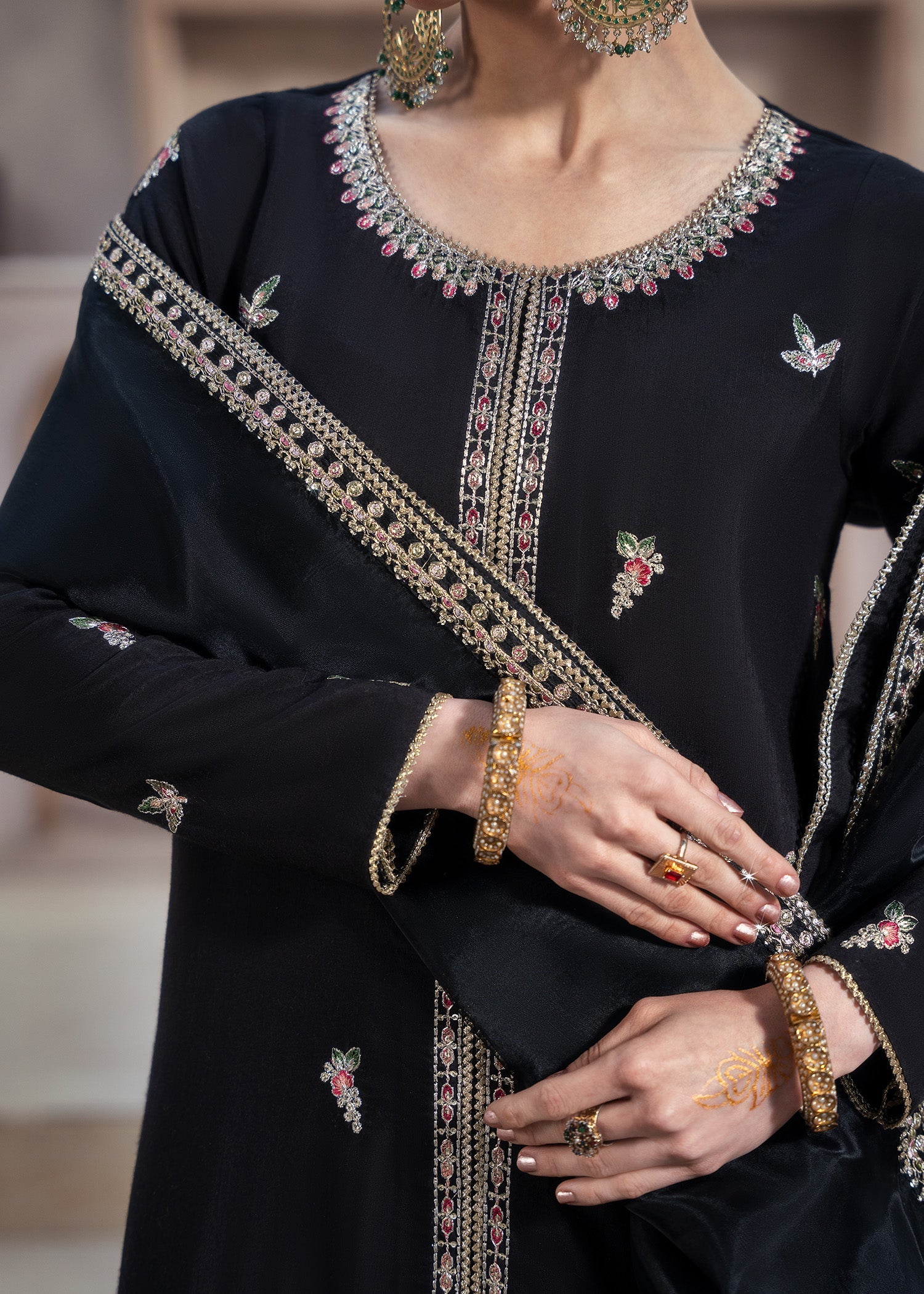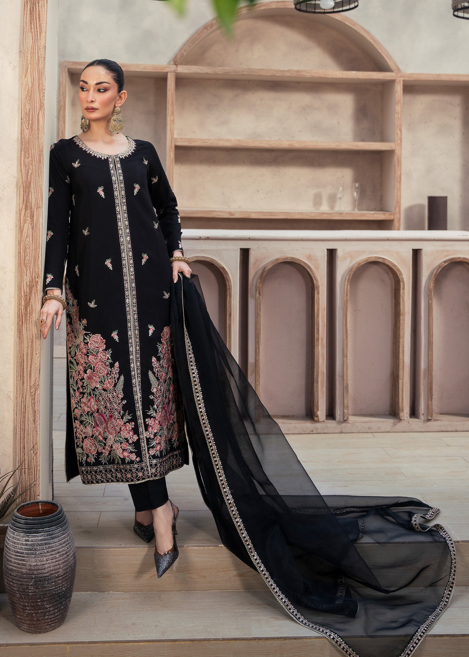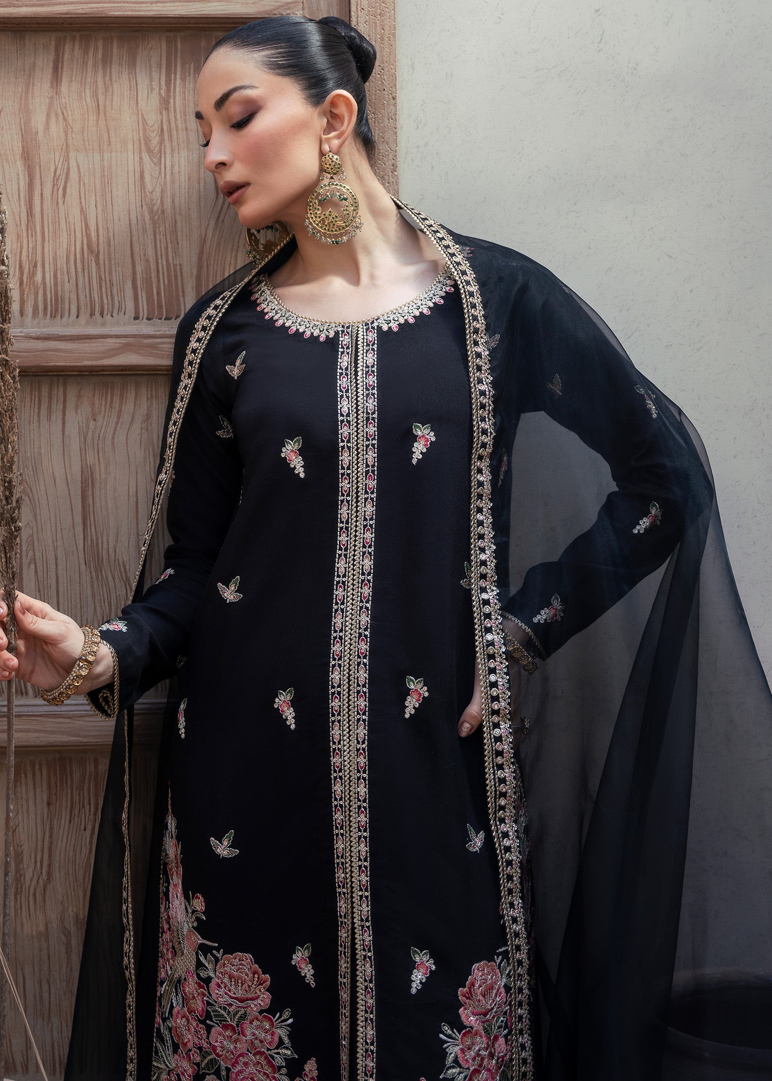 Festive celebrations, party wear, and special occasions where timeless black elegance meets embroidered sophistication.