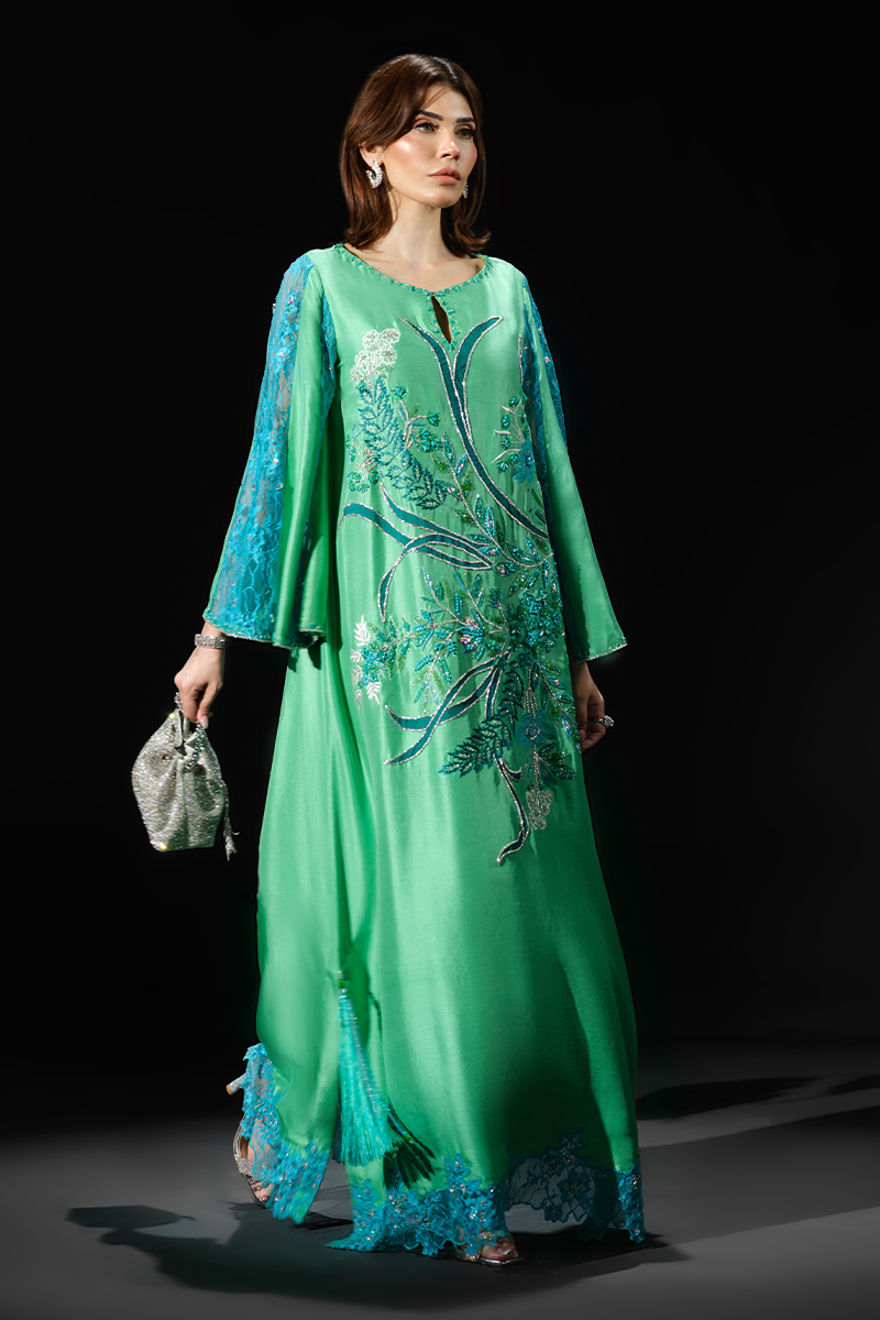 Featuring a stylish A-line silhouette, Aquamarine’s focal point is the hauntingly gorgeous motif on the front profile which culminates in a cluster of sparkles through hand applied sequins, beads and crystals around fine embroideries and appliqué details. To amplify its beautifully sculpted billowy sleeves, lightly embellished, delicate lace fabric insets have been used that add to the design’s ethereal charm. The hem is also masterfully outlined with hand embellished lace trims for a refined finishing touch. Undoubtedly a show-stopping dress that will flatter and delight!