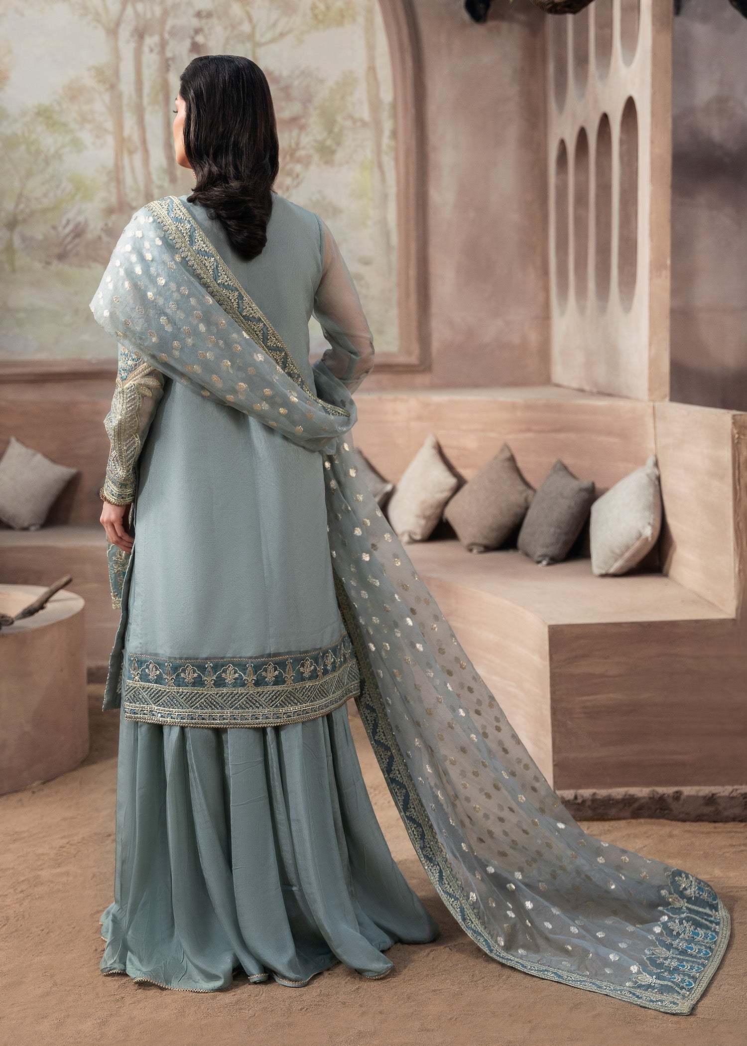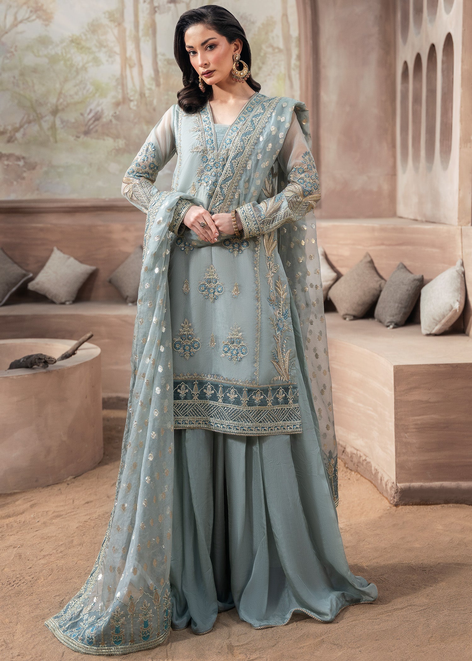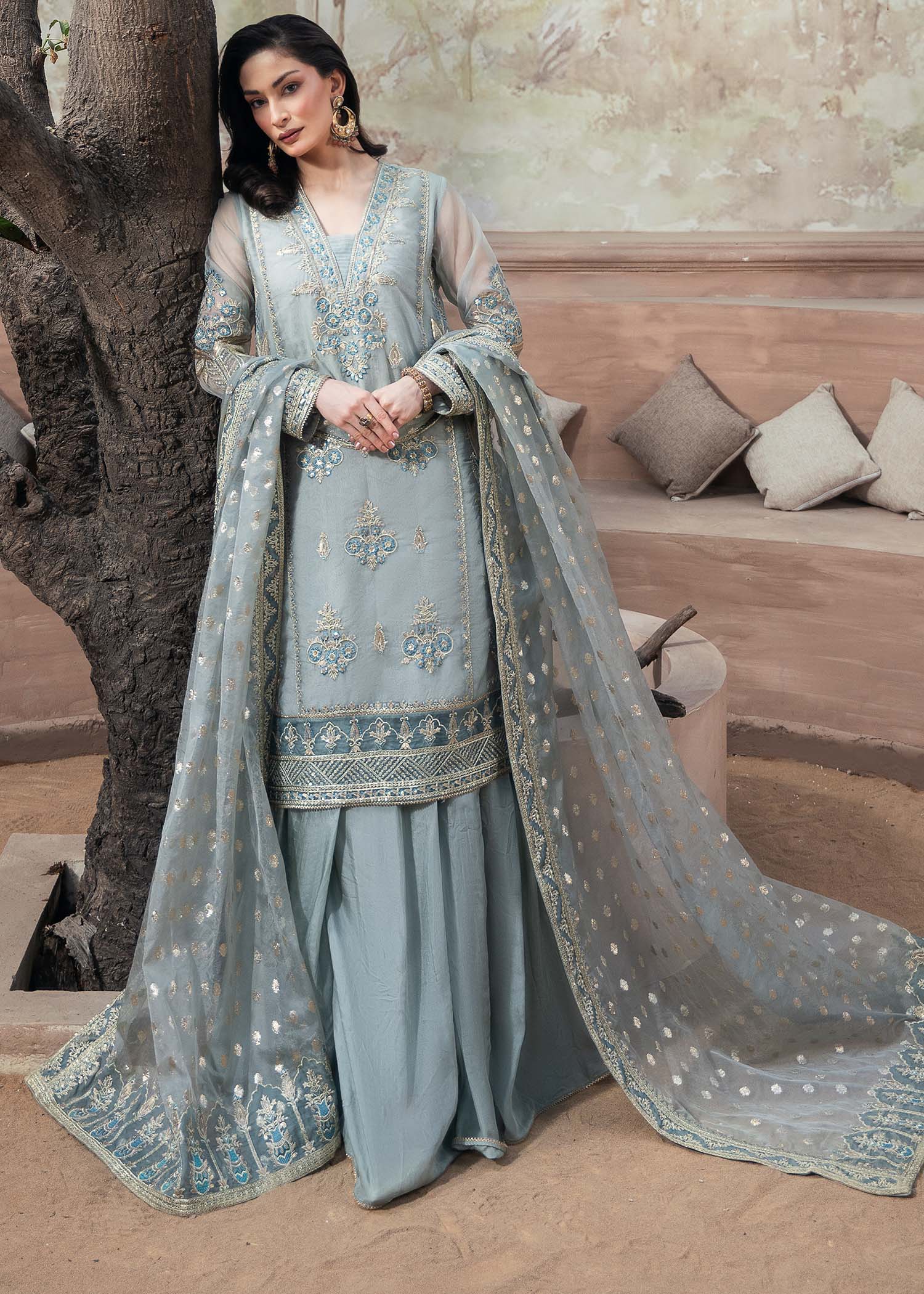 Draped in delicate organza, ARUSSA is where serene ice blue meets embroidered elegance — featuring kurti with intricate embroidery, paired with wide-leg raw silk sharara and zari organza dupatta for all-season graceful sophistication.