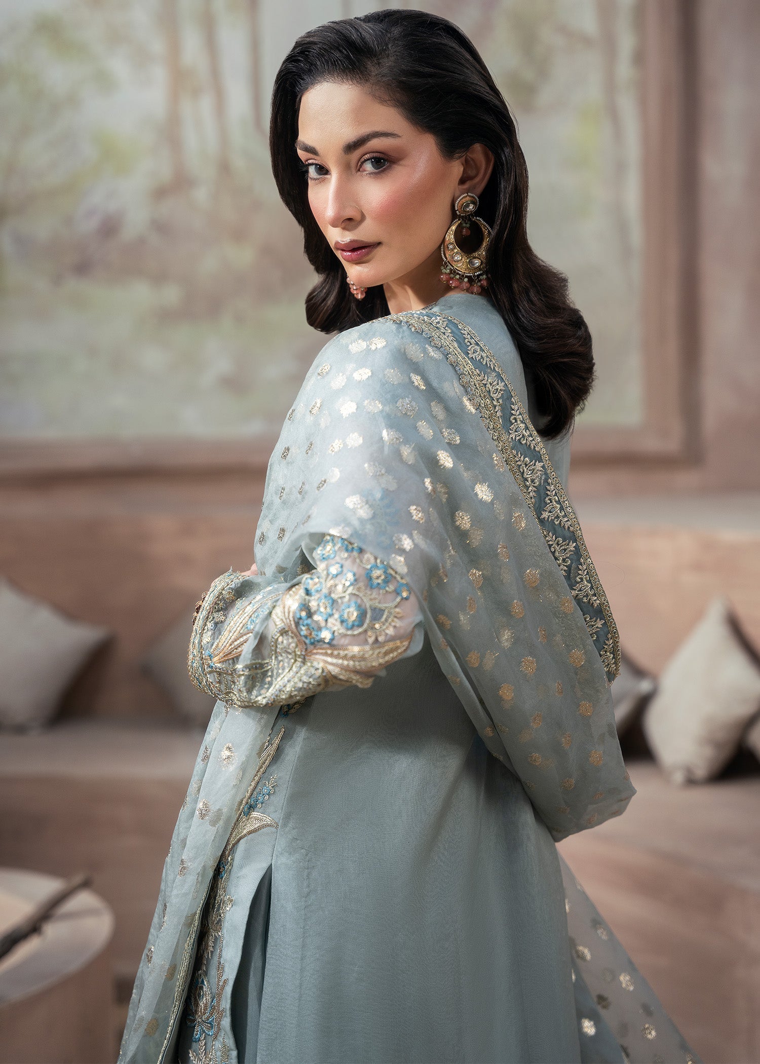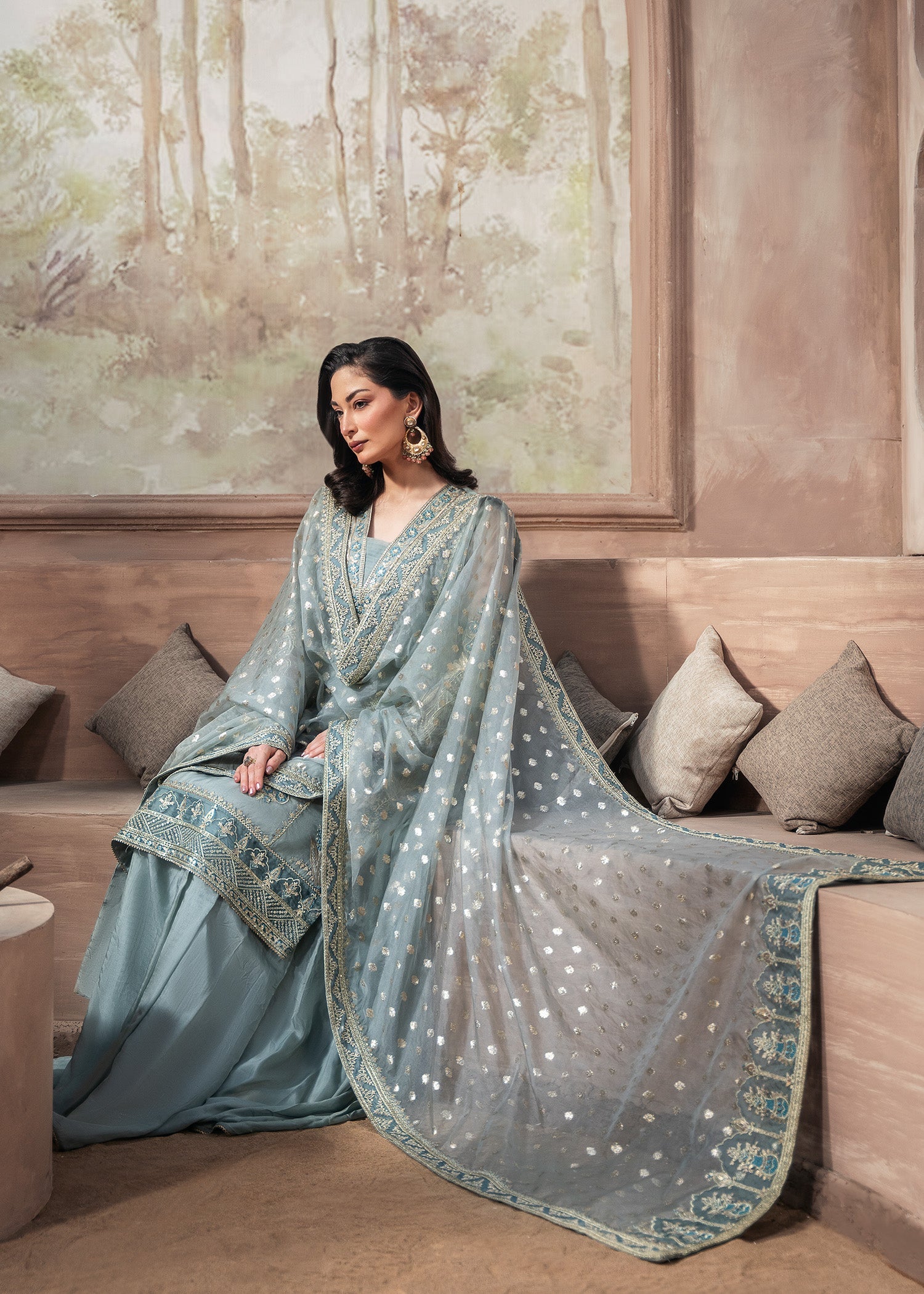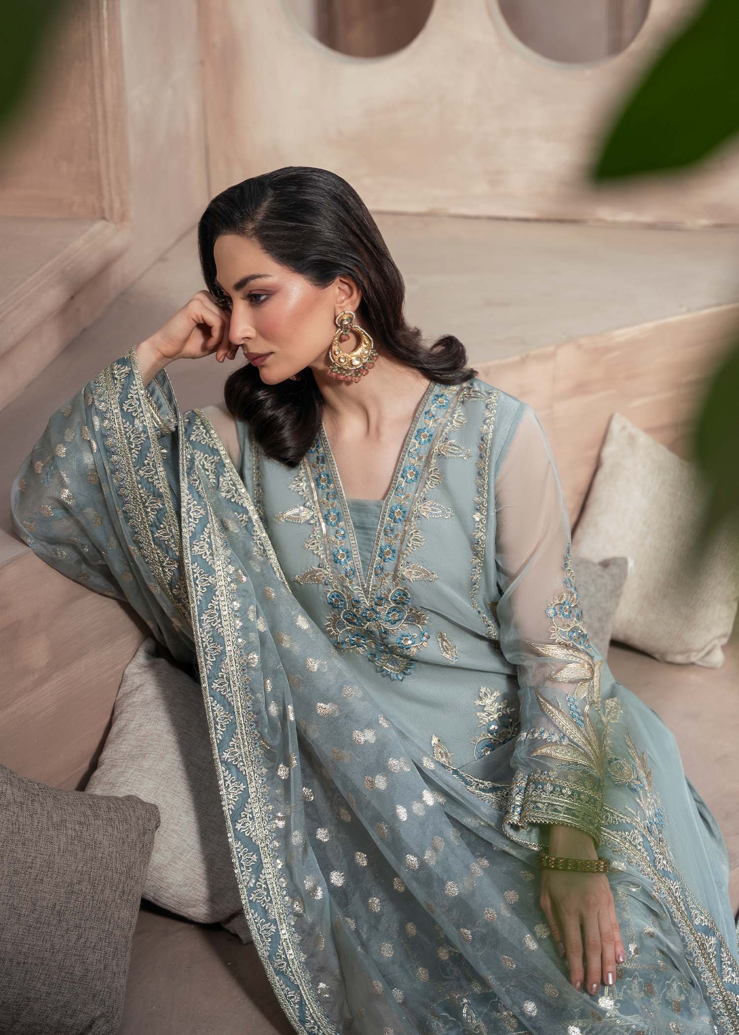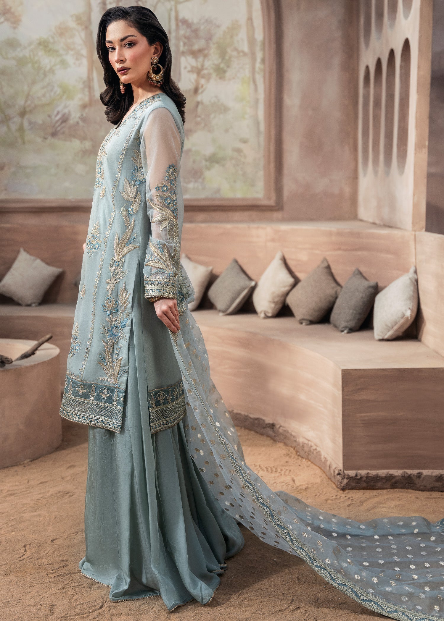 Draped in delicate organza, ARUSSA is where serene ice blue meets embroidered elegance — featuring kurti with intricate embroidery, paired with wide-leg raw silk sharara and zari organza dupatta for all-season graceful sophistication.