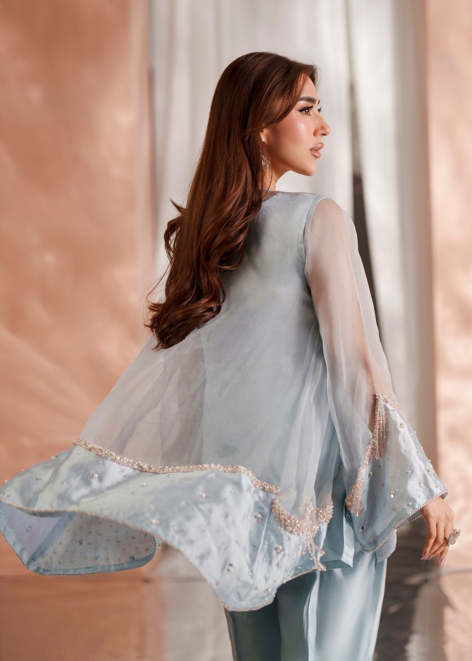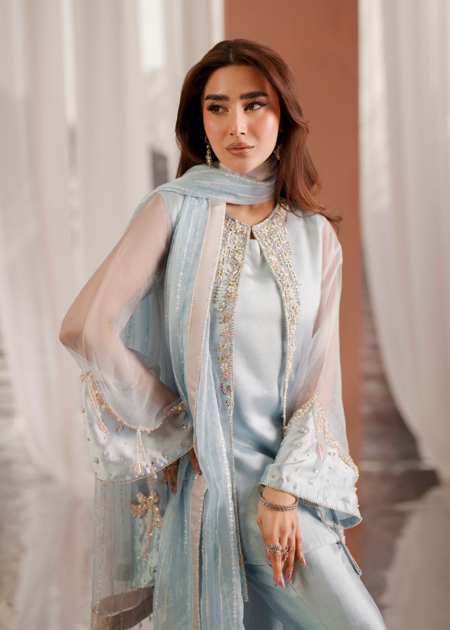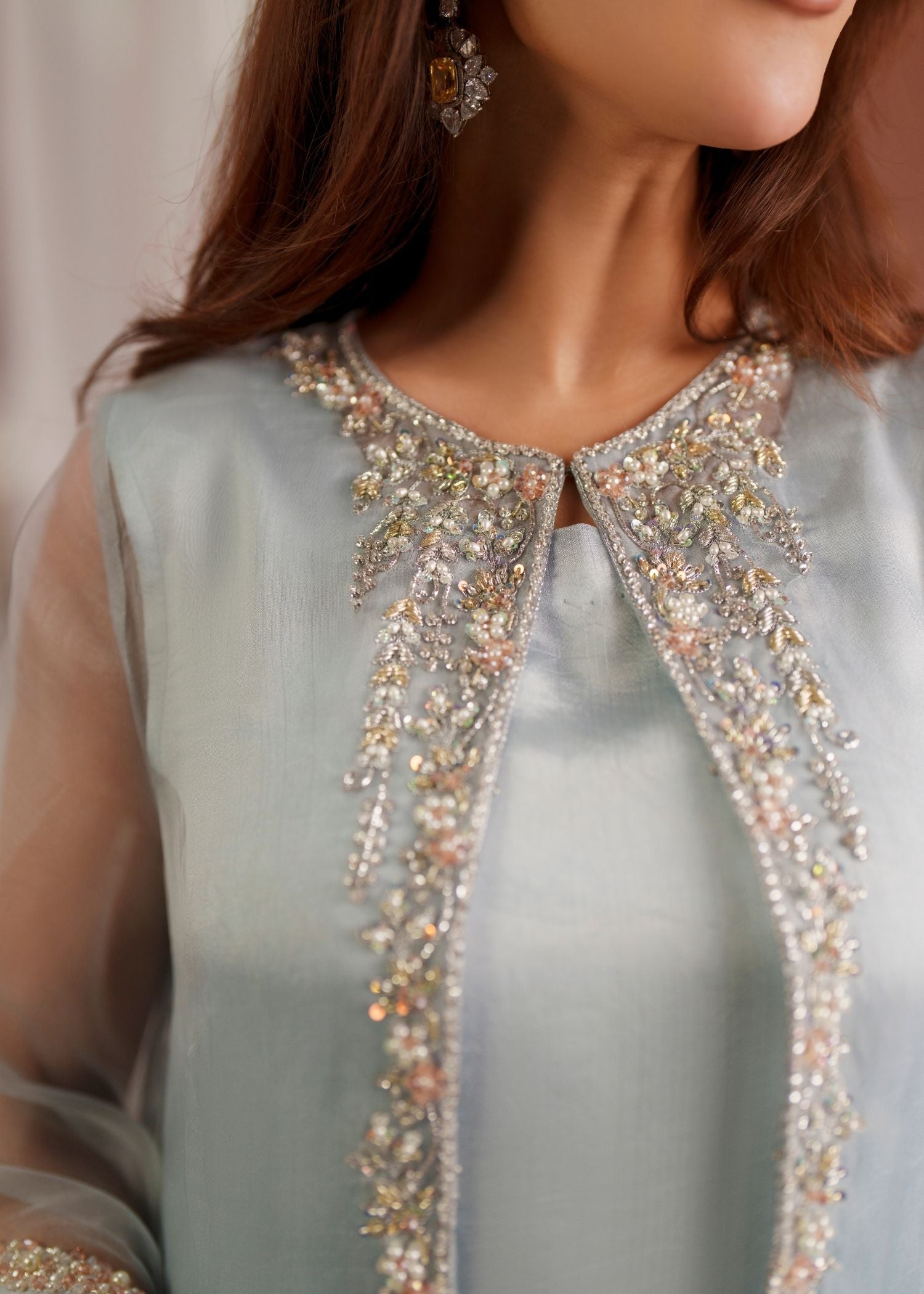 Draped in delicate organza, AURA is where heavy crystal work meets layered sophistication — featuring ice-blue short jacket with exquisite crystal embellishments over separate inner shirt, paired with flared sheesha silk trousers and embroidered organza dupatta for luxurious, multi-dimensional presence.