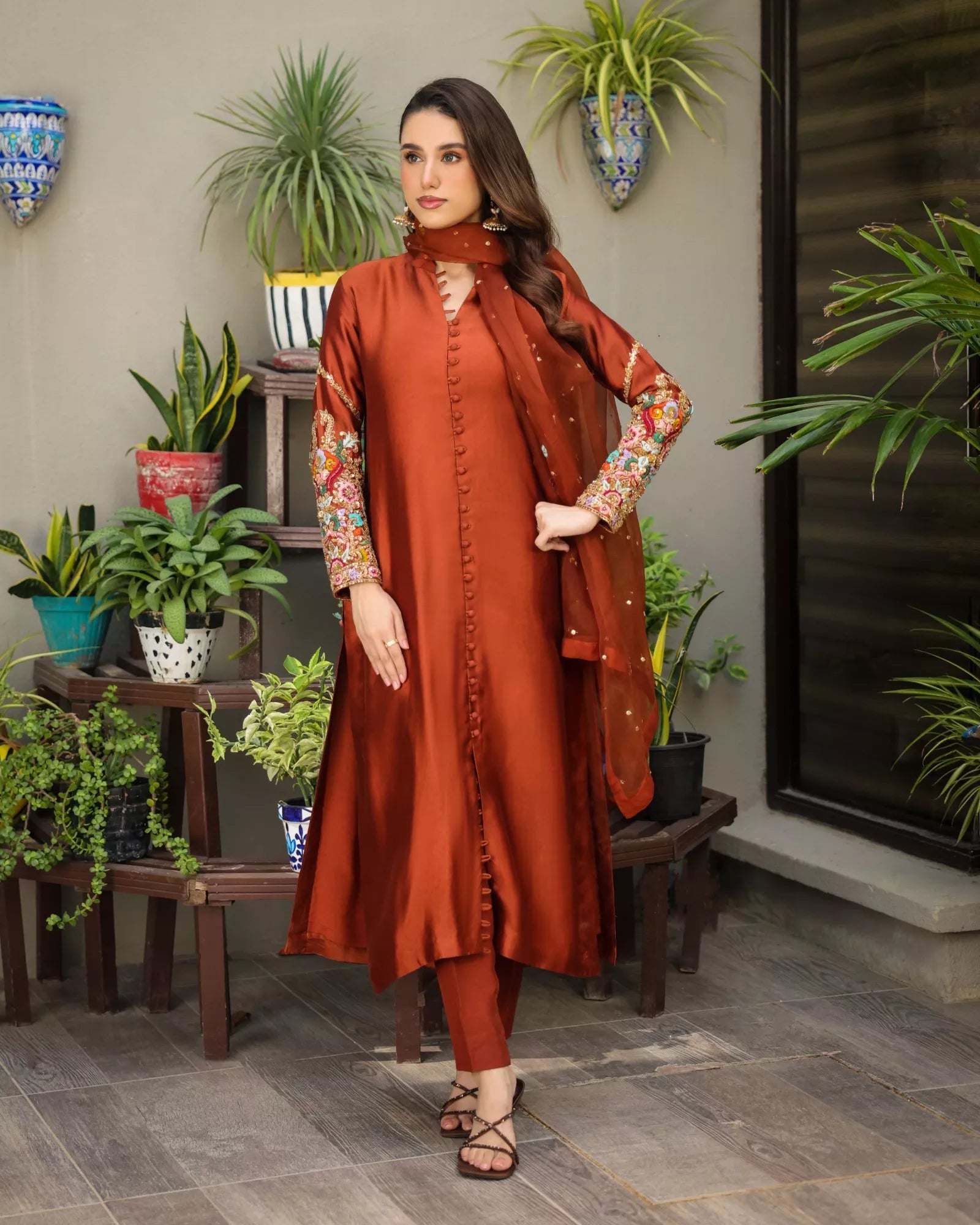 Ayira A timeless butter silk shirt (47") with looped buttons and a refined slit hem. Sleeves shimmer with handwork in kora, dabka, resham, cut dana, and sequins. Paired with Korean raw silk cigarette pants and a sheer organza dupatta with delicate sequin spray, Ayira embodies graceful modernity perfect for festive soirées and elegant evenings.