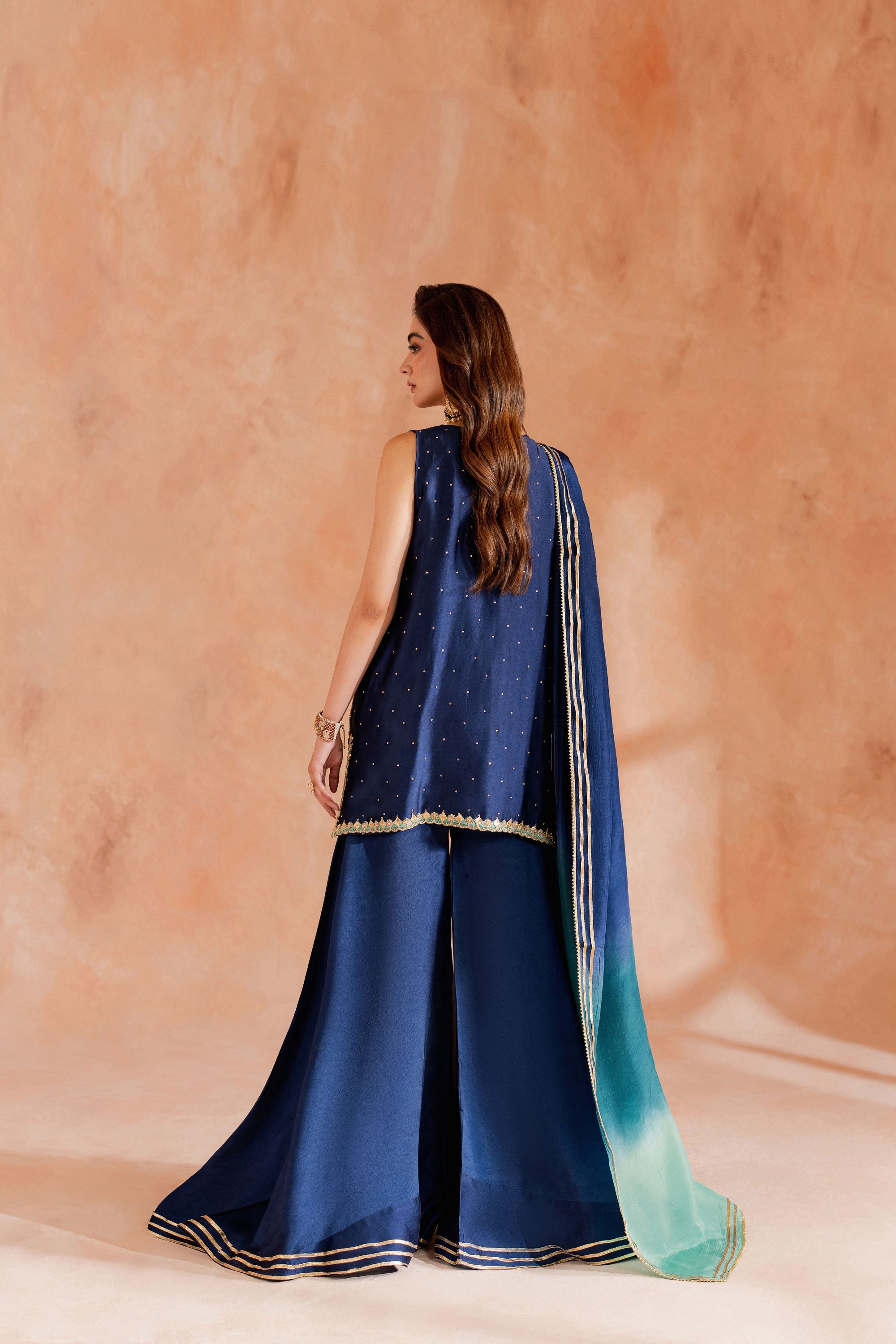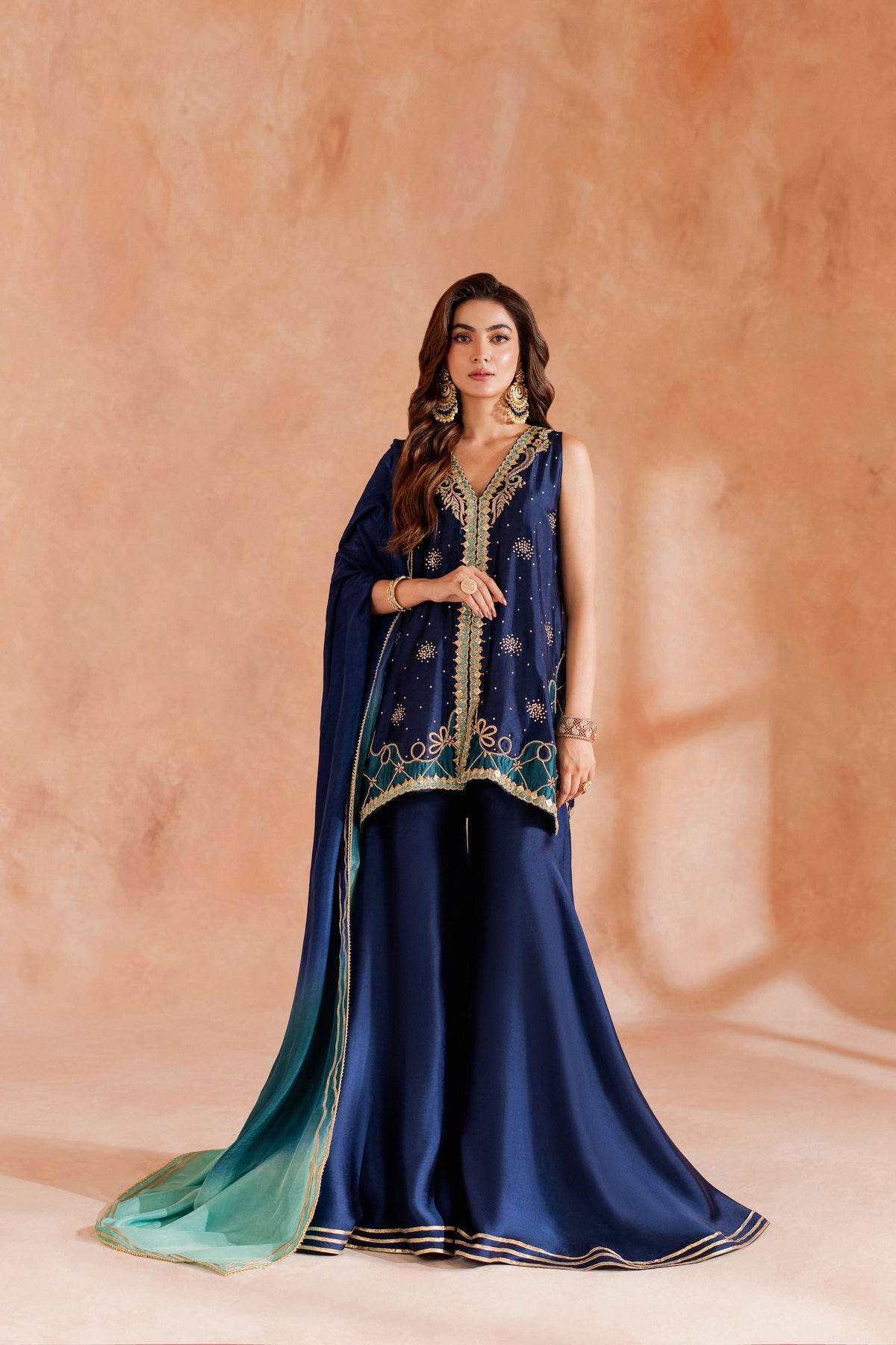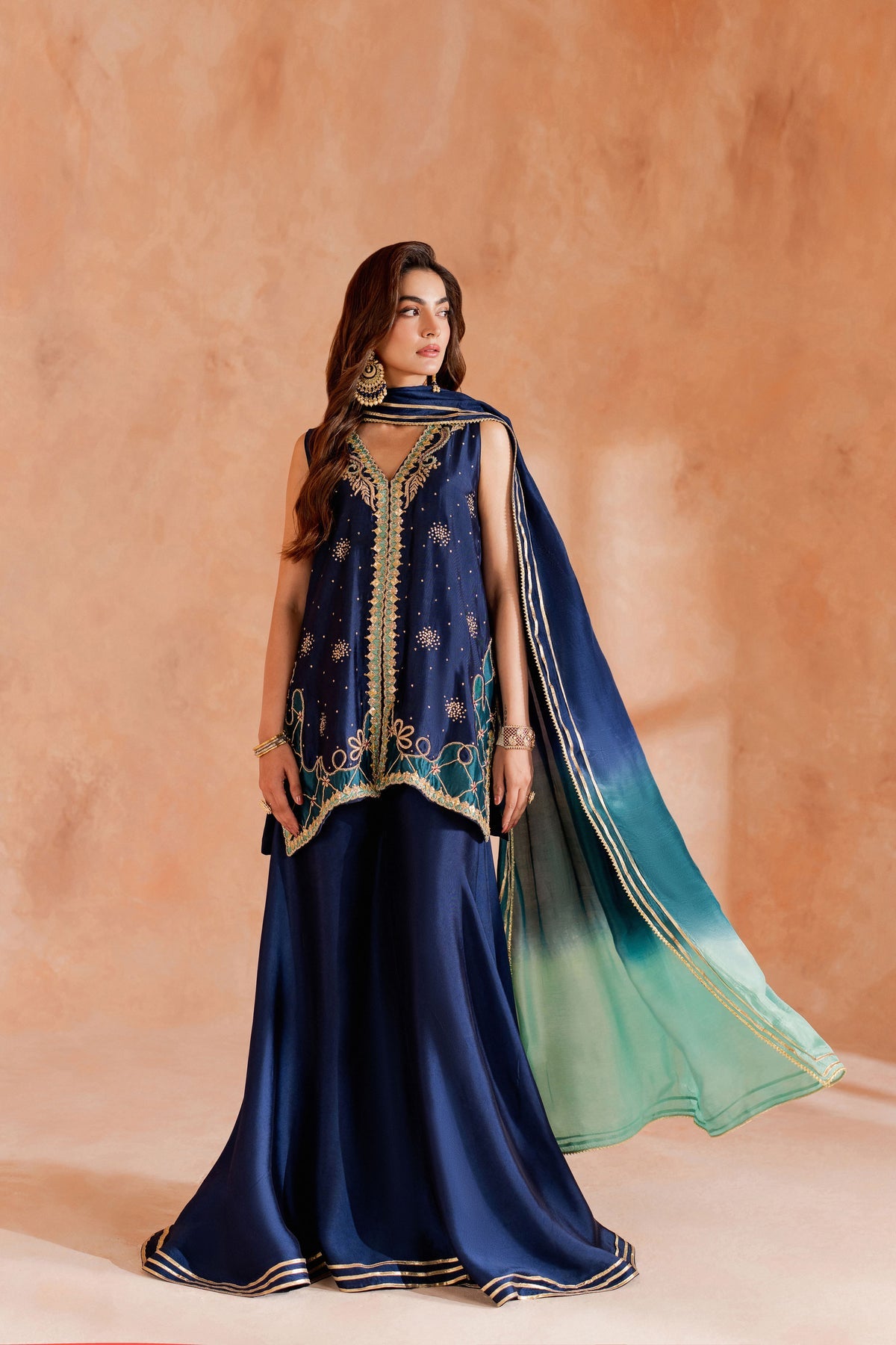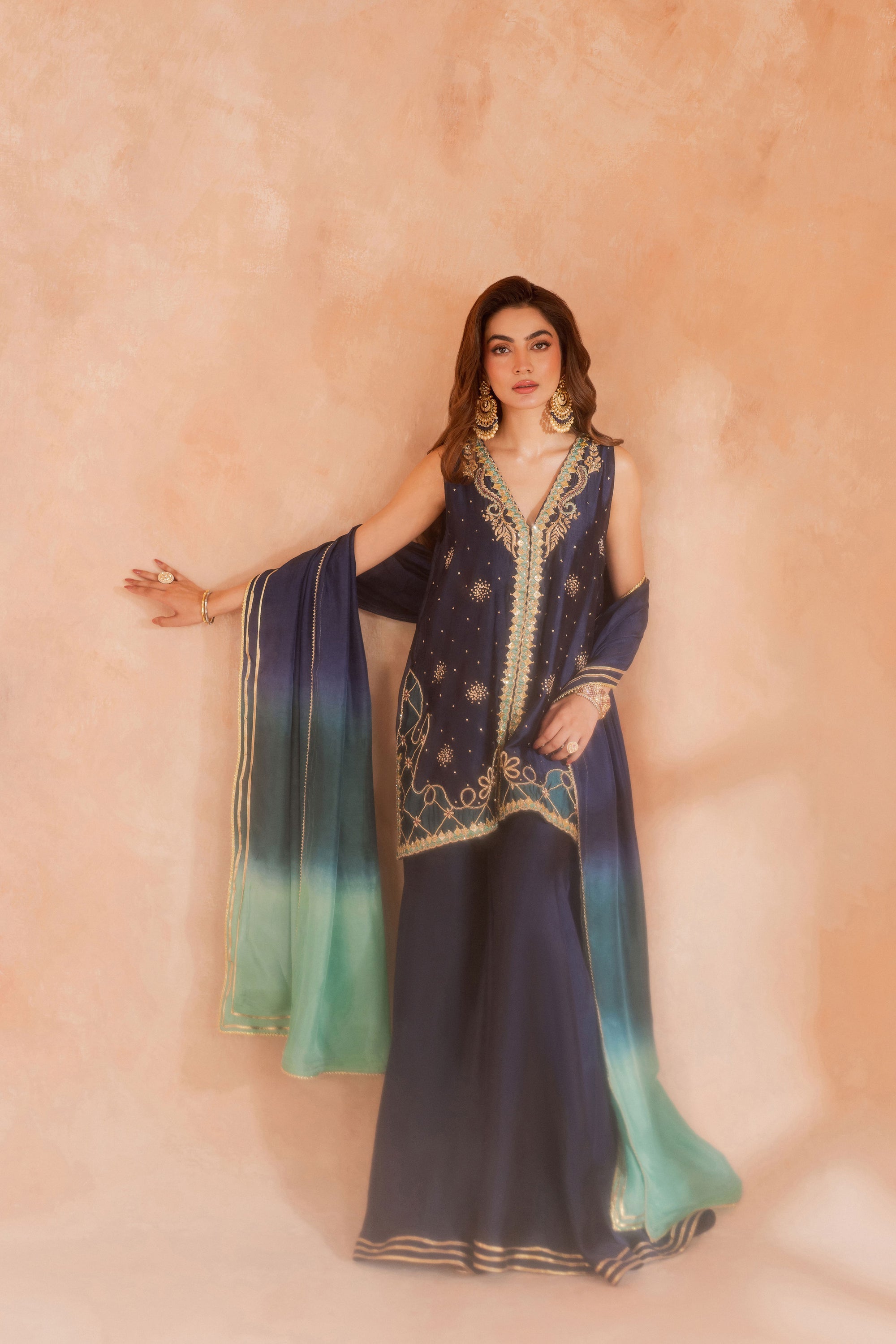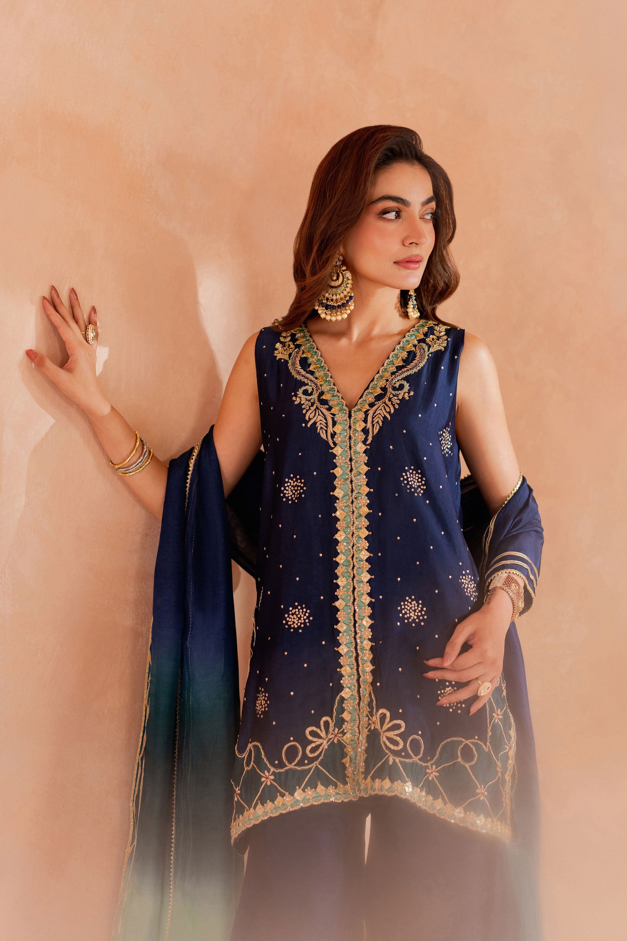 Draped in luxurious navy sheesha silk, AYLA is where handworked artistry meets festive sparkle — a short shirt with three-tone patchwork embroidery and golden embellishments for Mehndis and Dholkis.