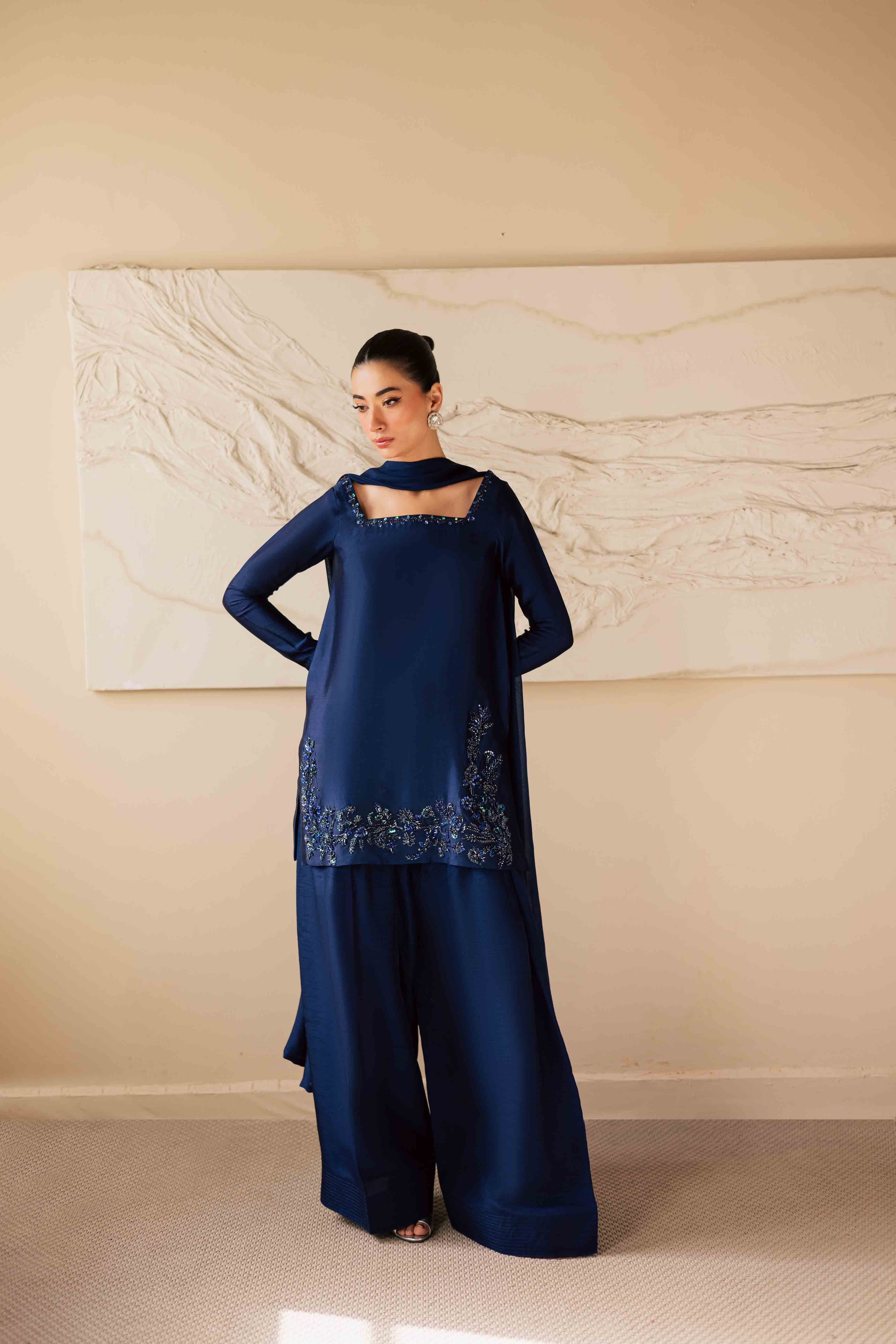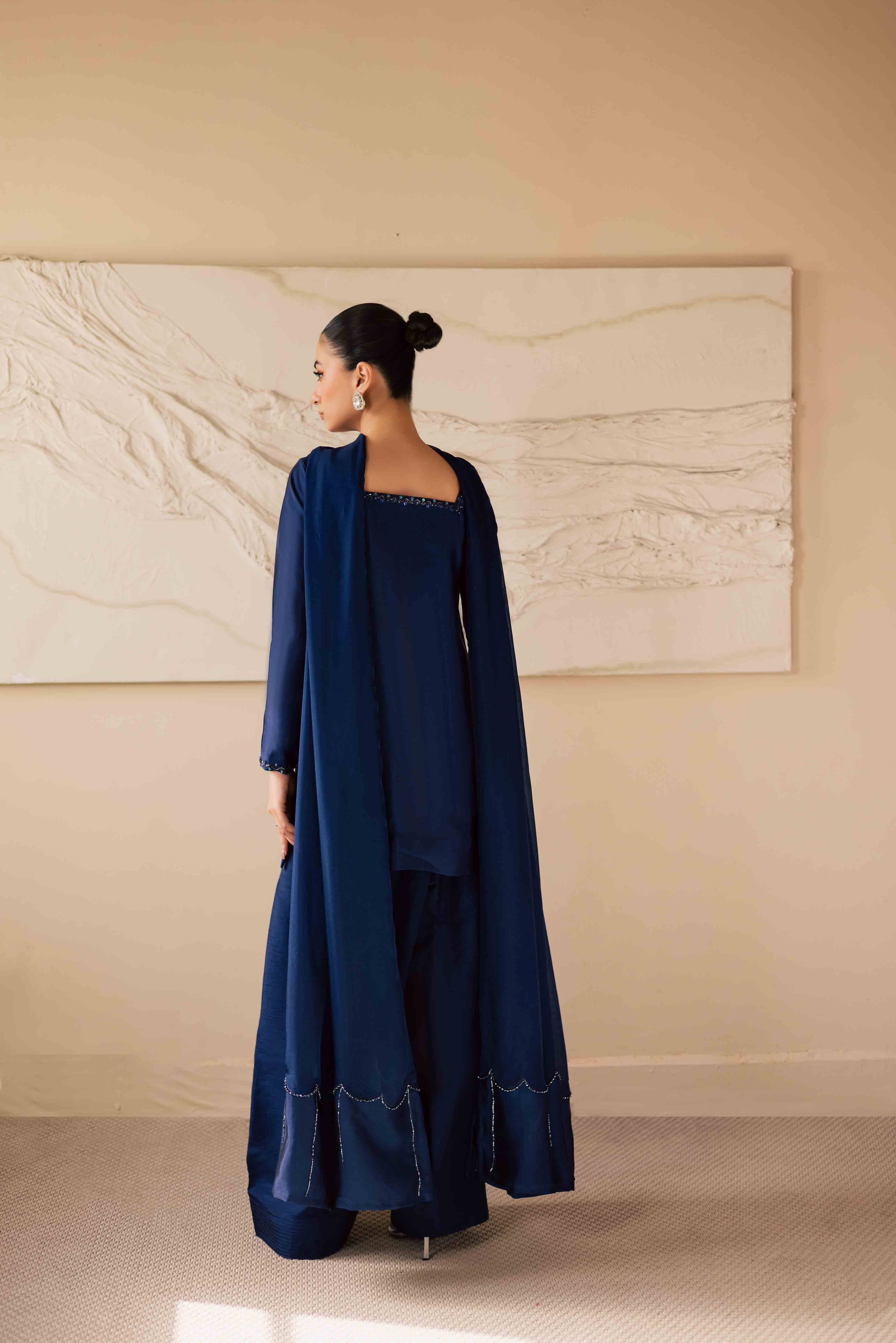 Draped in pure sheesha silk, AZURE is where heavy embellishment meets regal sophistication — featuring heavily embellished border with crystals and sequins, square neckline adorned on both front and back, paired with farshi shalwar and silk dupatta with embellished borders on both sides for luxurious, statement-making presence.