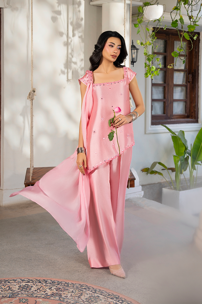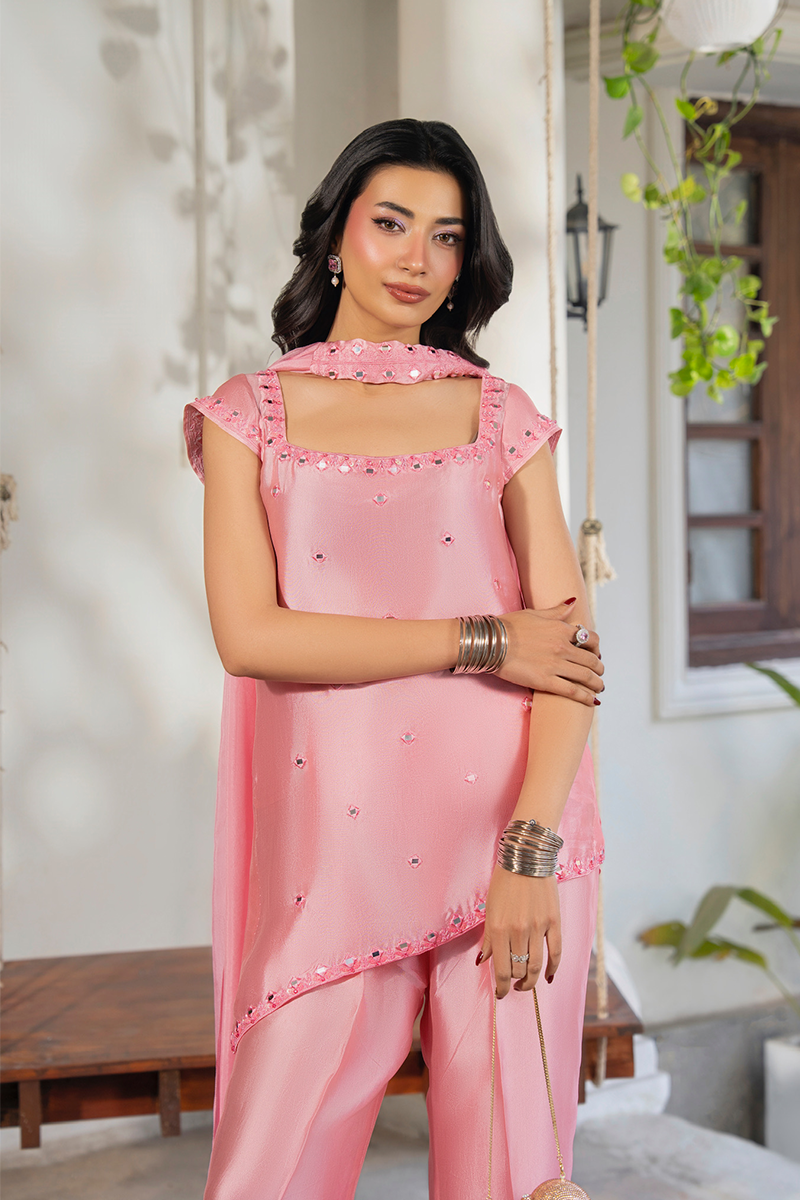 Delicate in name, dramatic in presence — BLUSH is a breathtaking 3-piece pure sheesha silk ensemble featuring a refined silk shirt, statement flared bell-bottom pants, and a flowing medium silk dupatta that together create an unforgettable silhouette.