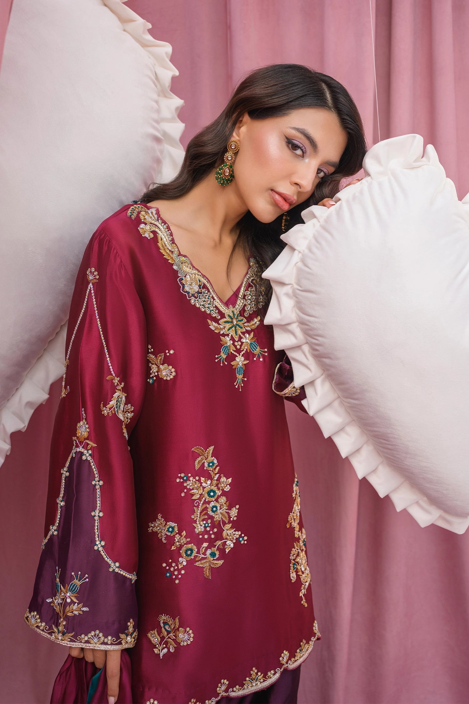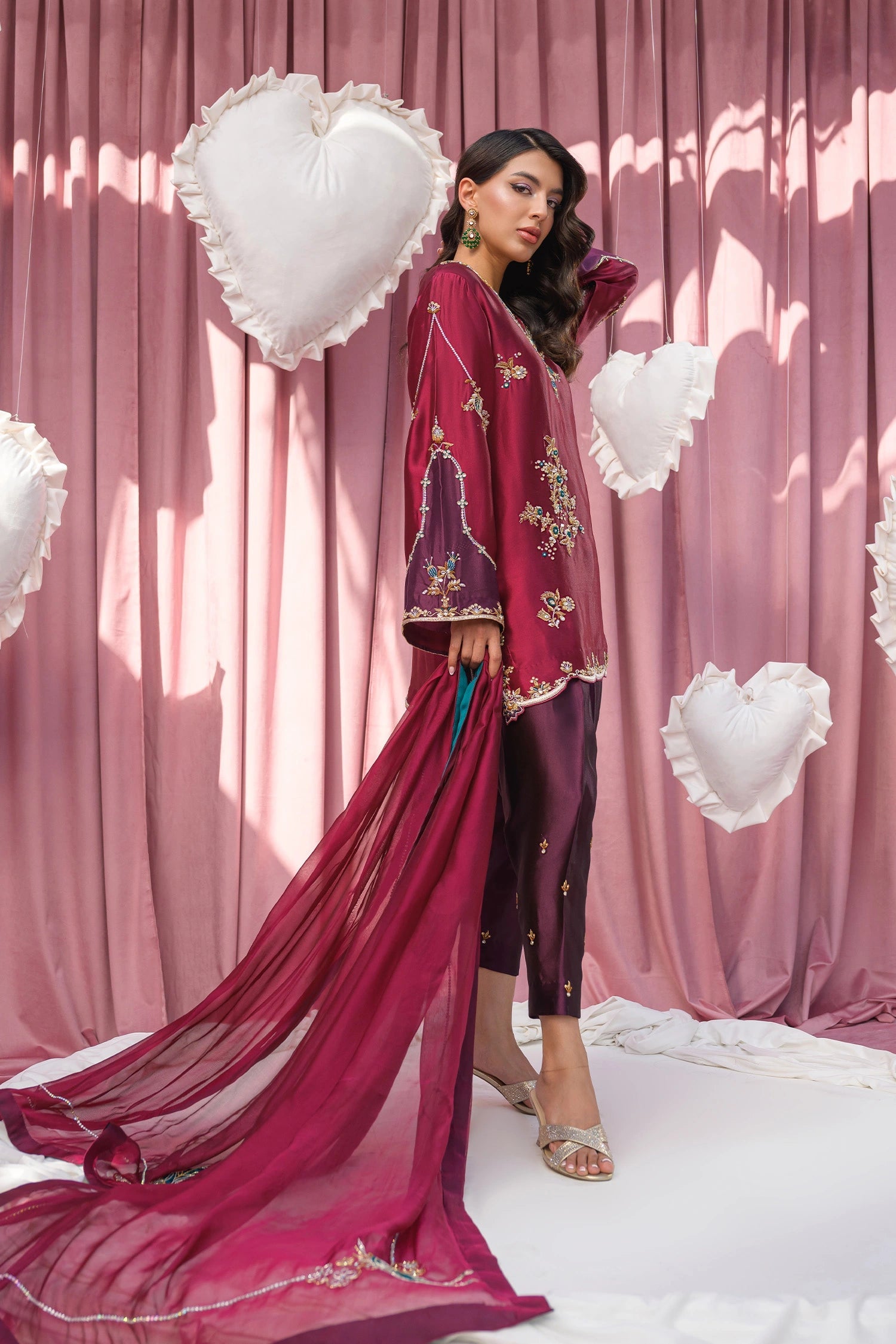 Draped in luxurious fabric, BURGUNDY is where rich burgundy tones meet refined sophistication — featuring beautifully tailored shirt with embroidered dupatta and matching trousers for regal formal elegance.