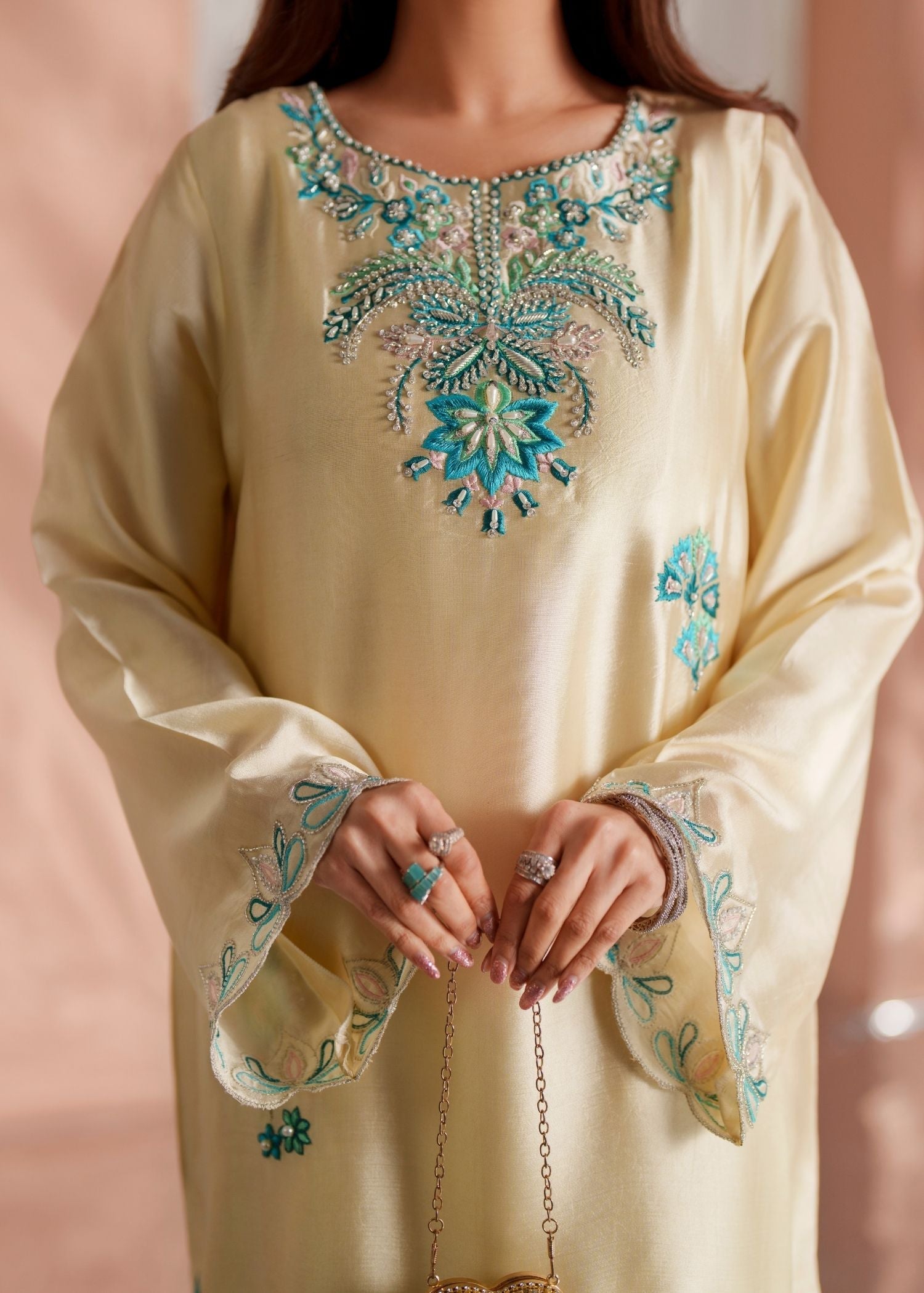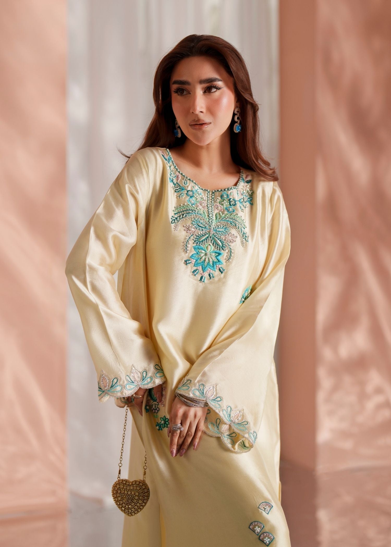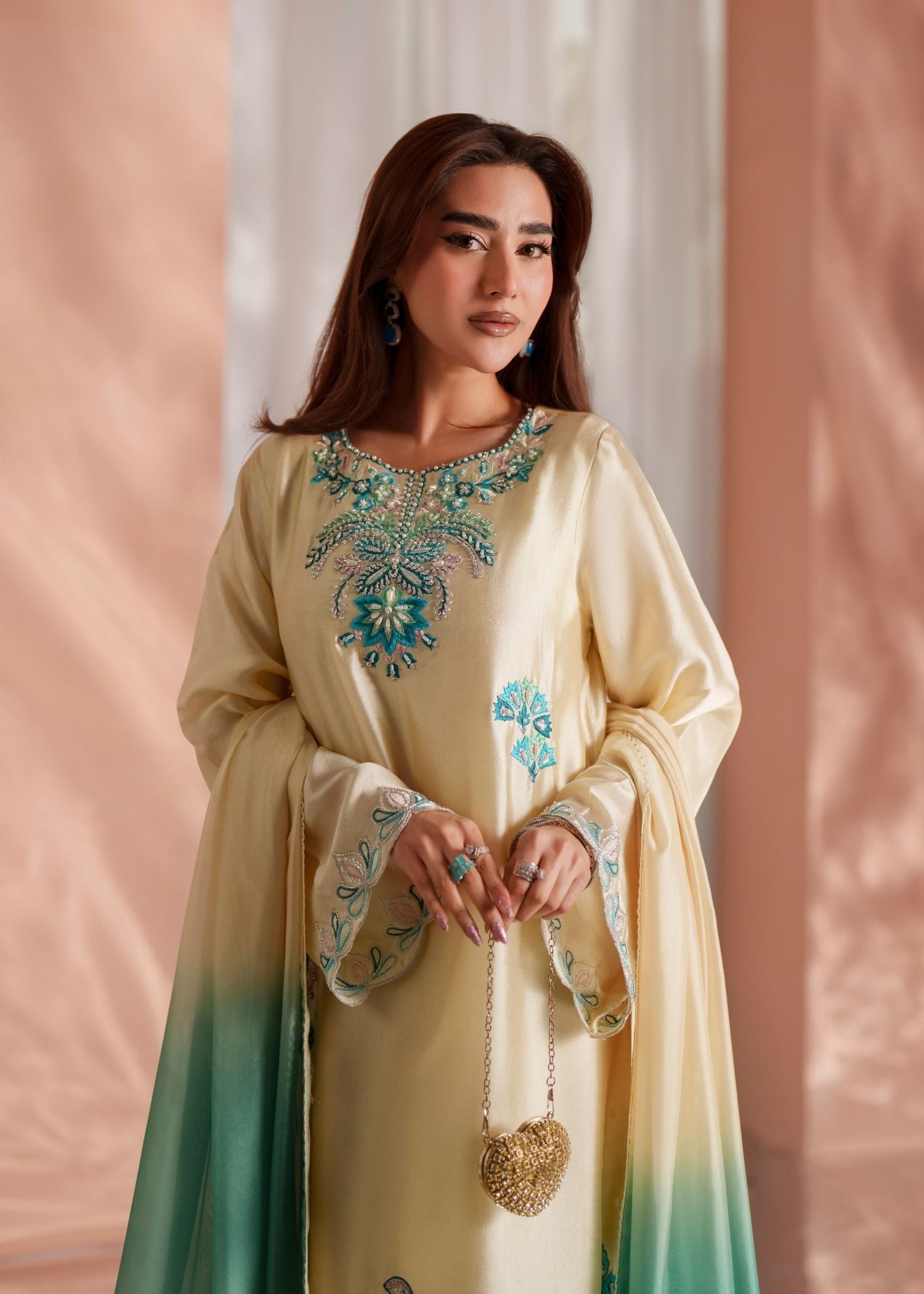 Draped in pure sheesha silk, CELESTE is where exquisite handwork meets effortless elegance — featuring long kaftan shirt in butter yellow with heavy hand-embellished and hand-embroidered detailing, paired with raw silk trouser and silk gradient dupatta for sophisticated, luxurious presence.