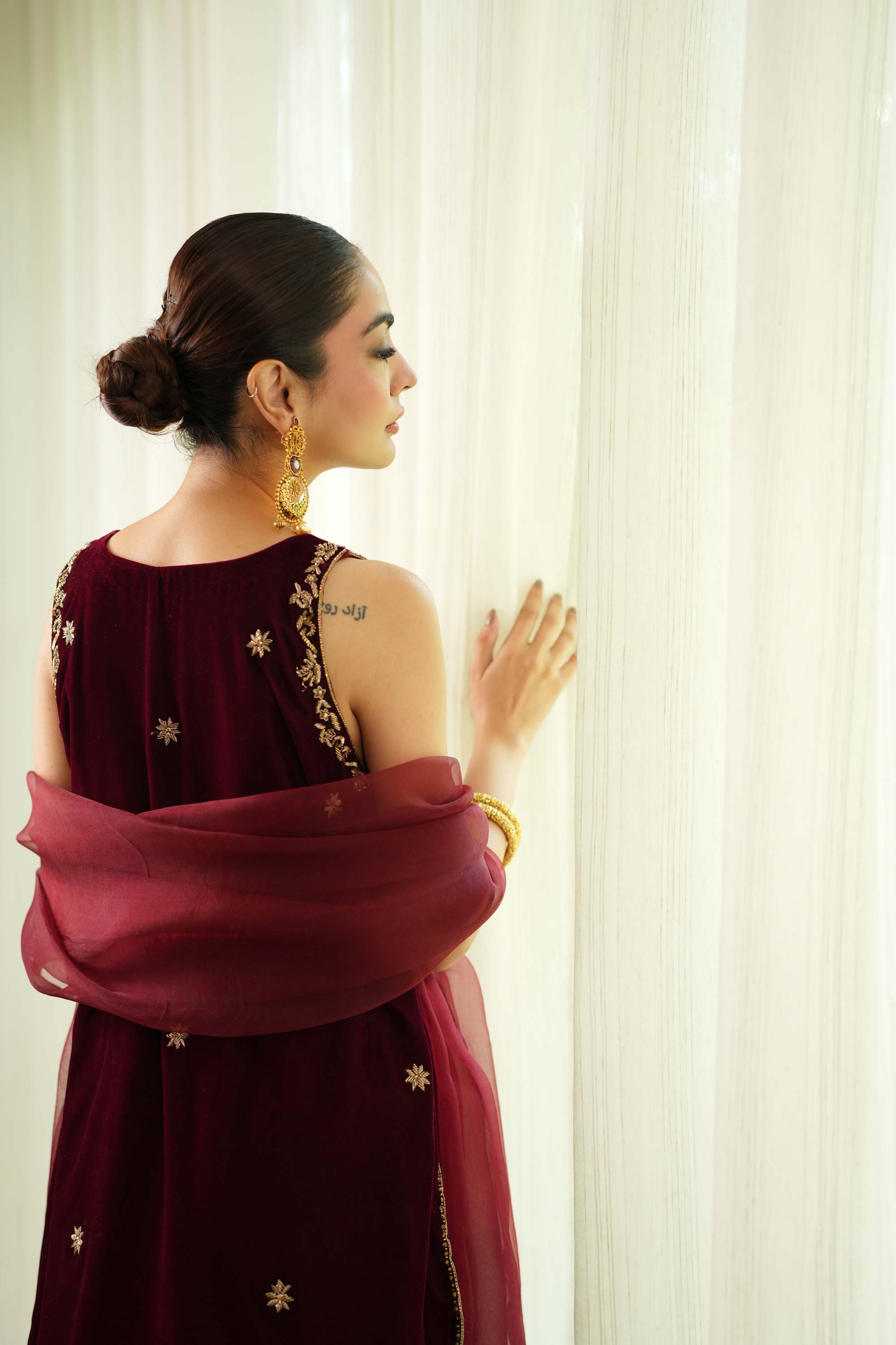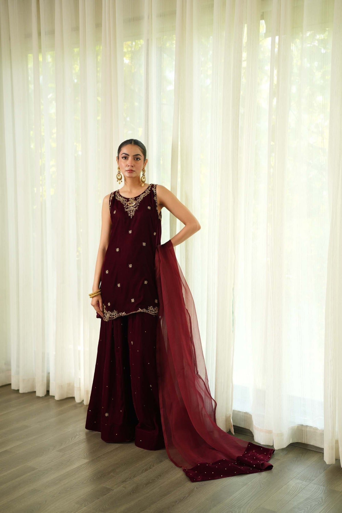 This ensemble in deep maroon velvet embodies regal elegance with a sleeveless hand worked shirt adorned in delicate gold embroidery. Paired with flared velvet pants and a pure organza dupatta, it strikes a graceful balance between tradition and modernity, exuding understated luxury in every detail.