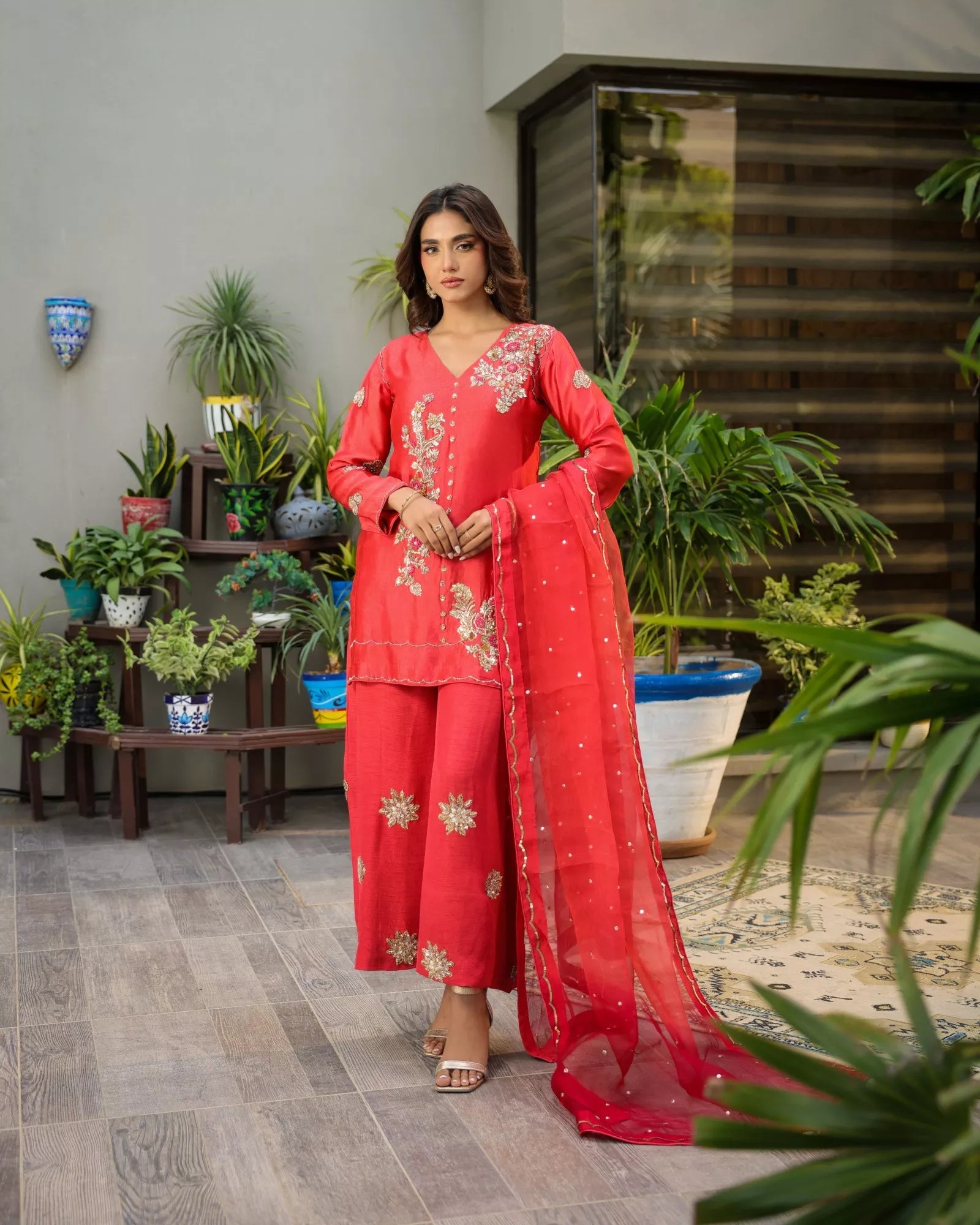 Dilara – A short-style butter silk shirt (32") radiating sophistication with hand embellishments in kora, dabka, gota, resham, cut dana, and sequins. Paired with Korean raw silk culottes featuring delicate motifs and a two-toned pure organza dupatta edged with sequins on all four sides, Dilara is the perfect balance of elegance and festive flair.