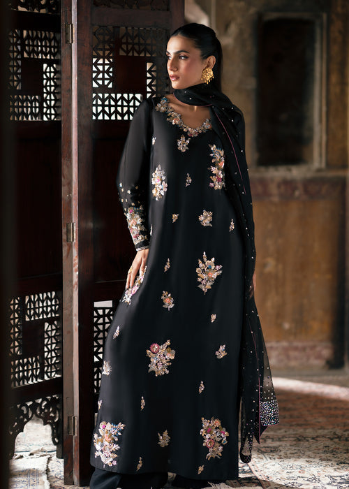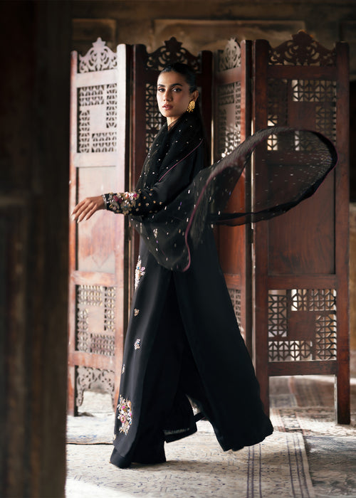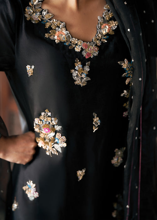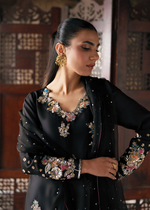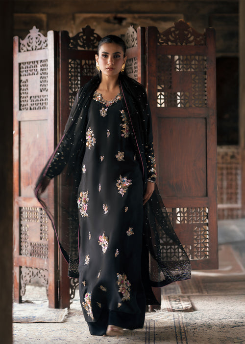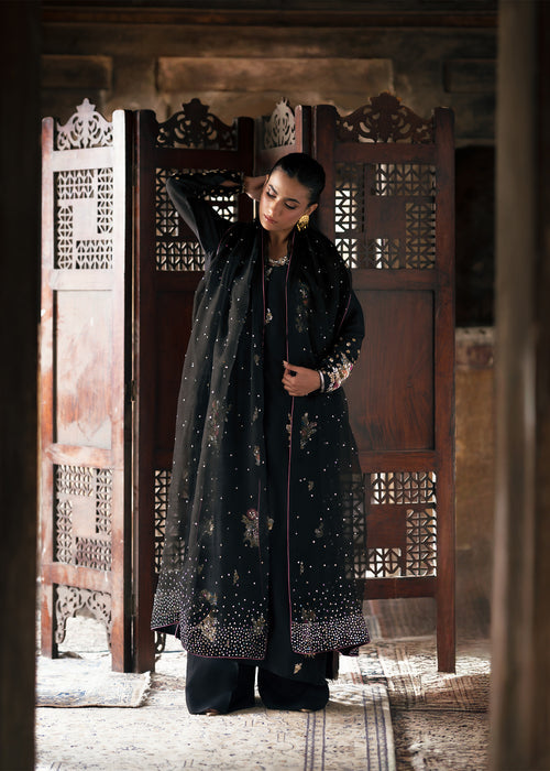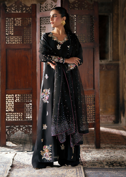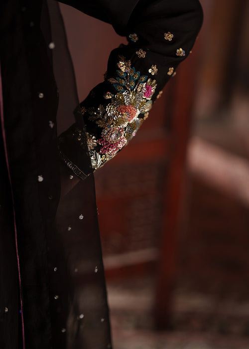 Embrace timeless sophistication in ECLIPSE, where luxurious tissue silk meets impeccable tailoring — featuring a beautifully crafted ensemble paired with Korean raw silk trousers and sheer kataan organza dupatta for effortless elegance.