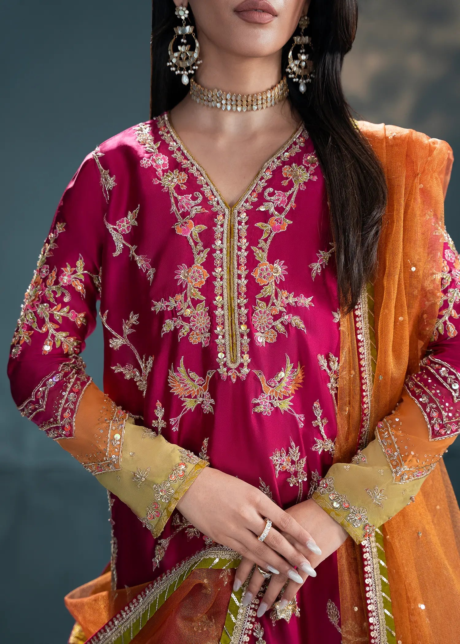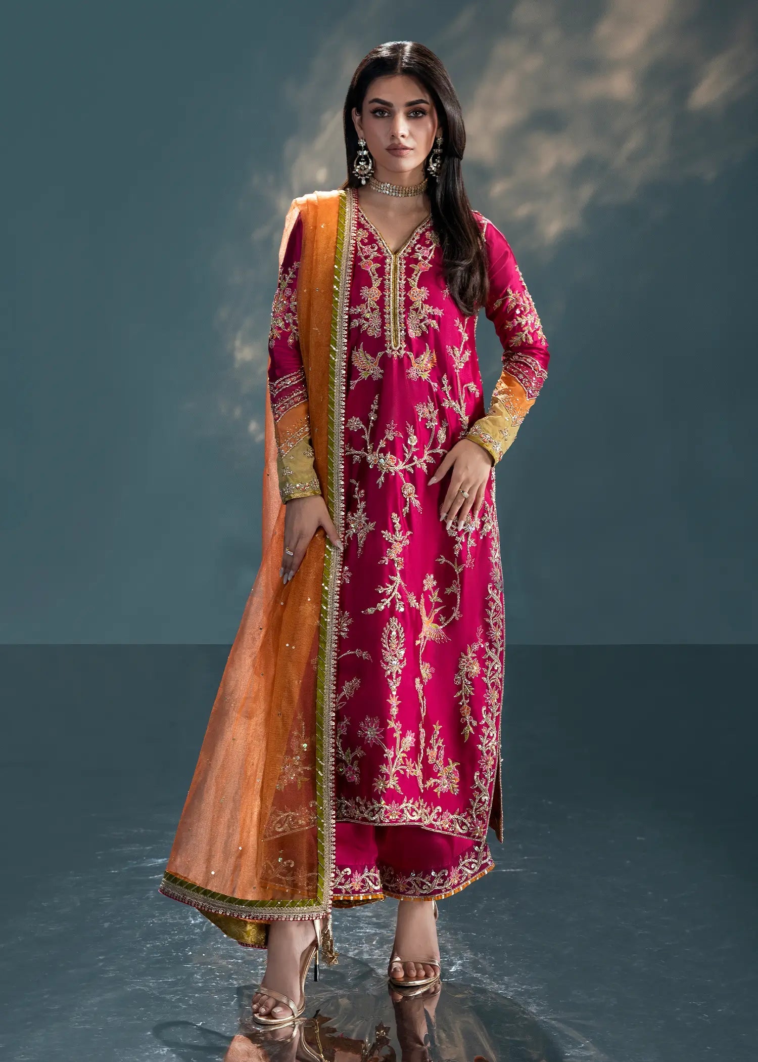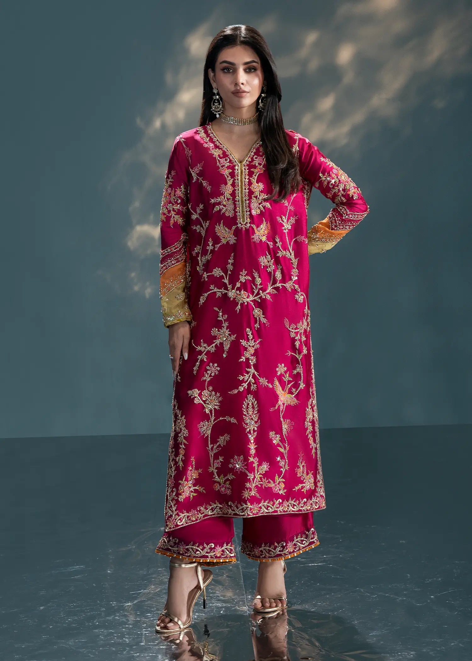 - Shirt: Fuchsia sheesha silk with zardozi florals, sequins & tikka work