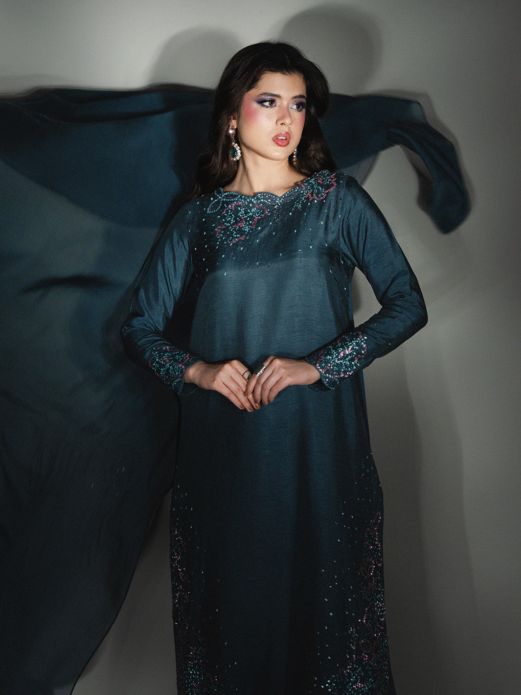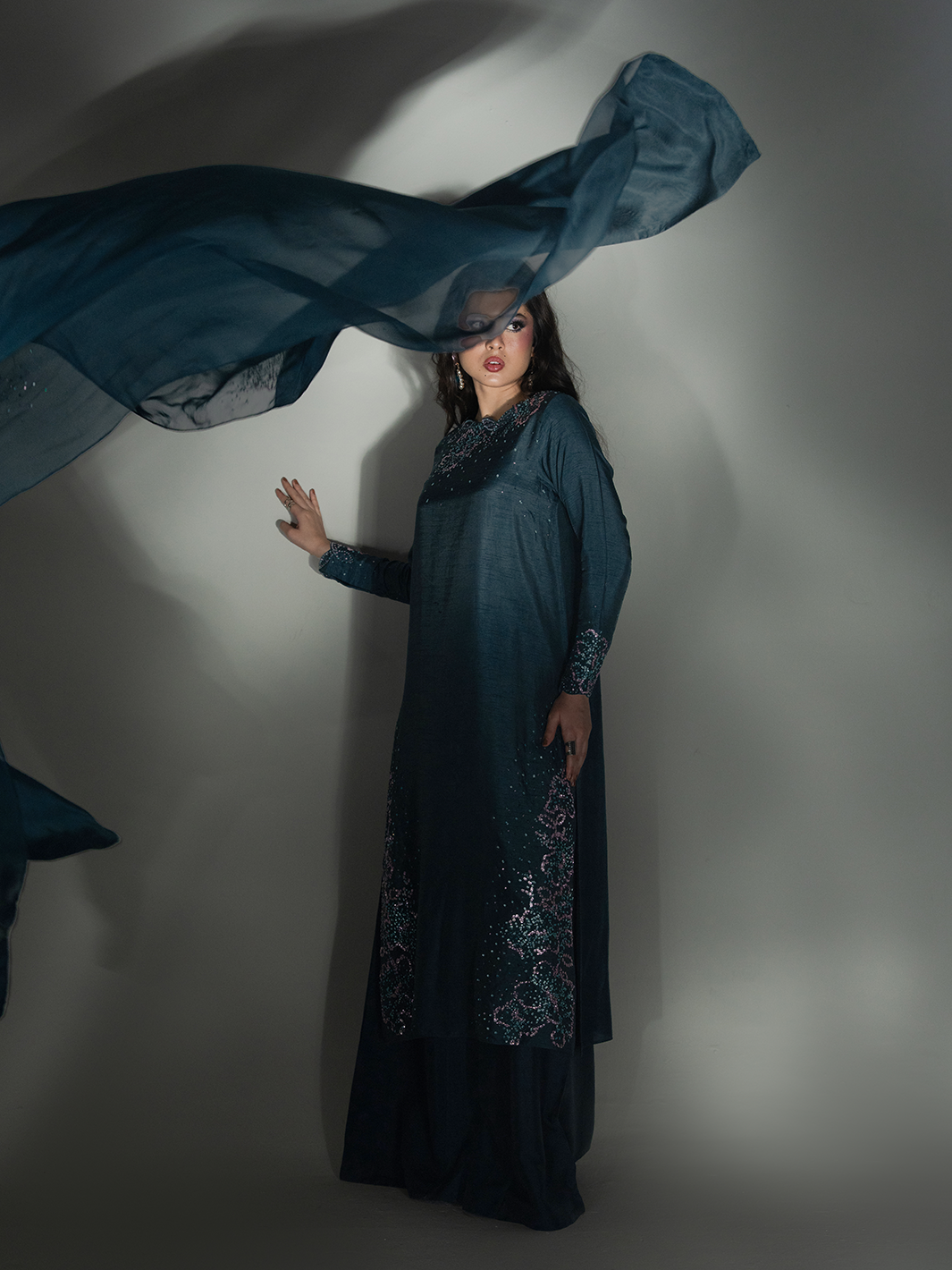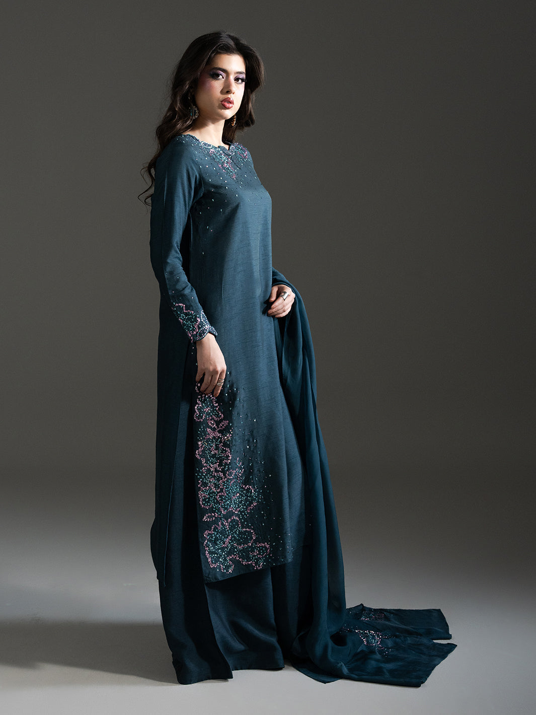 Draped in premium deep teal rawsilk, ESHAR is where nocturnal beauty meets luminous elegance — featuring sprawling hand-worked botanical motifs with intricate beadwork, finished with gossamer pure viscose organza dupatta for regal evening presence.
