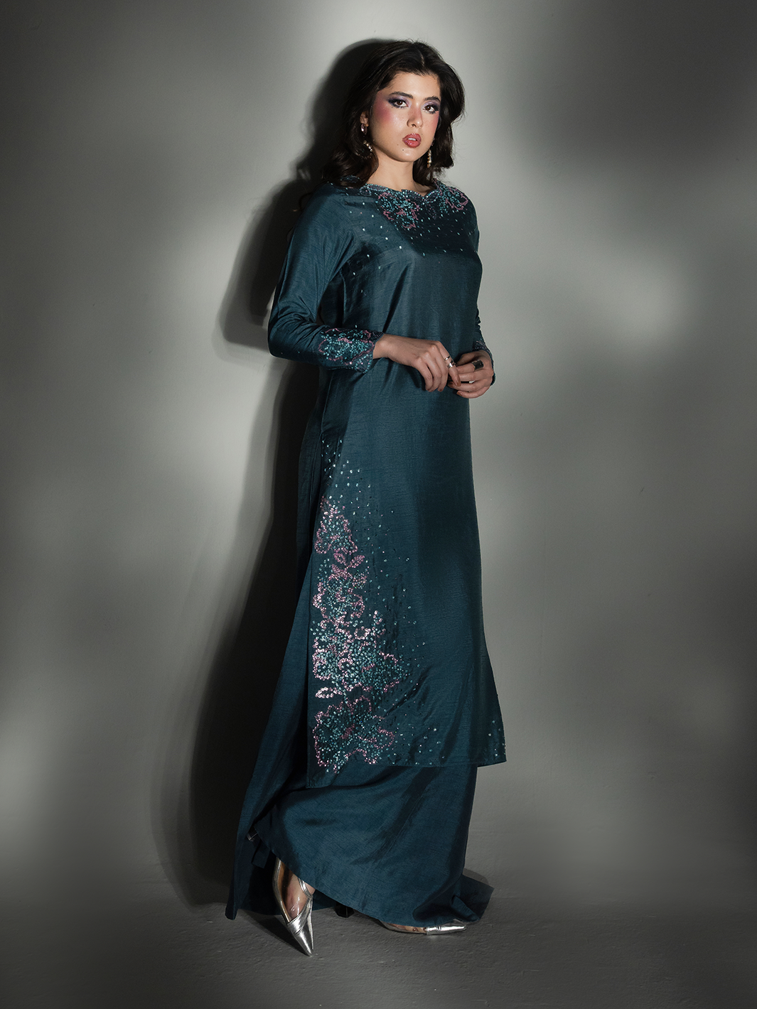 • Shirt: Deep teal rawsilk with hand-worked botanical embellishments