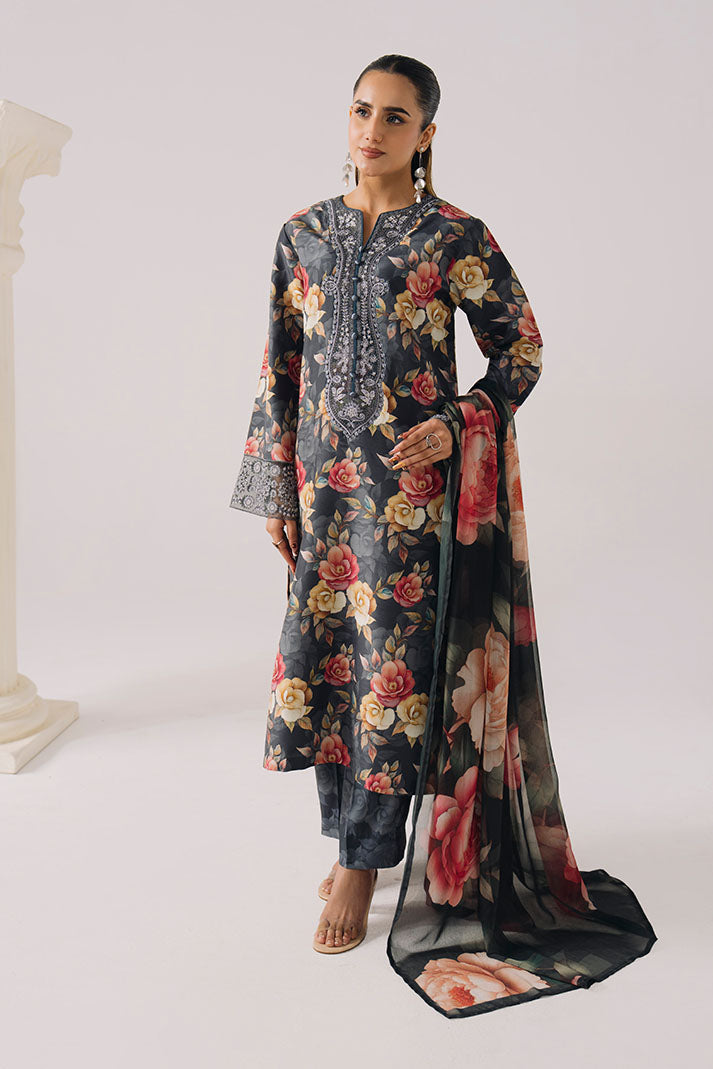 Draped in luxurious floral lawn, FLORAL CANVAS is where dark grey florals meet contemporary sophistication — featuring beautifully embroidered shirt with chiffon dupatta and matching trousers for refined summer elegance.