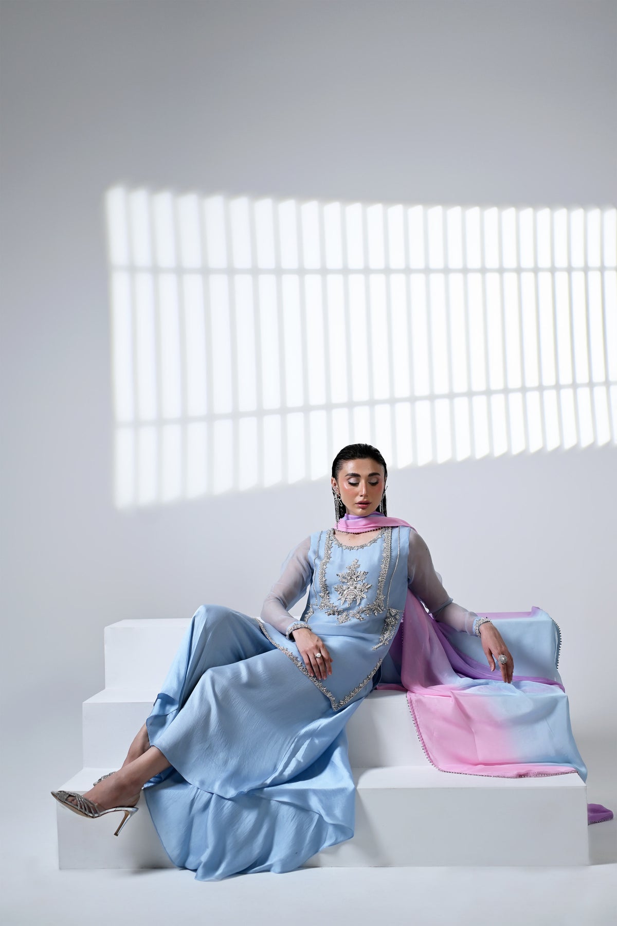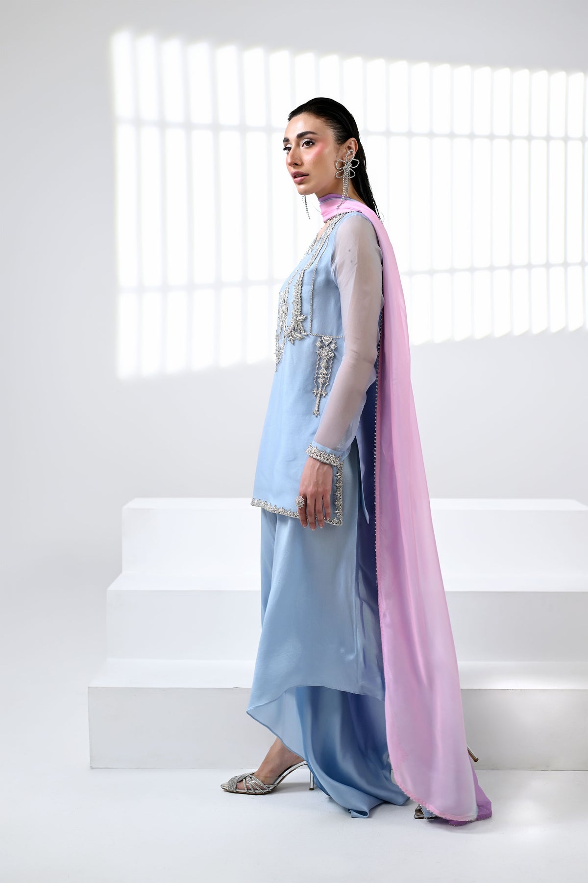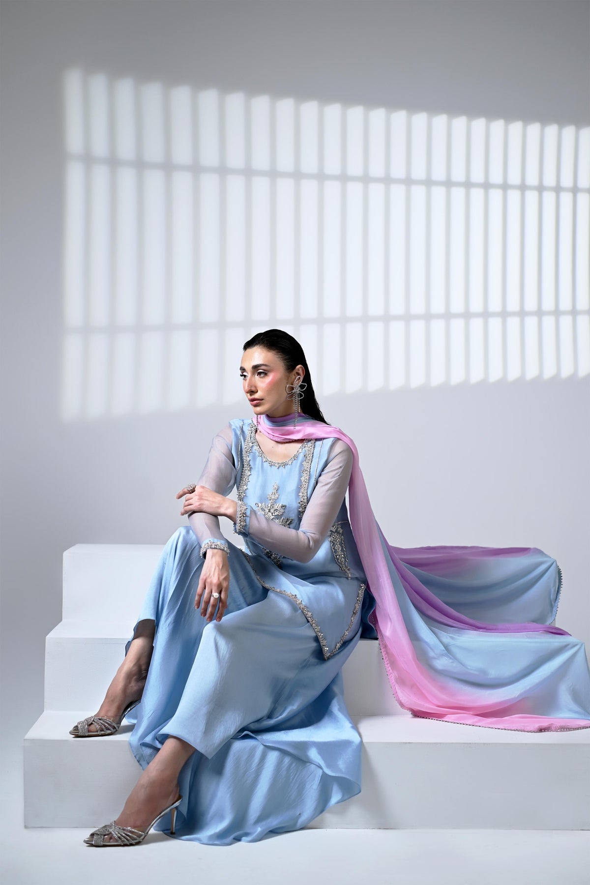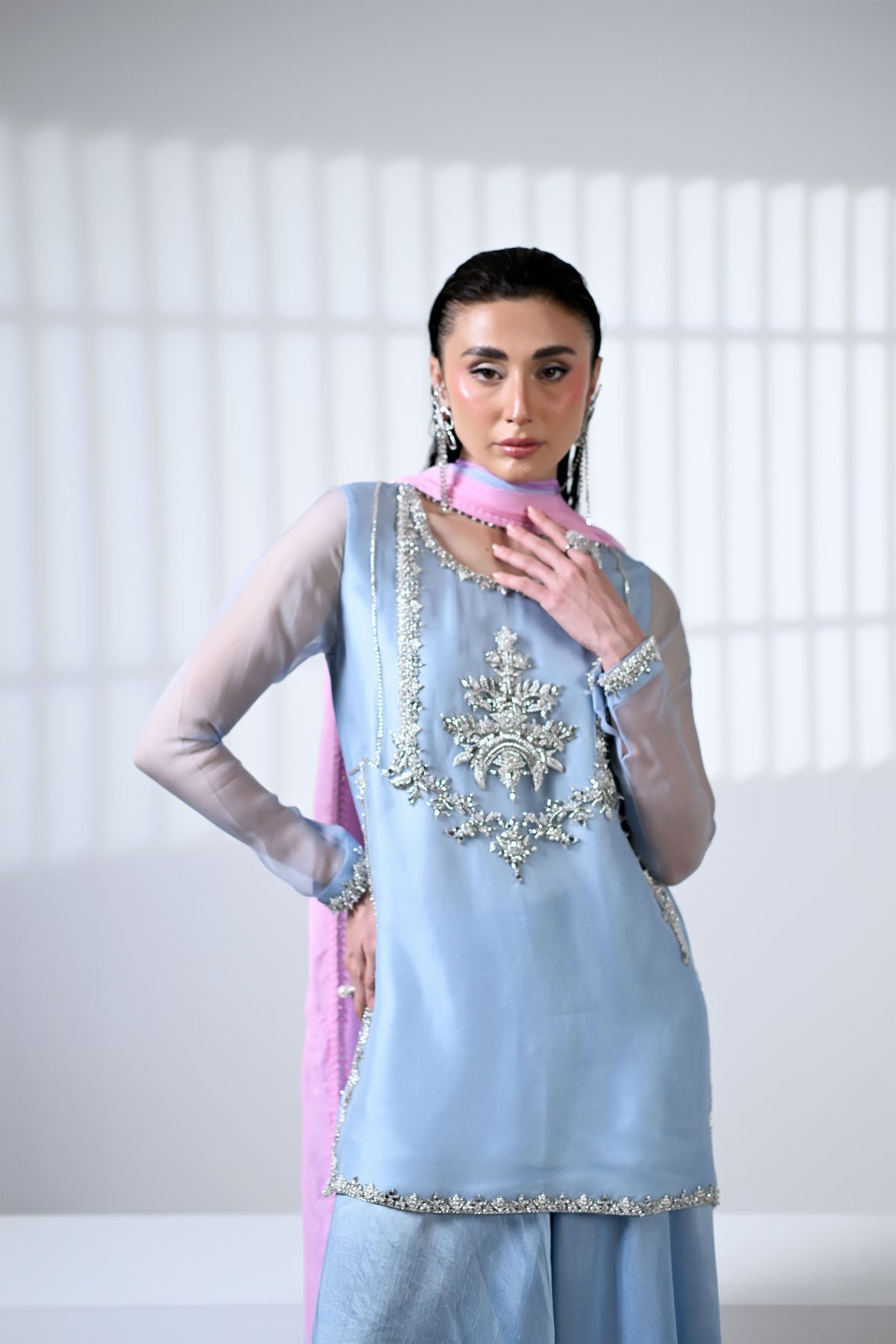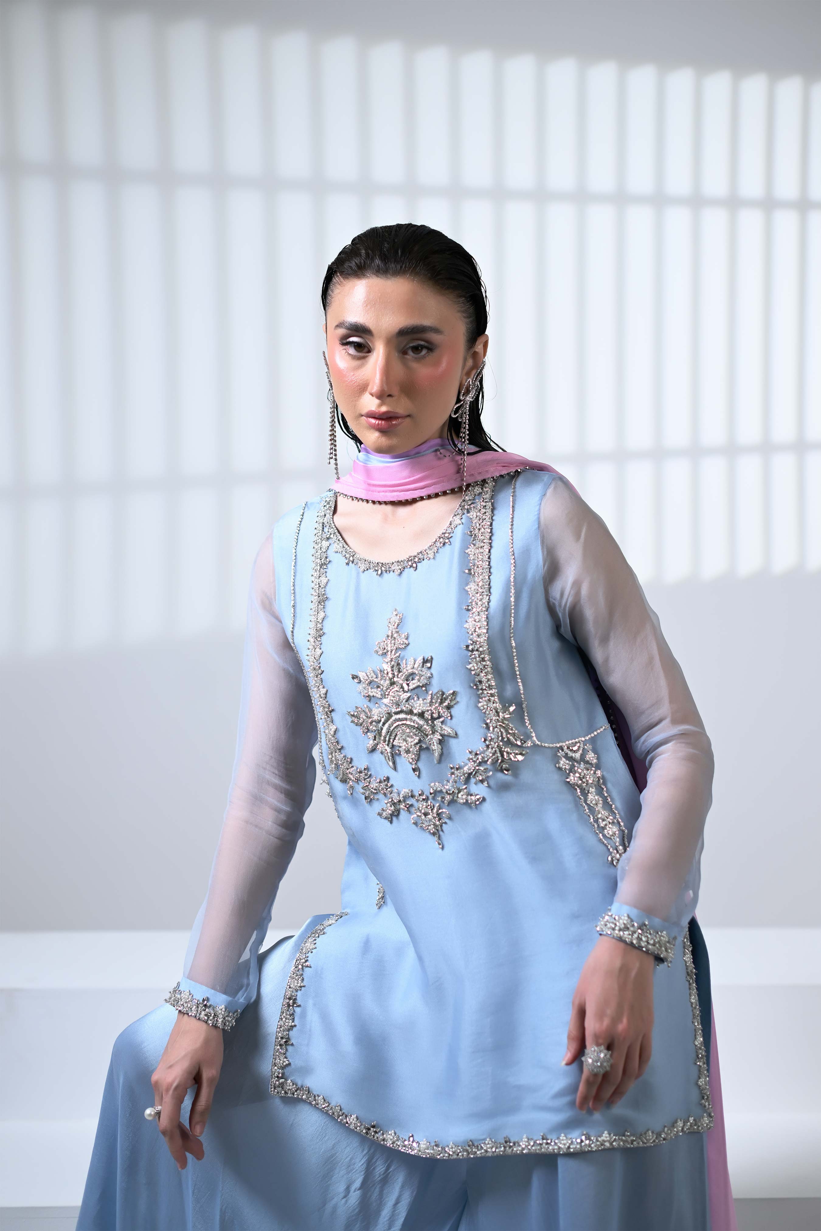 Frozen Blue is a serene composition of cool tones and graceful structure. Crafted from pure organza in a soft ice-blue hue, the shirt features detailed hand embellishments in fine cutdana, tikki stones, naqshi, mukesh, crystals and sequins—arranged in a refined, sculpted motif that draws focus without overpowering. Sheer sleeves and scalloped finishing add a soft, modern edge.