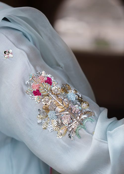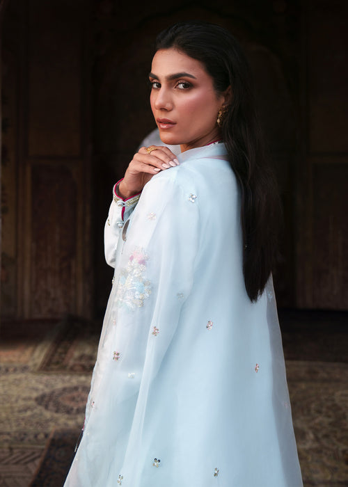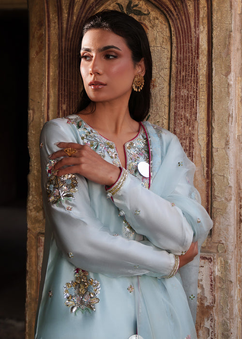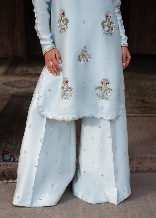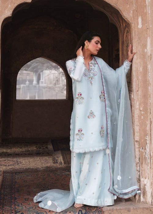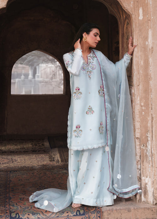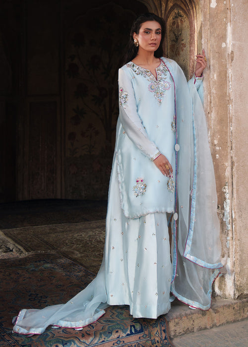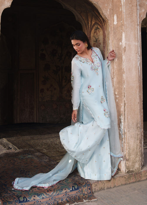 Embrace effortless grace with GLACE, where luxurious tissue silk meets contemporary comfort — featuring a beautifully tailored ensemble paired with flowing Korean raw silk palazzo pants and sheer kataan organza dupatta for modern sophistication.