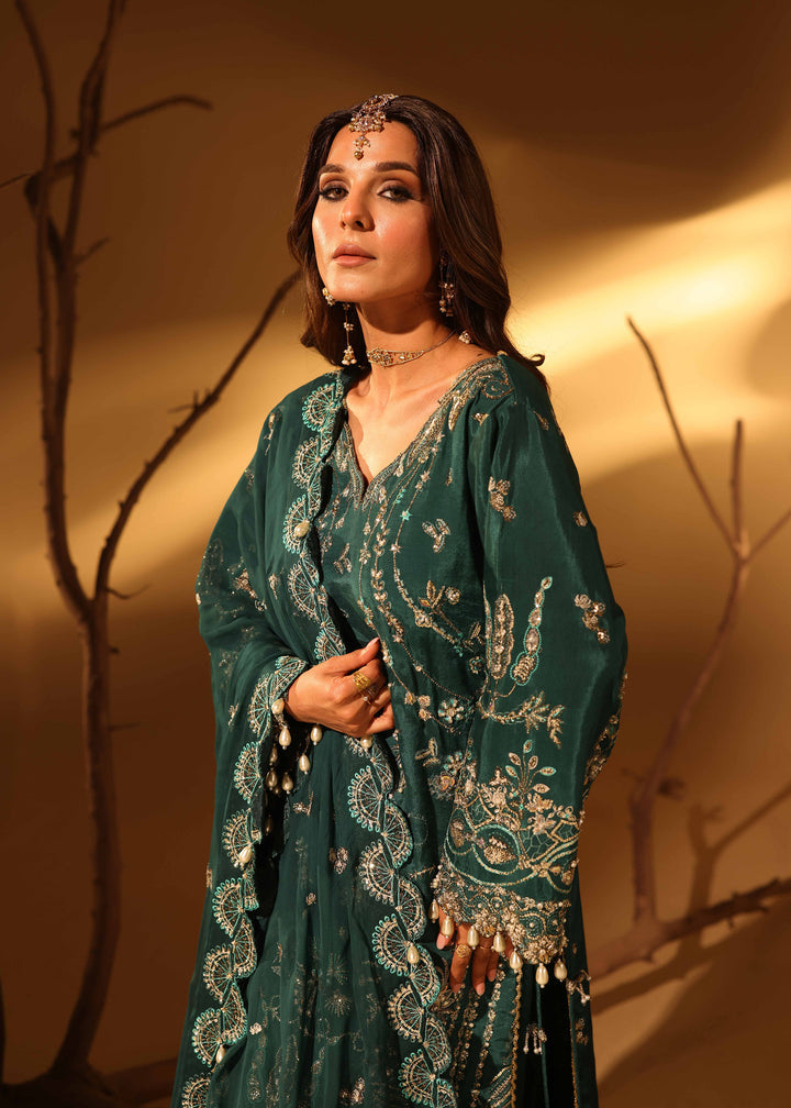 Draped in rich green raw silk, GREEN SLATE is where meticulous hand embellishment meets understated power — center, side panels, and sleeves thoughtfully adorned for balanced, elongated silhouette.