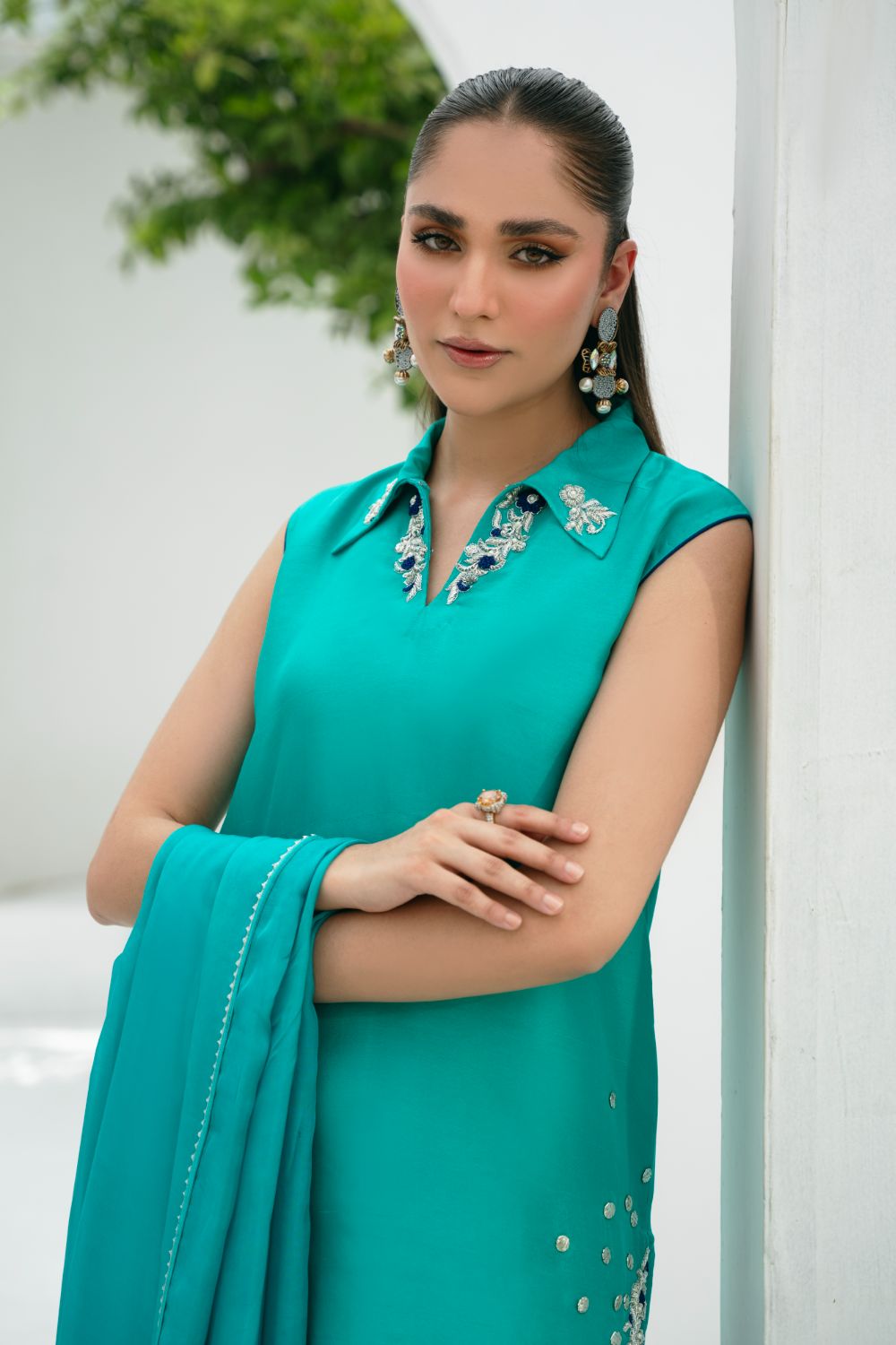 Draped in luxurious Pure Sheesha silk, INARA is where refined craftsmanship meets timeless sophistication — featuring beautifully tailored shirt with medium silk dupatta and farshi shalwar for elegant formal charm.