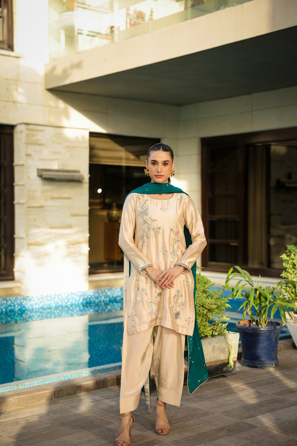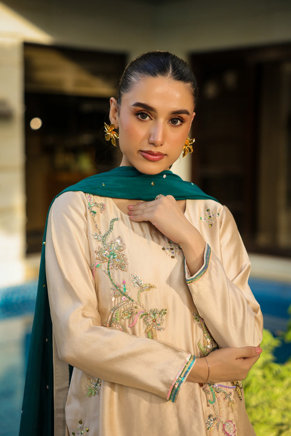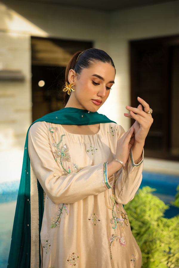 Draped in pure sheesha silk, IVORY DUST is where elegant soft-glam meets refined sophistication — adorned with sequins, pearls, stones, and resham detailing with classic shalwar for festive and formal occasions.