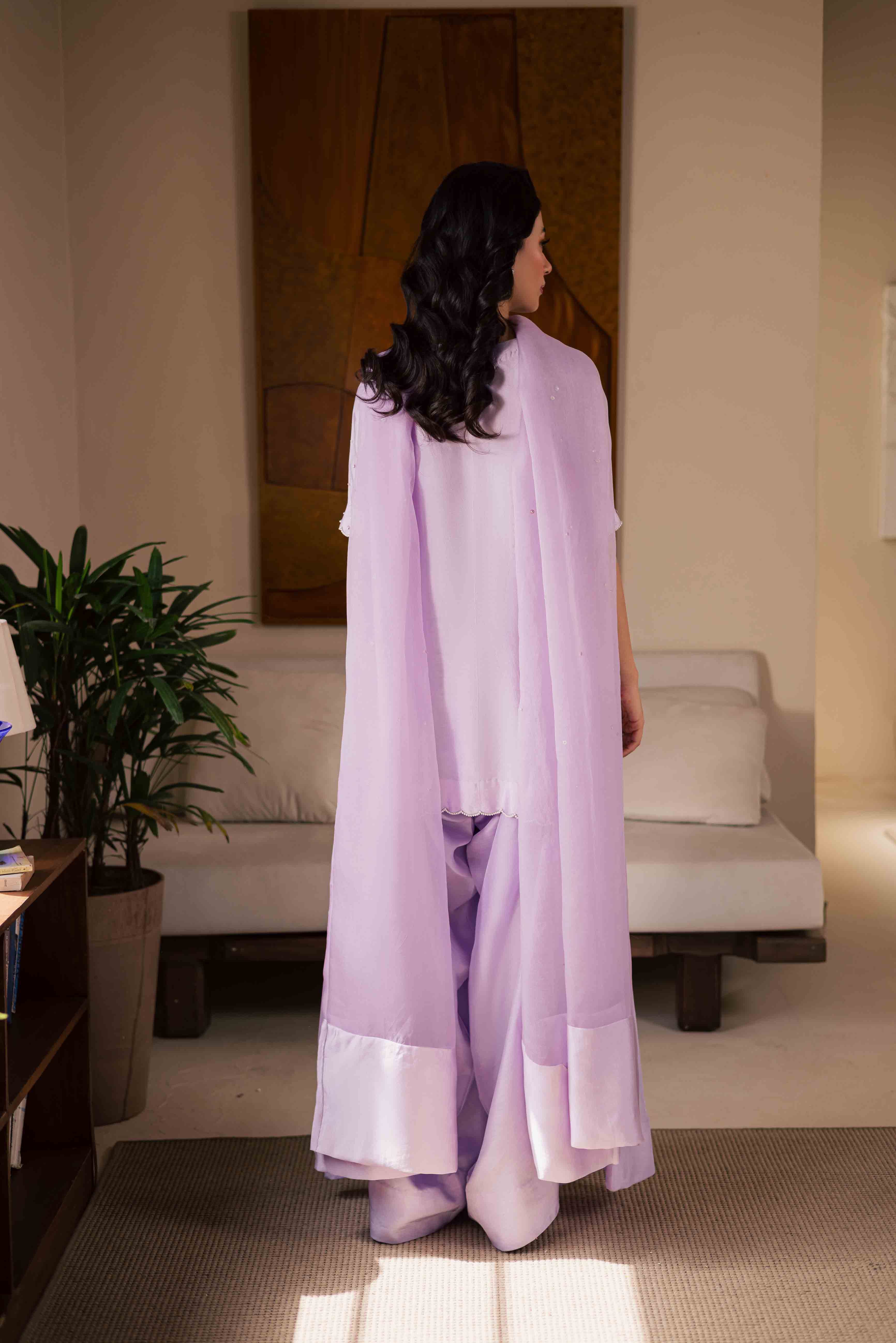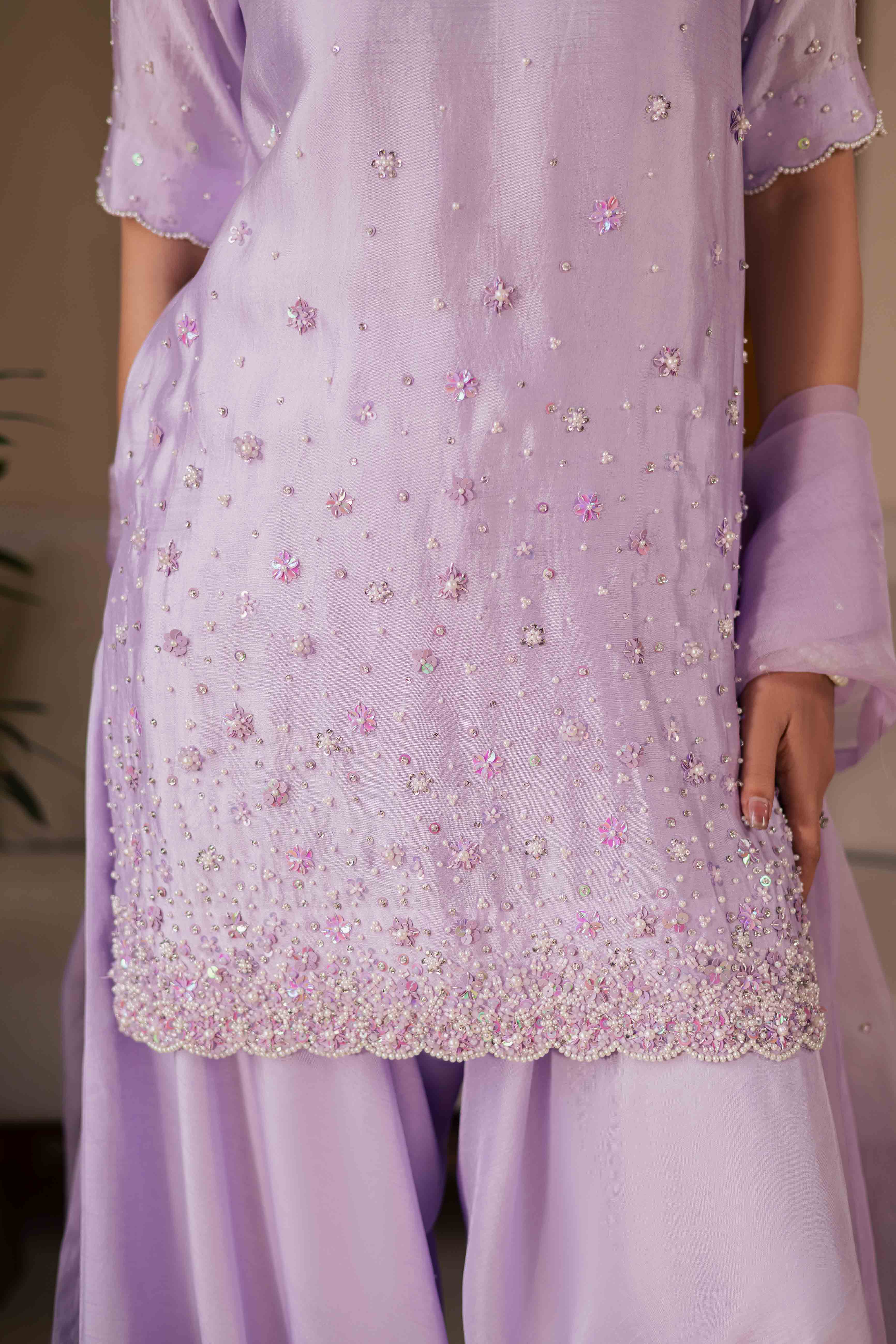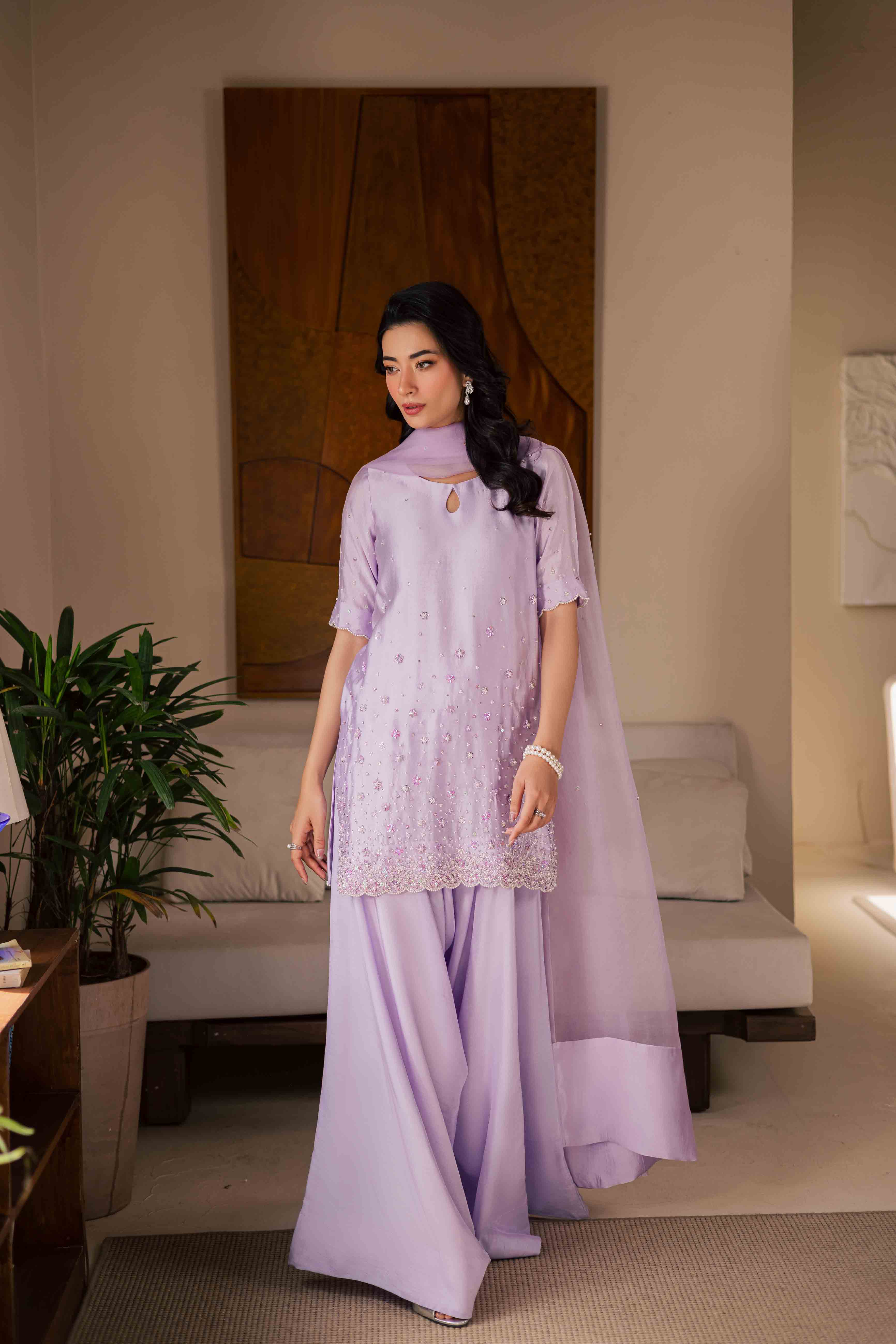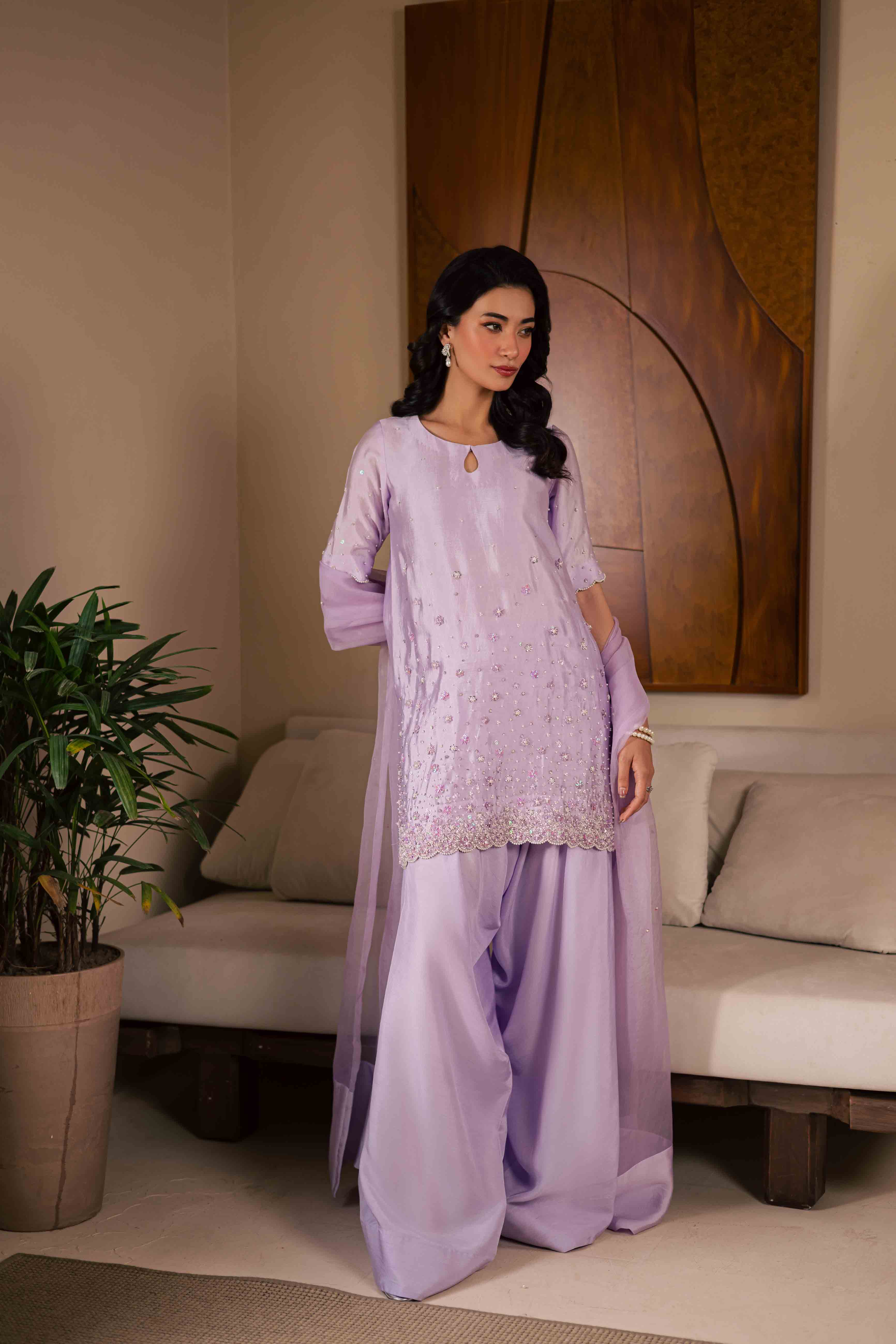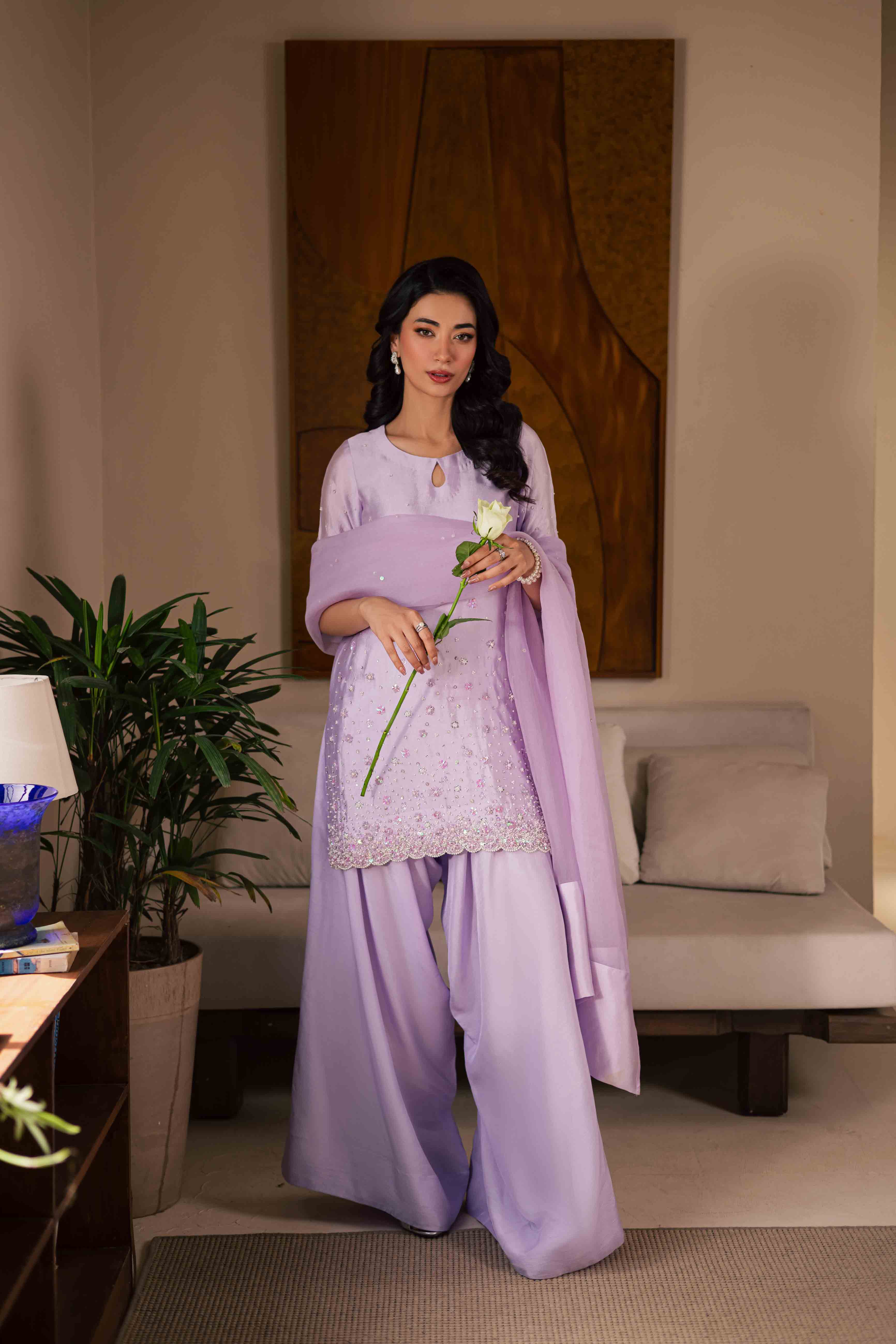 Draped in pure sheesha silk, LAVENDER is where refined craftsmanship meets timeless sophistication — featuring heavily embellished border with pearls, sequins, and crystals, keyhole neckline with scalloped sleeves, pure organza dupatta, and dhaka pants for elegant formal charm.
