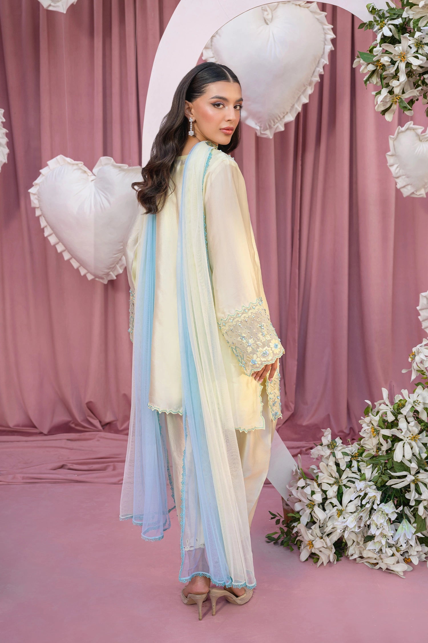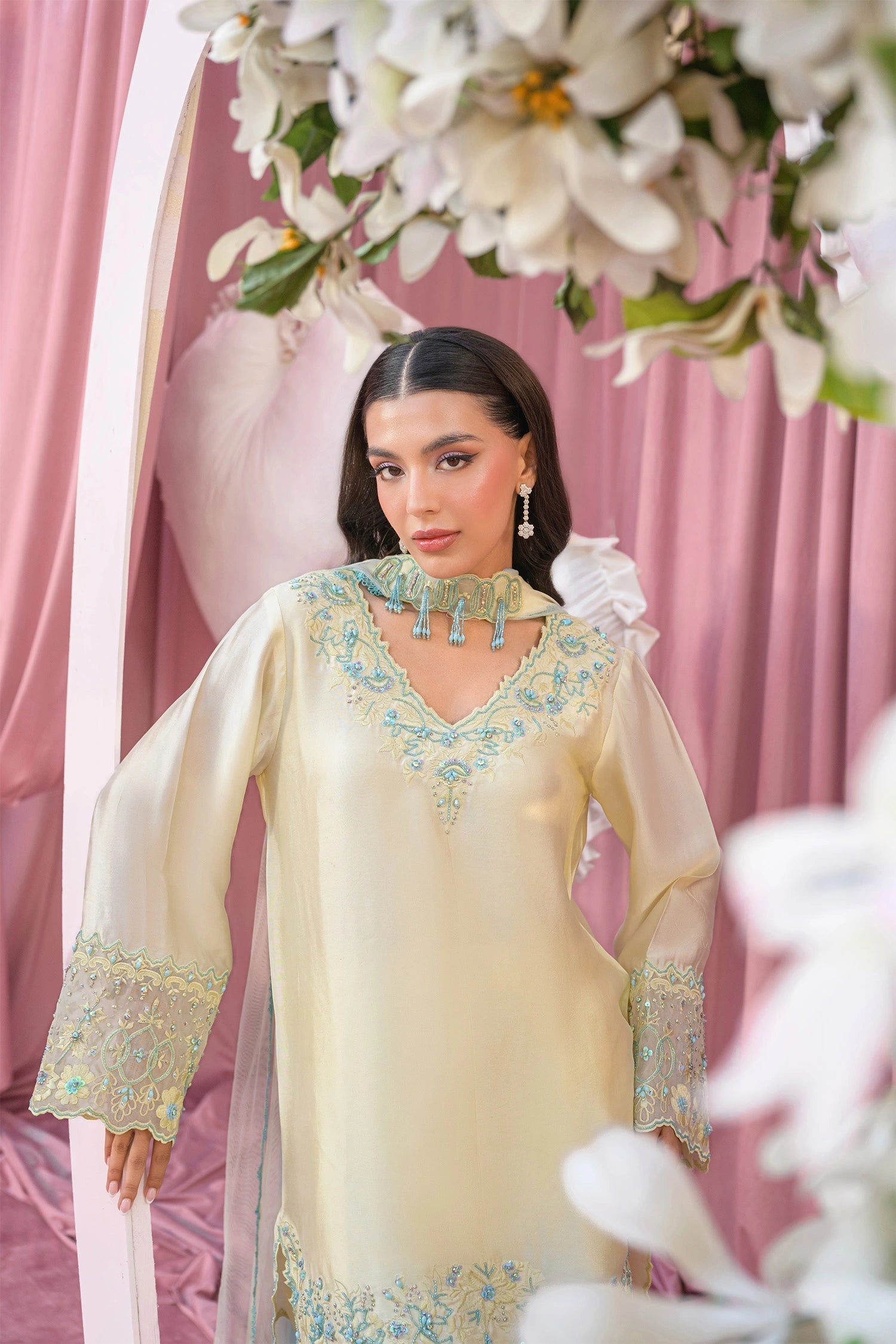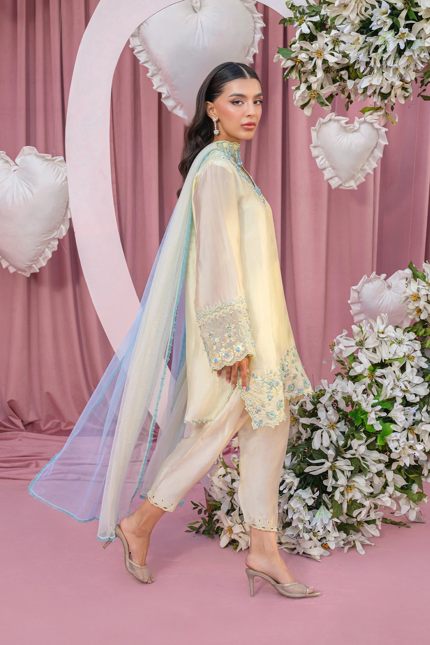 The ensemble is completed with an embroidered dupatta that adds an extra layer of elegance and grace. Intricate embroidery showcases traditional craftsmanship while maintaining a contemporary sensibility, perfect for the modern woman who loves fresh, vibrant colors.