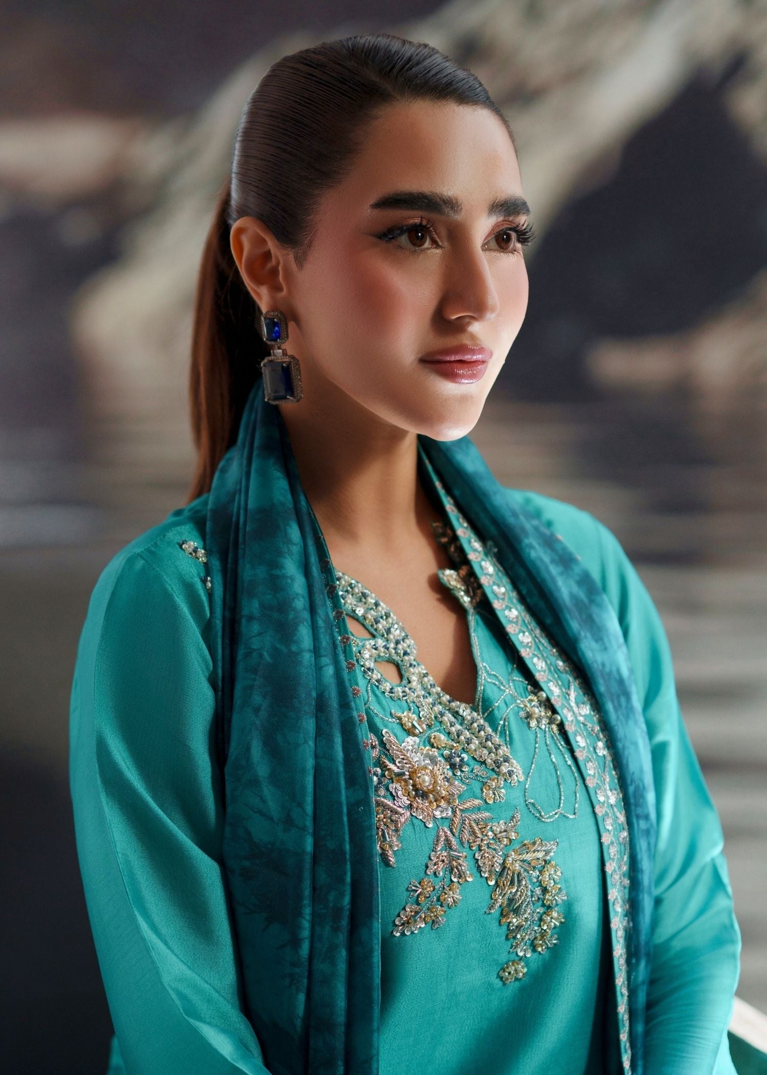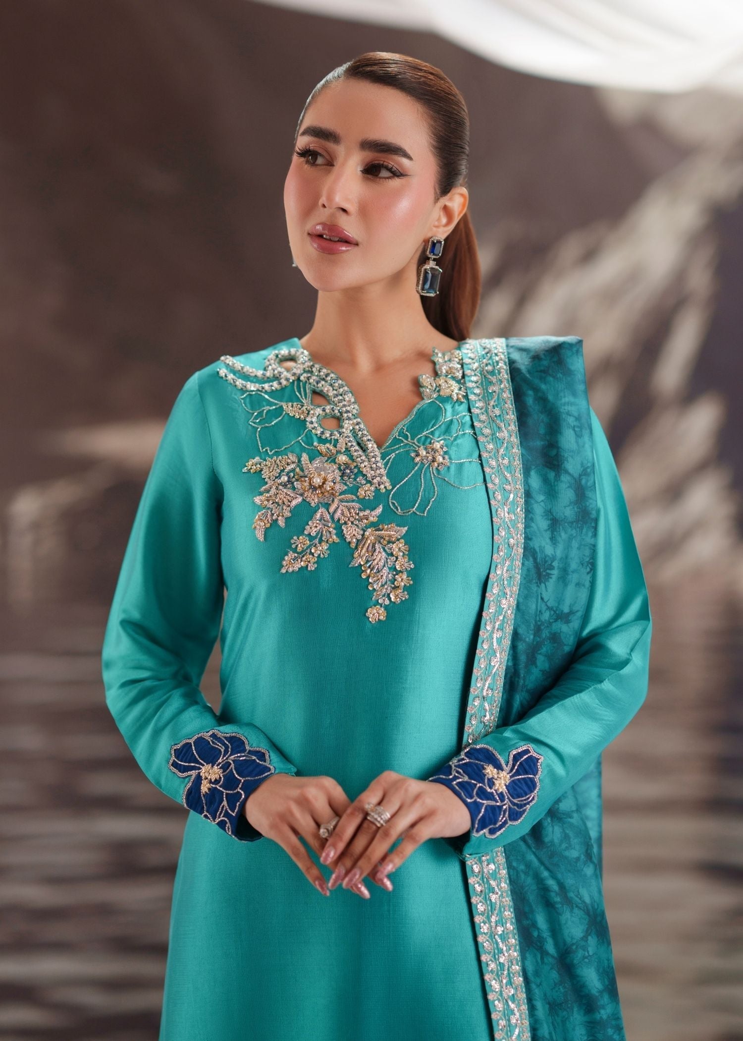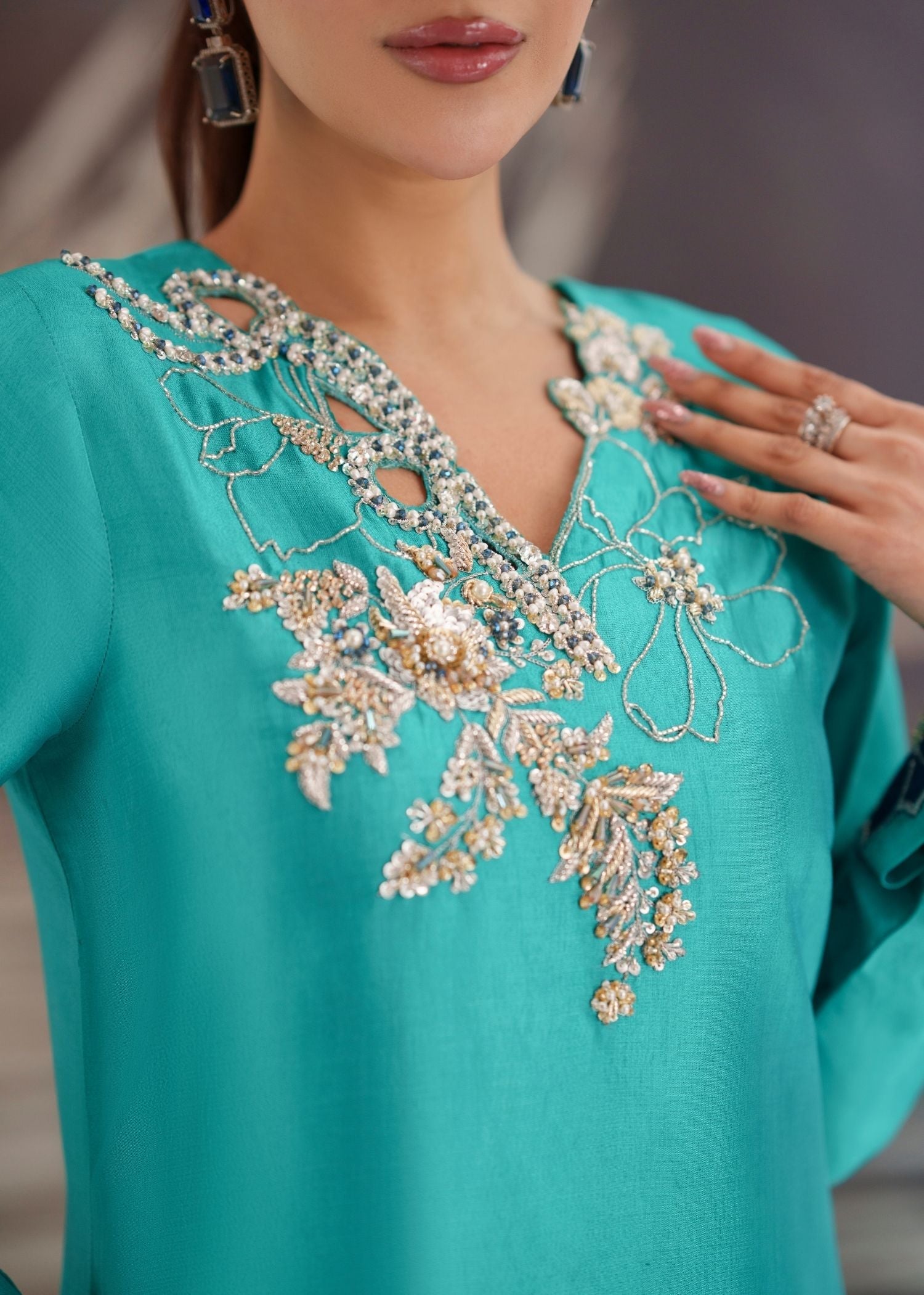 Draped in pure sheesha silk, LUMI is where vibrant color meets refined detailing — featuring turquoise long shirt with hand-embellished and hand-embroidered work, paired with embroidered raw silk trouser and printed silk dupatta for year-round elegant sophistication.
