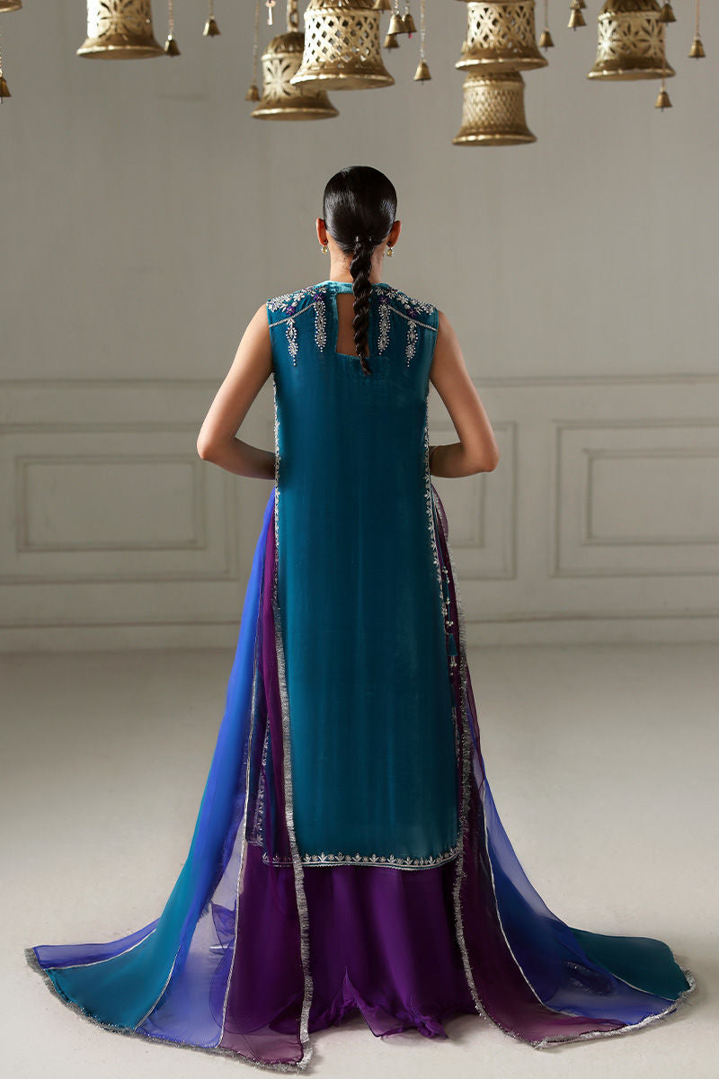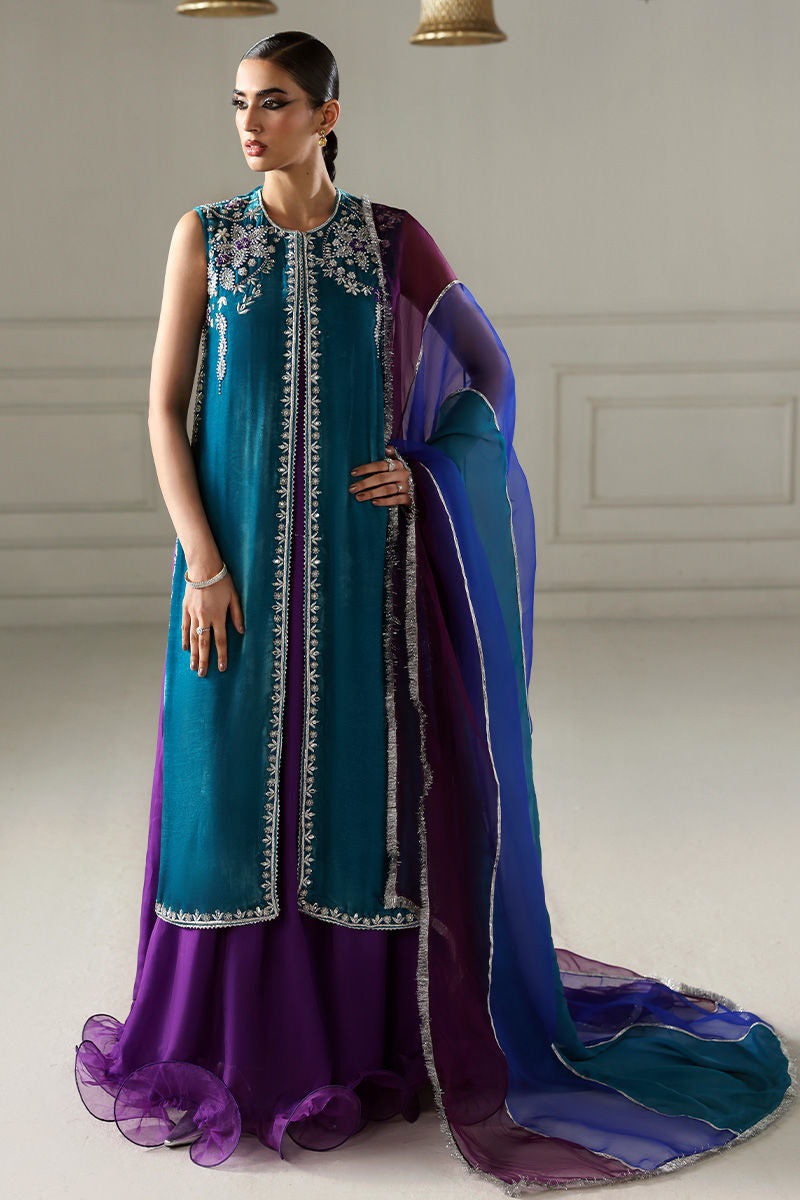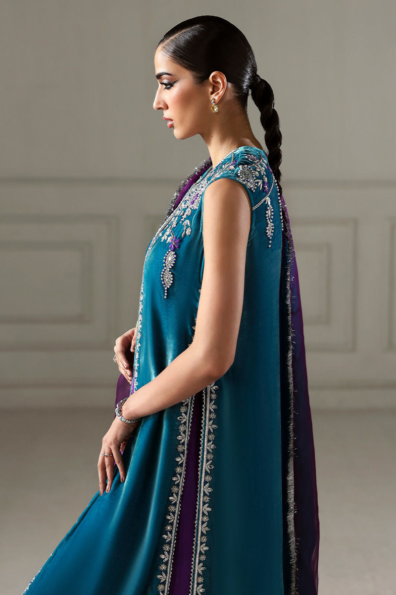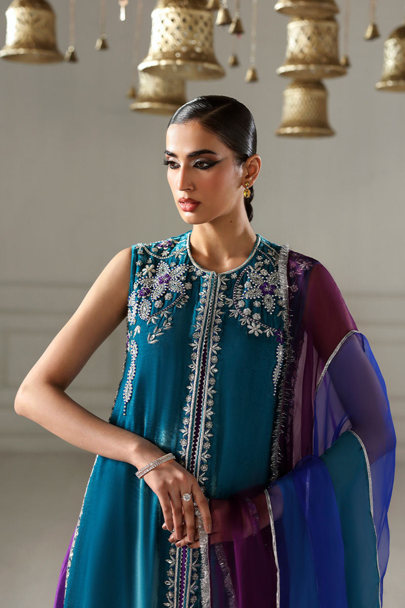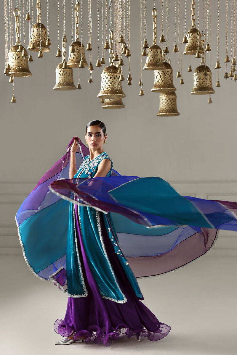 Draped in pure velvet, LUNESSA is where vibrant color meets effortless elegance — featuring ferozi open shirt with floral and stem-shaped embellishments across front, back, neckline, and all borders, paired with medium silk underdress and pure organza-silk dupatta for sophisticated layered presence.