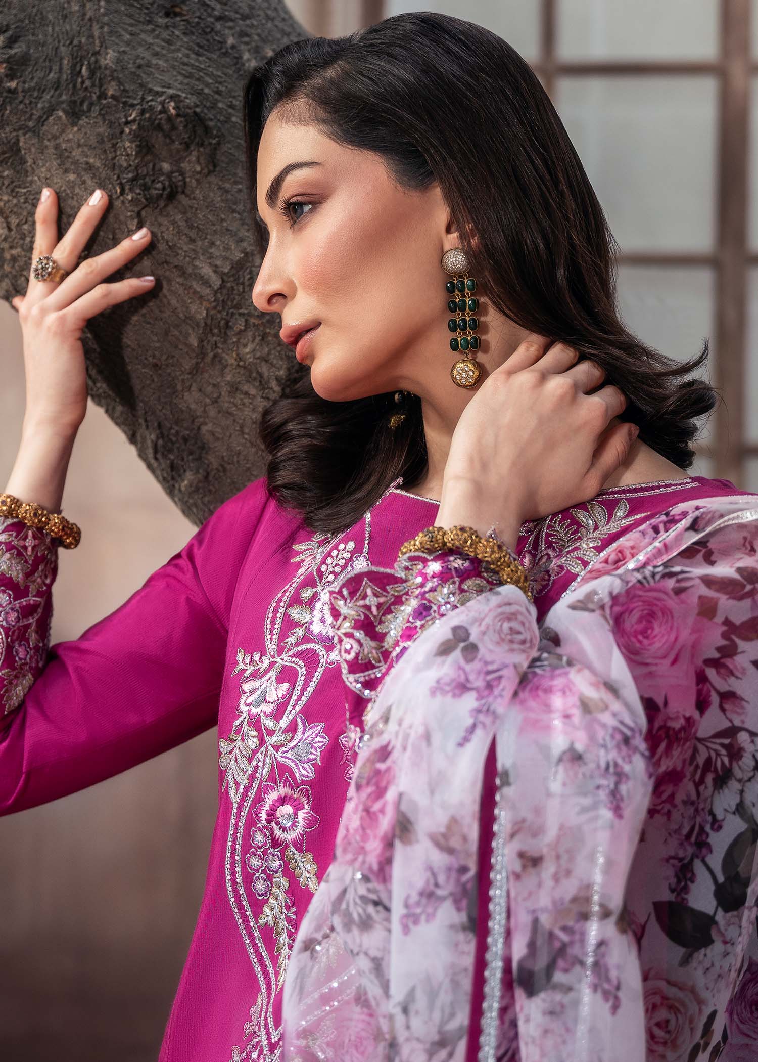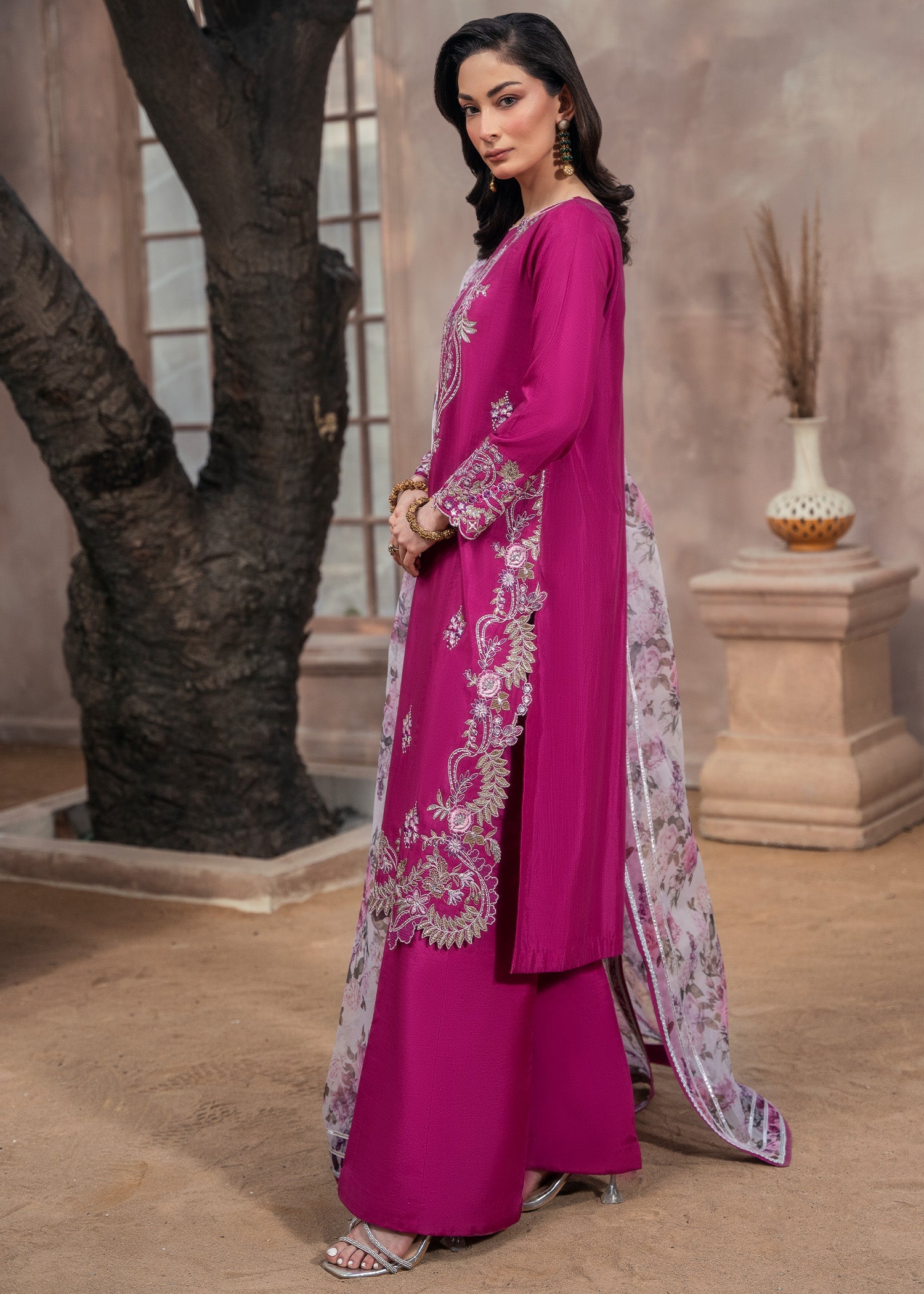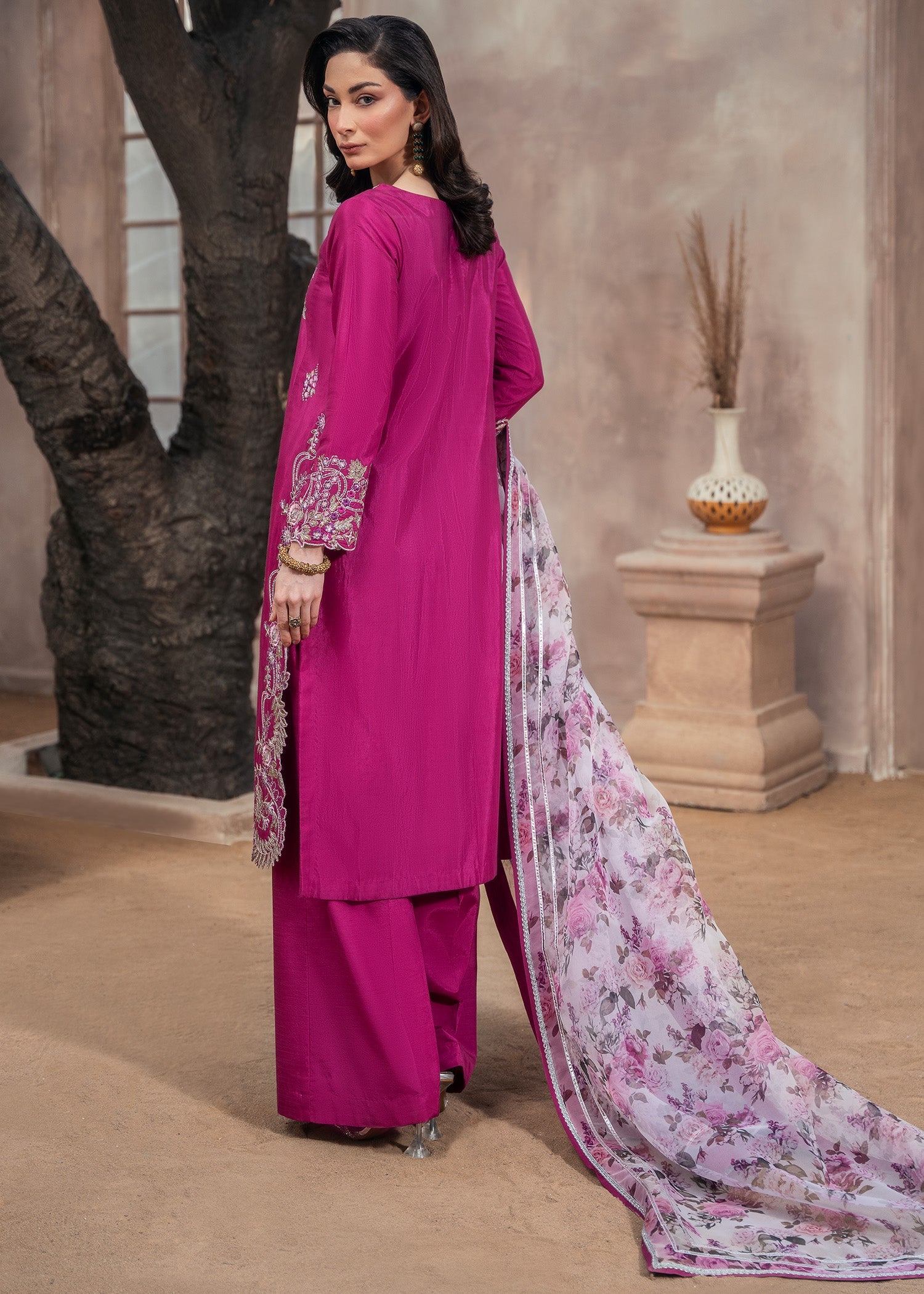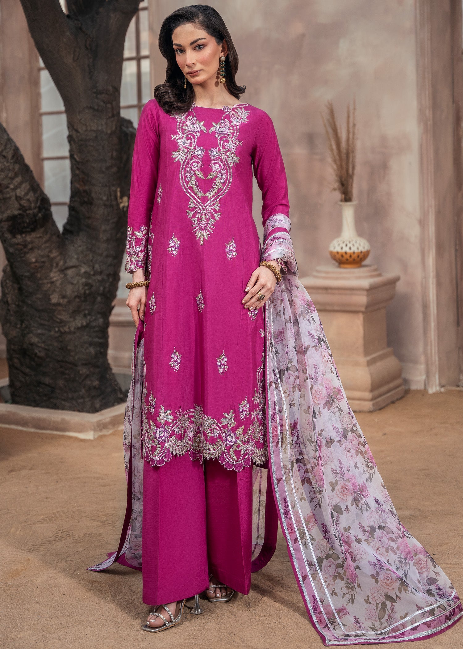 Draped in luxurious raw silk, MAHA is where vibrant magenta meets embroidered elegance — featuring loose-fit short kurta with intricate embroidery, paired with raw silk palazzo and organza dupatta for all-season graceful sophistication.