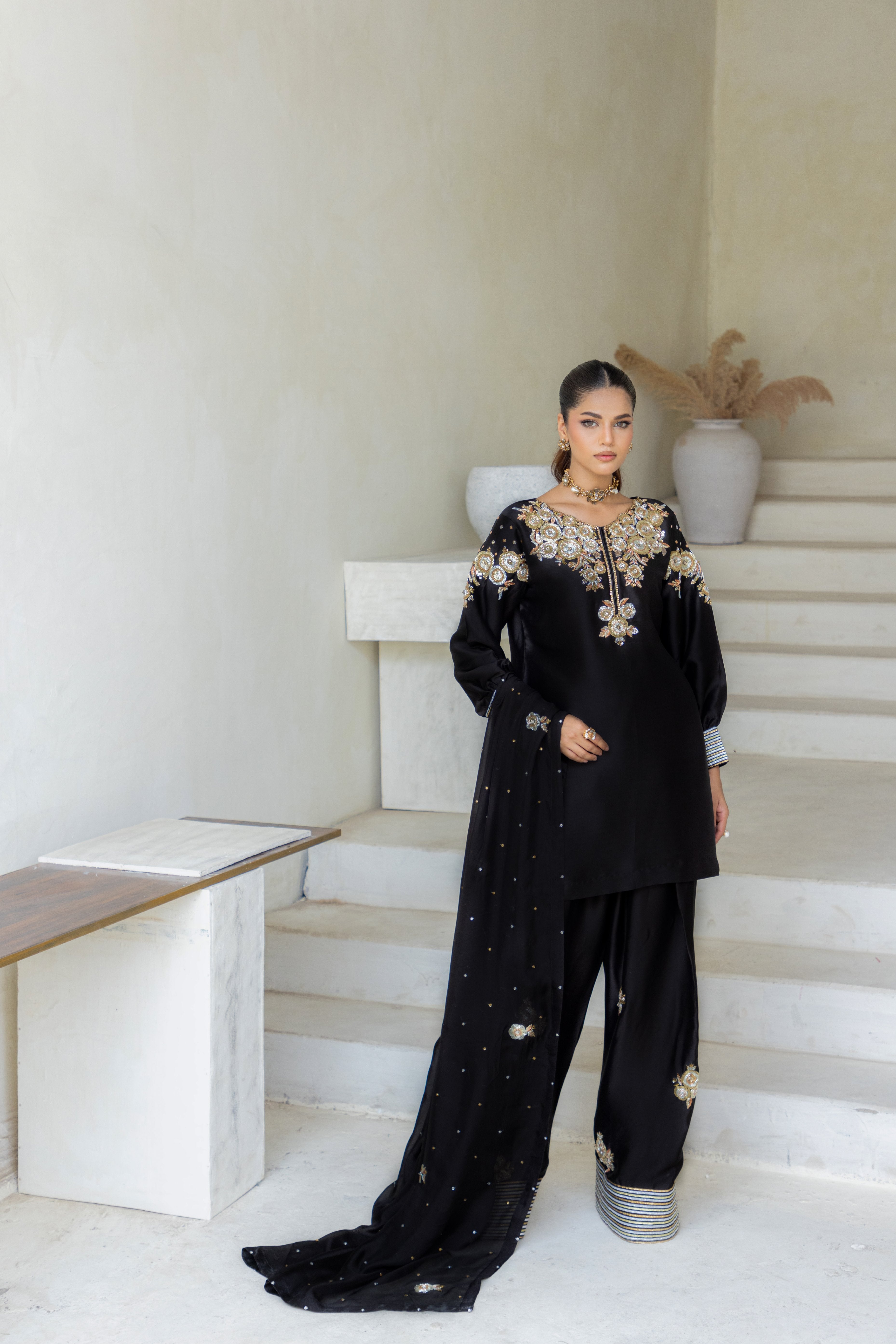 • Elaborately Crafted Rosette Motifs: Scattered across farshi shalwar for regal aura