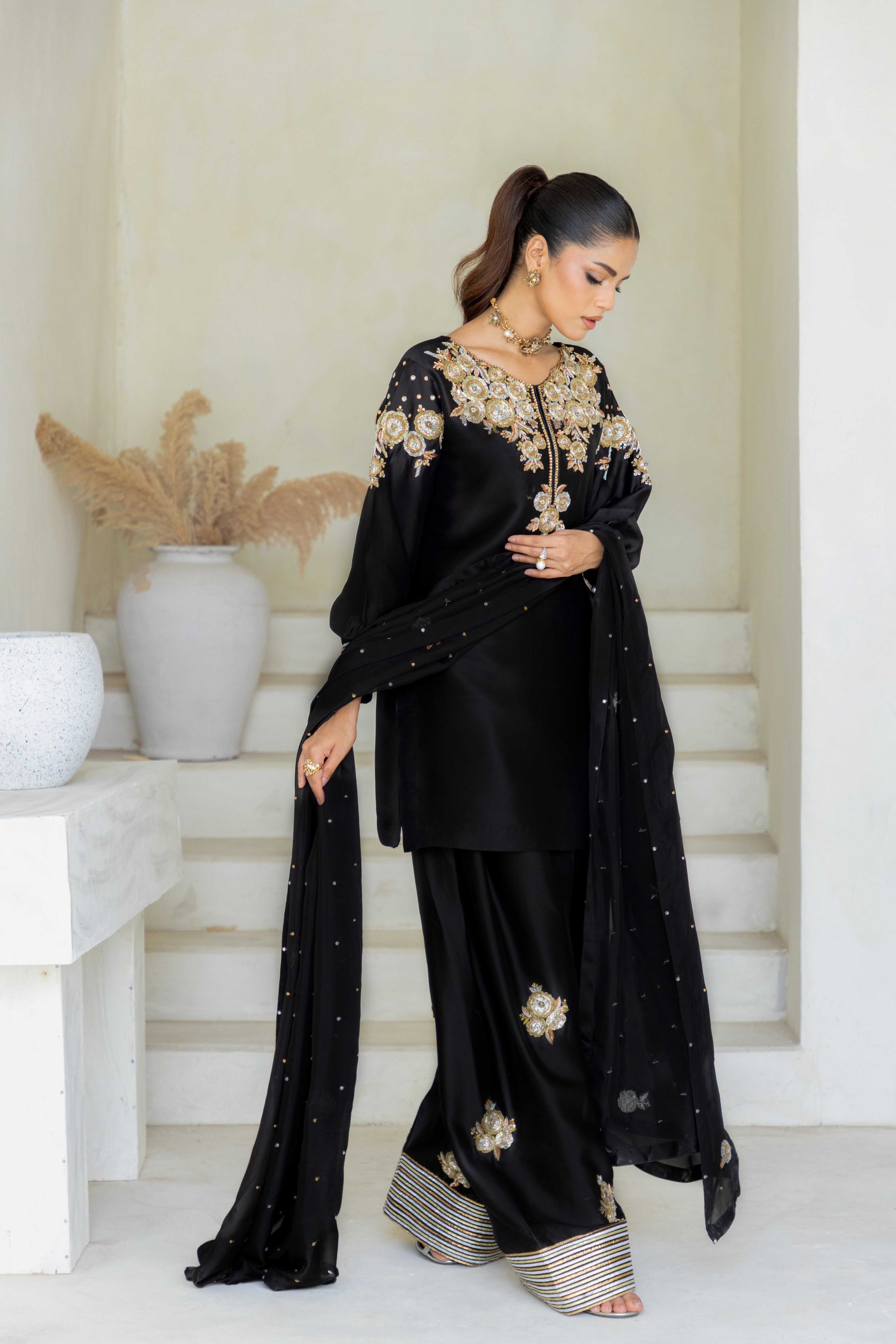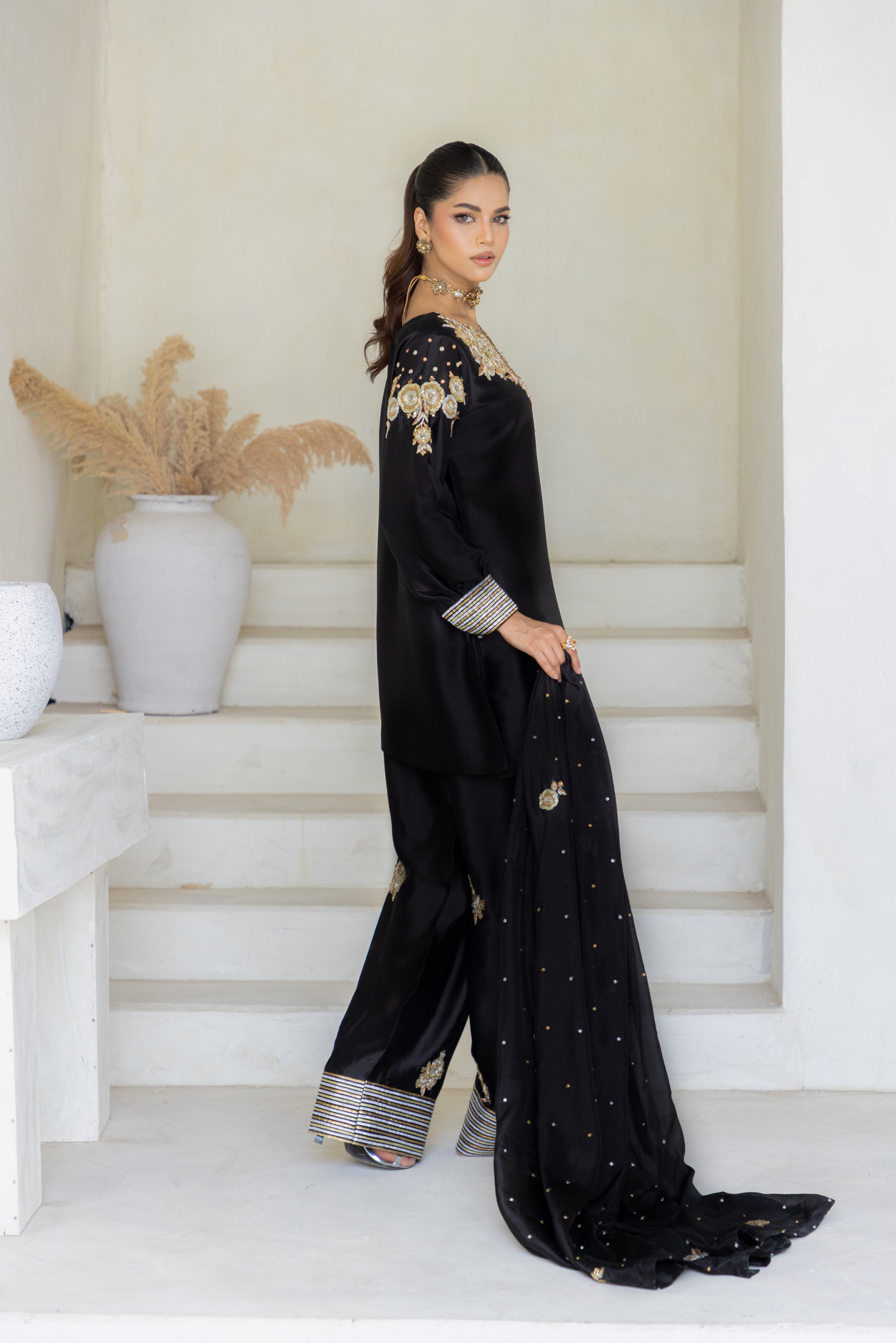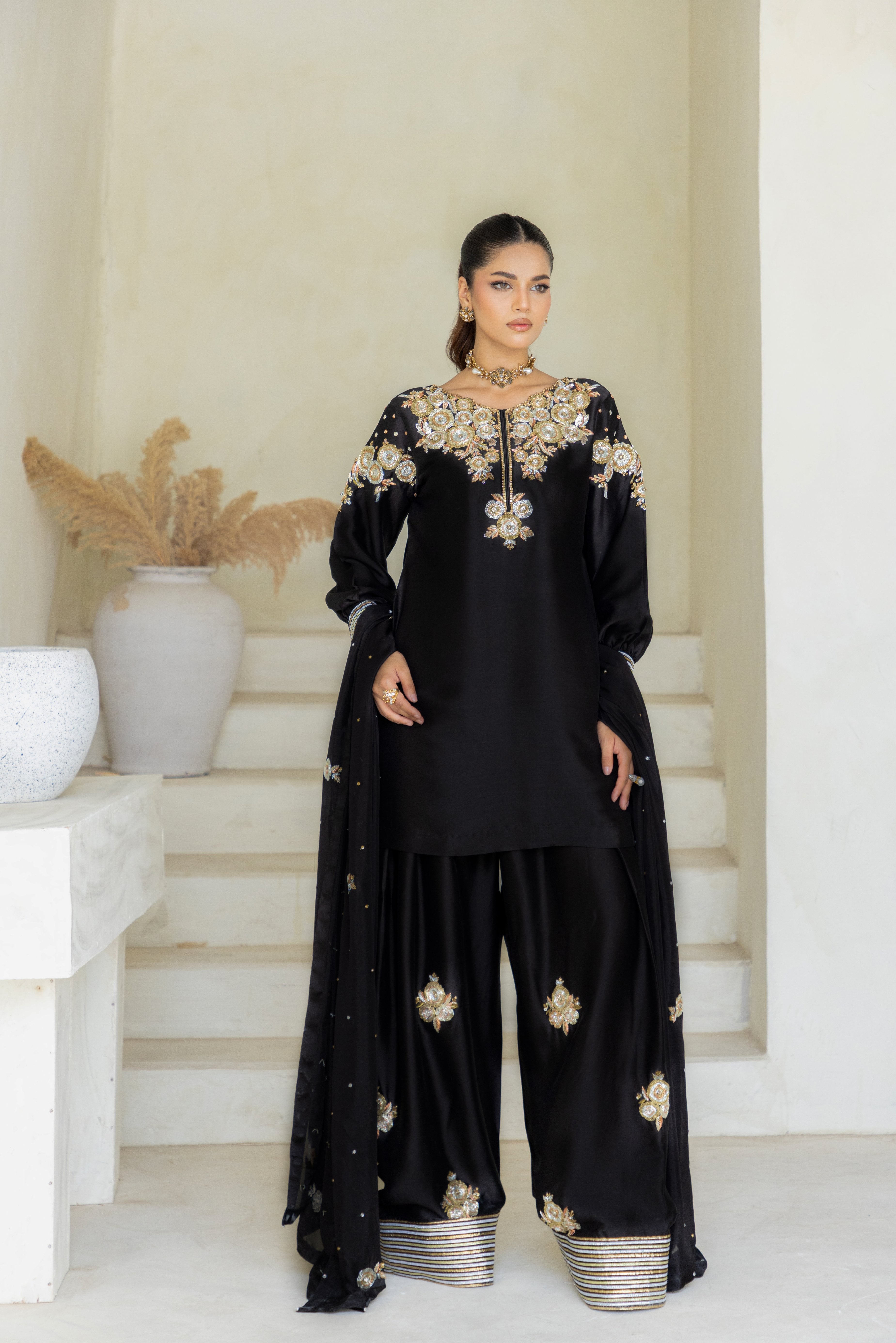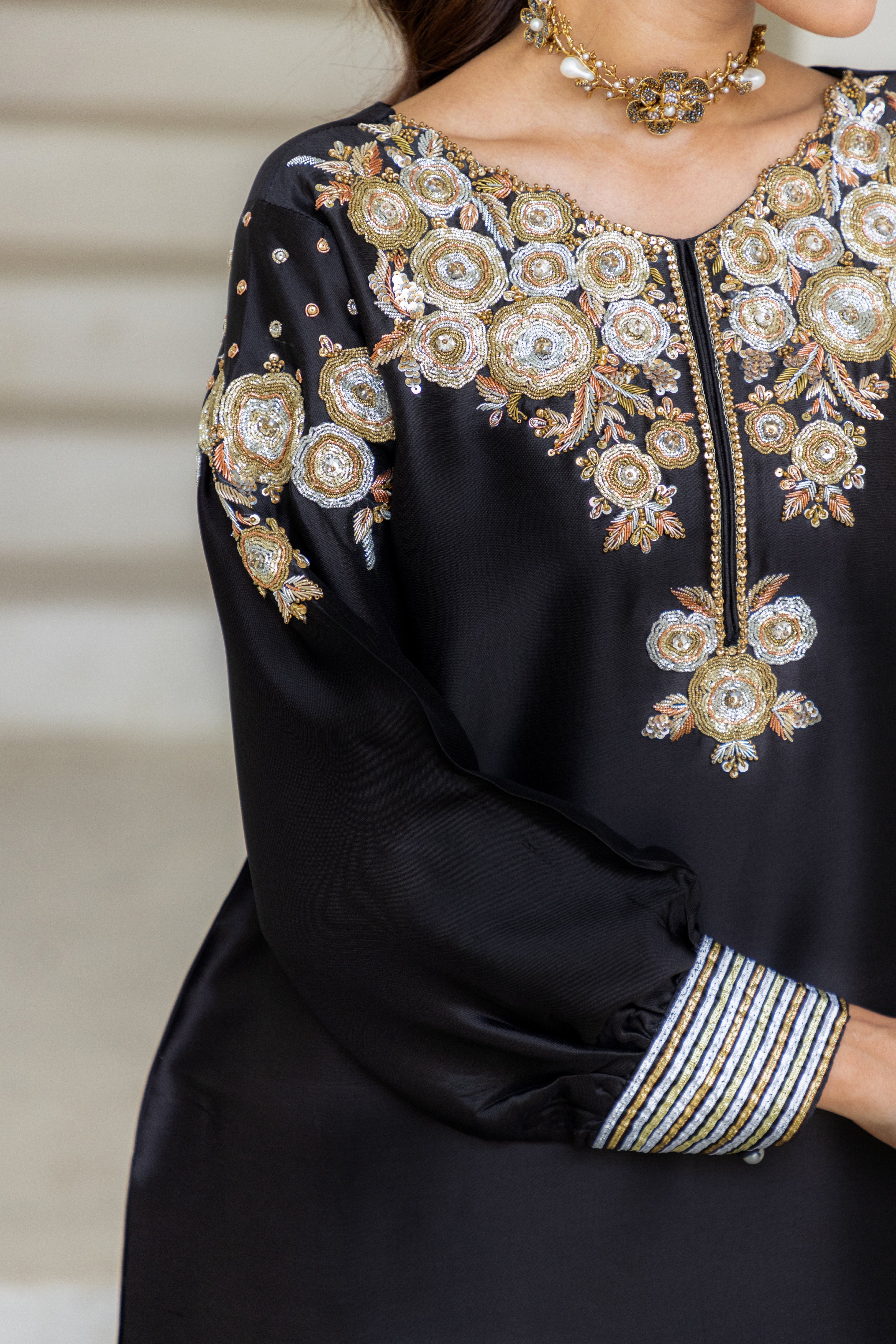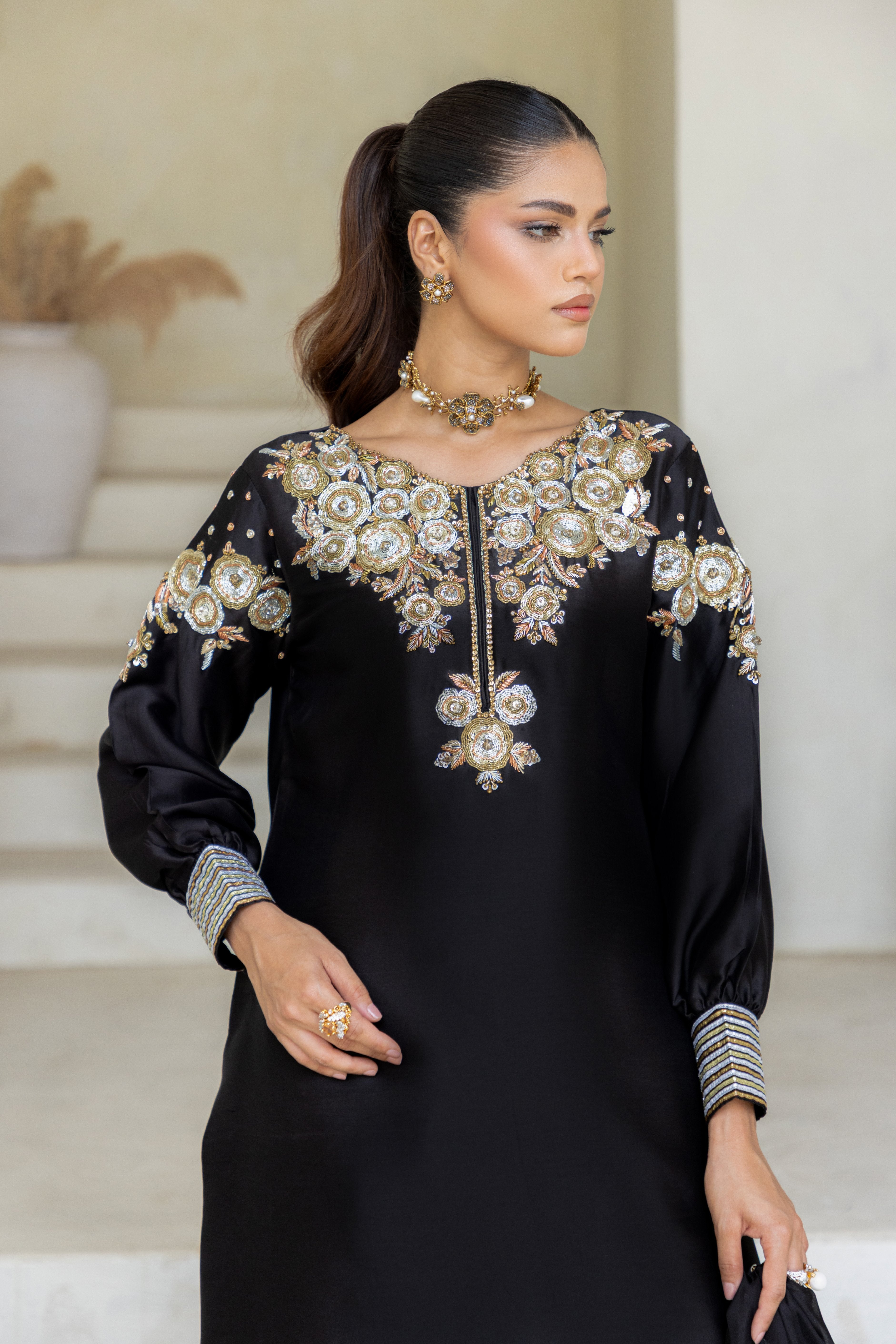 • Shirt: Pure silk with naqshi rosettes, zardozi & mirror detailing
