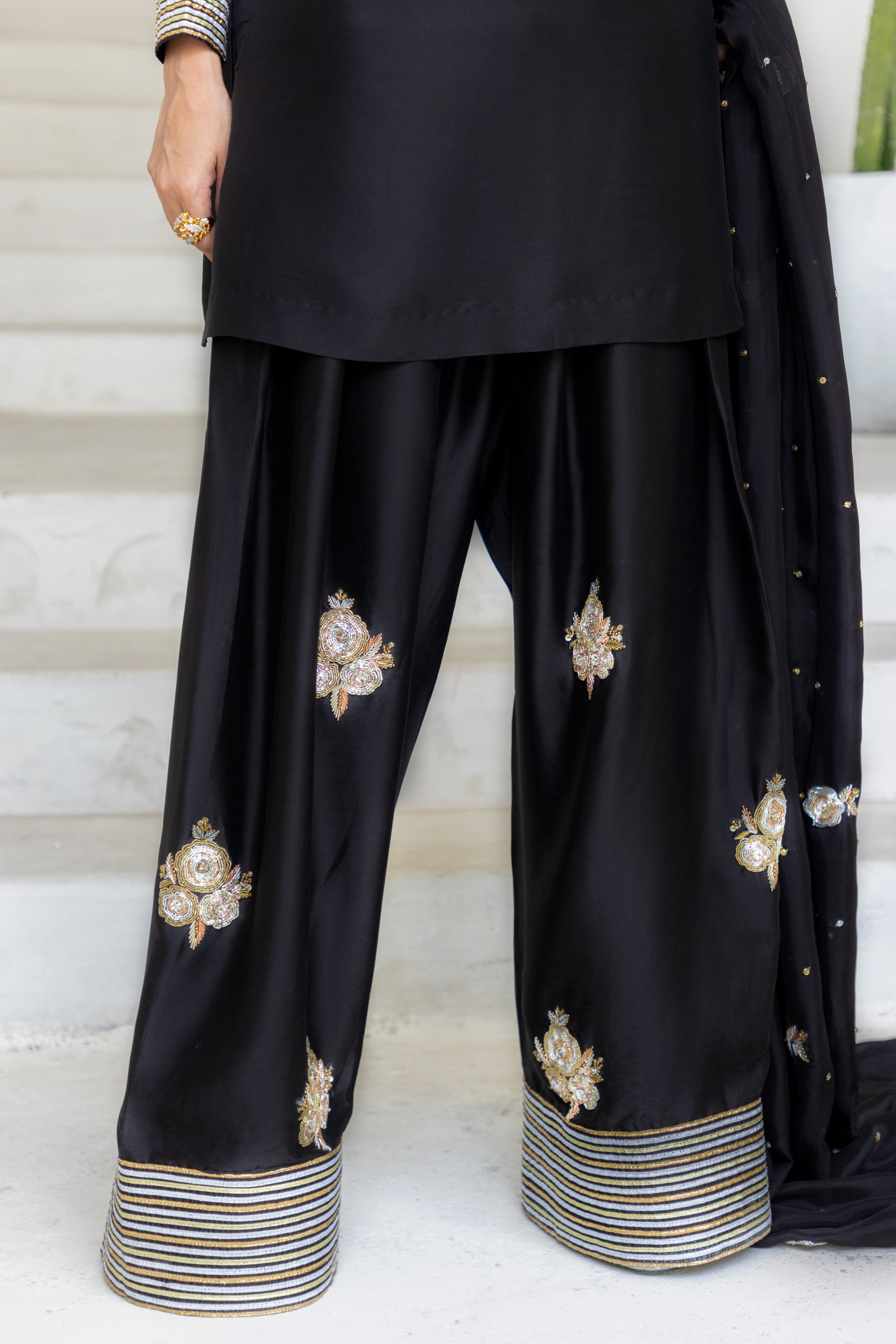 • Trouser: Pure silk farshi shalwar with rosette motifs & dhanak hemline
