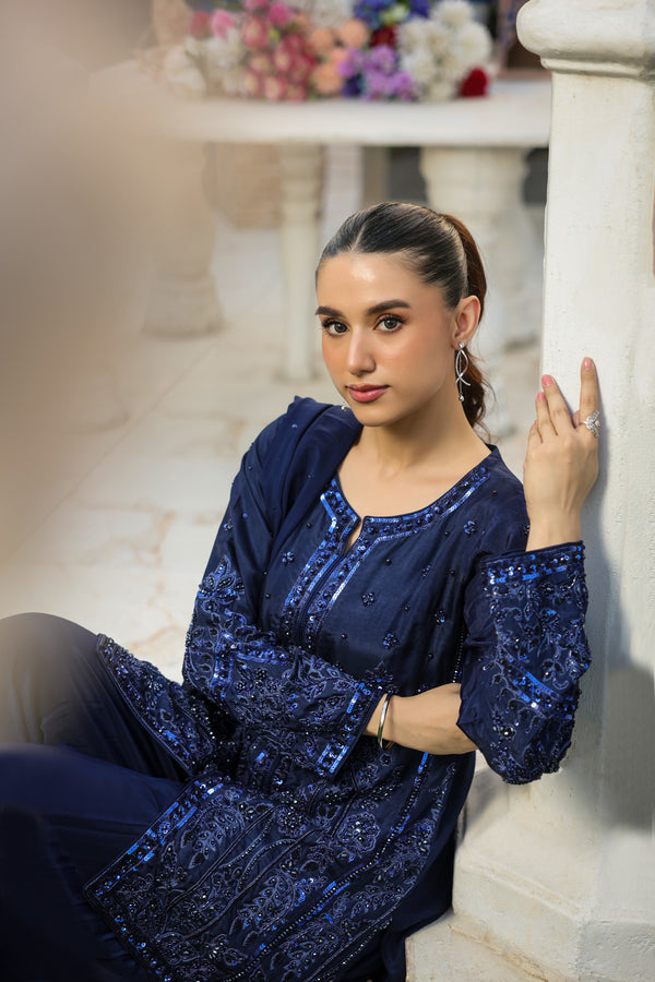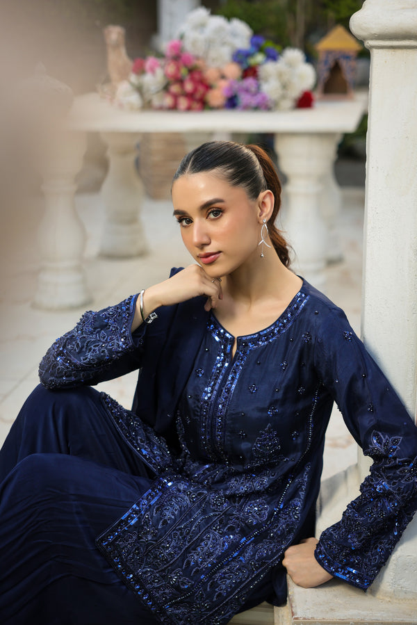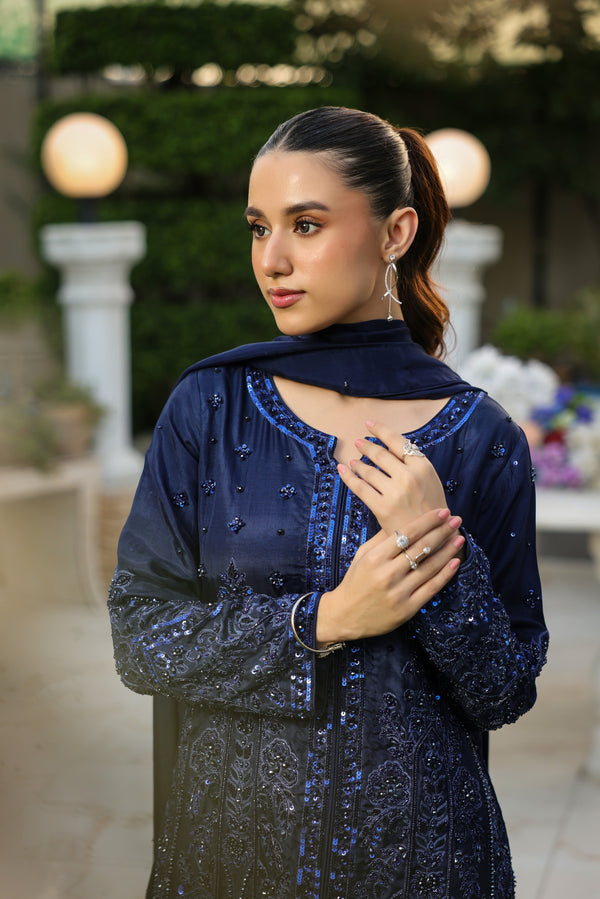 Draped in premium sheesha silk, MIDNIGHT BLOOM is where exquisite heavy pearl artistry meets regal sophistication — adorned with intricate resham, luminous sequins, and tone-on-tone dabka with elegant dhaka pajama.