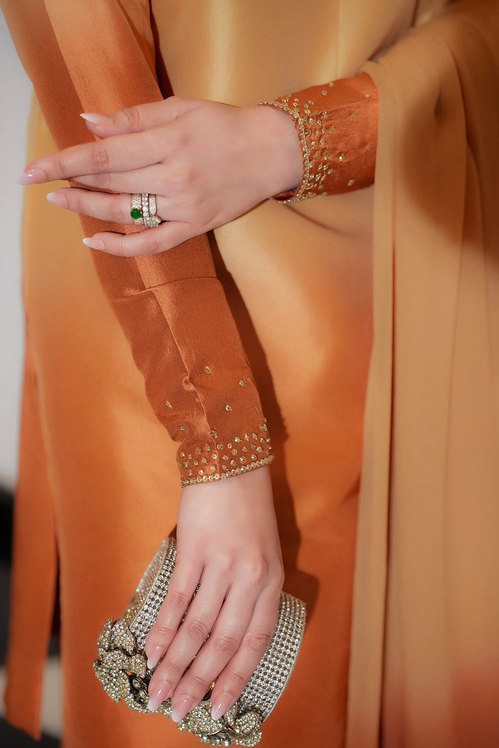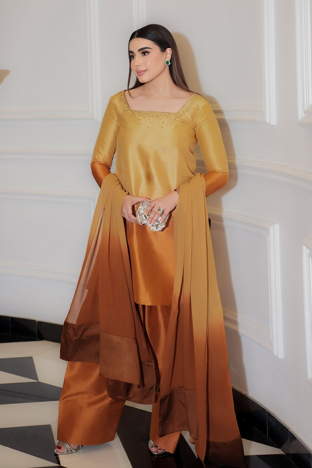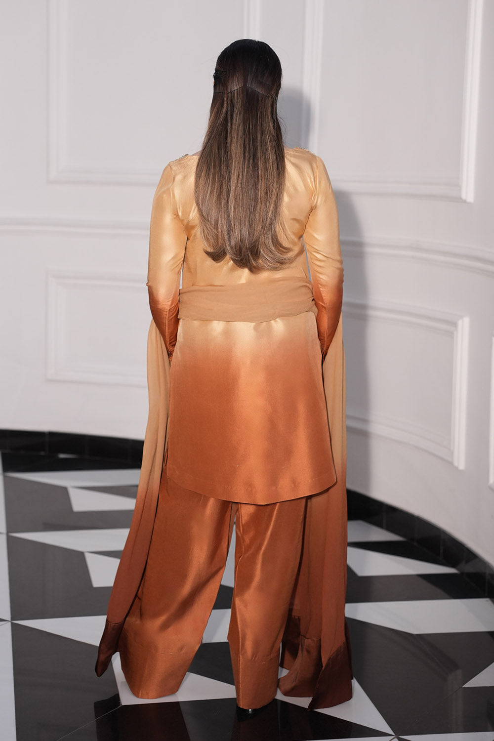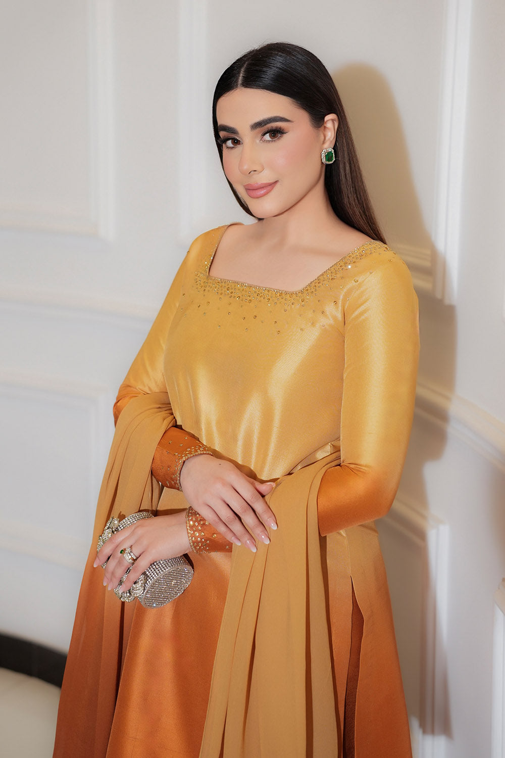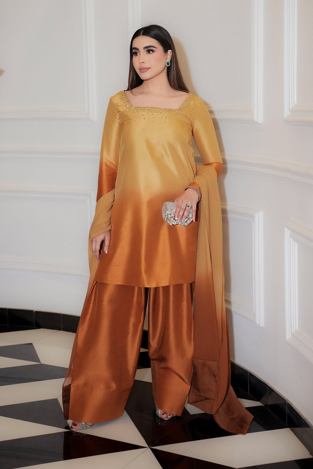A striking expression of high fashion, this ensemble features a short shirt paired with a voluminous farshi shalwar and a flowing chiffon dupatta, presented in a vibrant tangerine hue. The shirt and shalwar are tailored from luxurious tissue Korean silk, offering a luminous texture with an airy yet graceful fall, while the georgette chiffon dupatta introduces a light, ethereal contrast. Refined embellishments of satin-finish Swarovski crystals and shimmering crystals accent the silhouette, adding a subtle yet radiant sparkle. Bold yet elegant, this look blends traditional craftsmanship with contemporary couture, making it a standout statement for festive and formal occasions.