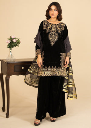 Crafted from luxurious velvet in a timeless jet black, Muse is designed for bold winter sophistication. The regular‑fit short kurta offers a balanced silhouette, paired with palazzo trousers that bring effortless flow and modern elegance. A sheer organza dupatta completes the ensemble, its airy texture contrasting beautifully with the richness of velvet. With no lining for a comfortable finish, this three‑piece outfit embodies refined charm and versatile winter style.