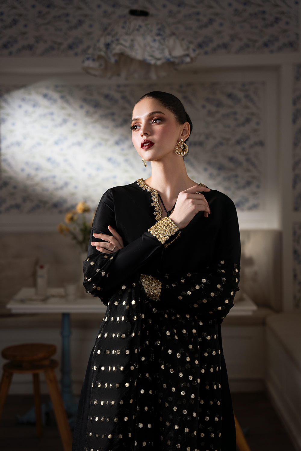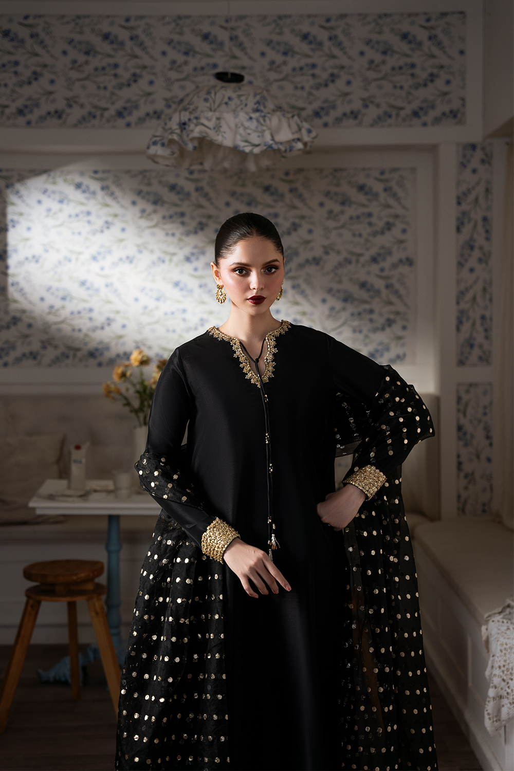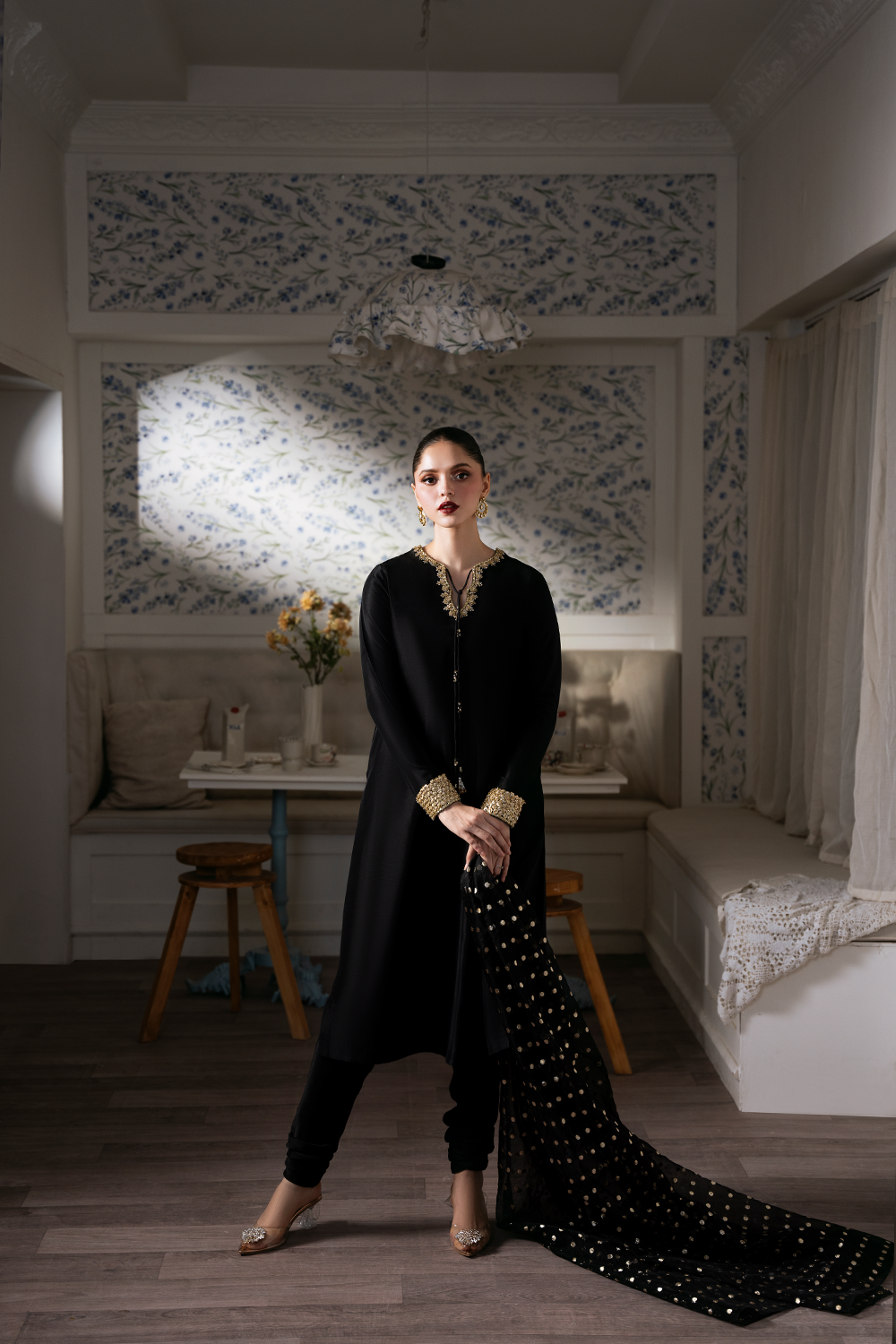 Into timeless tradition with this stunning black long shirt crafted from Step luxurious raw silk. Intricately embellished by hand with shimmering sequins, delicate gota, and exquisite naqshi work, this outfit radiates sophistication and cultural charm. Perfect for Eid or any festive occasion, it comes paired with a matching churidar and a fancy dupatta to complete the look. Celebrate elegance with every detail.