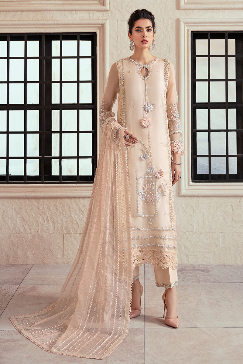 On an understated backdrop of this muted blush tone, our elite craftsmanship shines through. Be a vision of grace in this beautifully decked beige ensemble with 3D flower motifs and lace detailing. The beautifully embellished dupatta further enhances the look. Finish off with matching pants for a perfect look for the upcoming festive season!