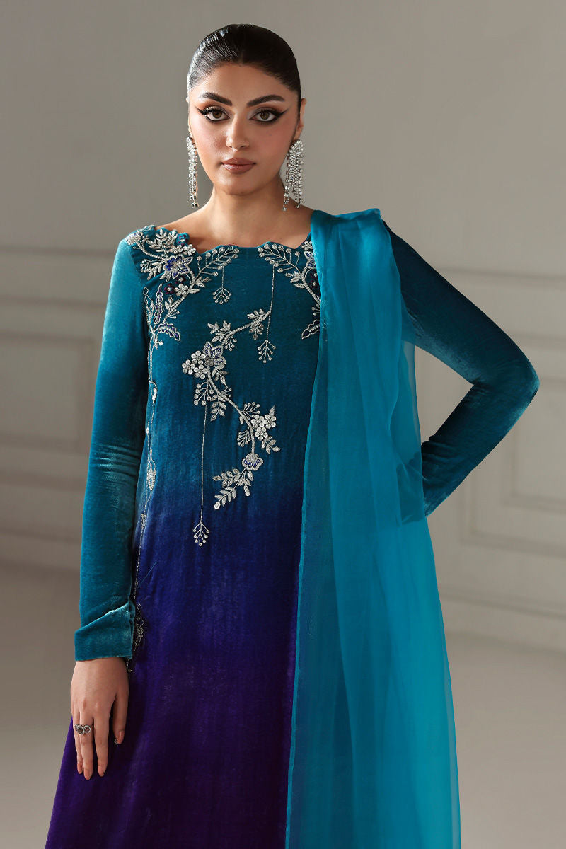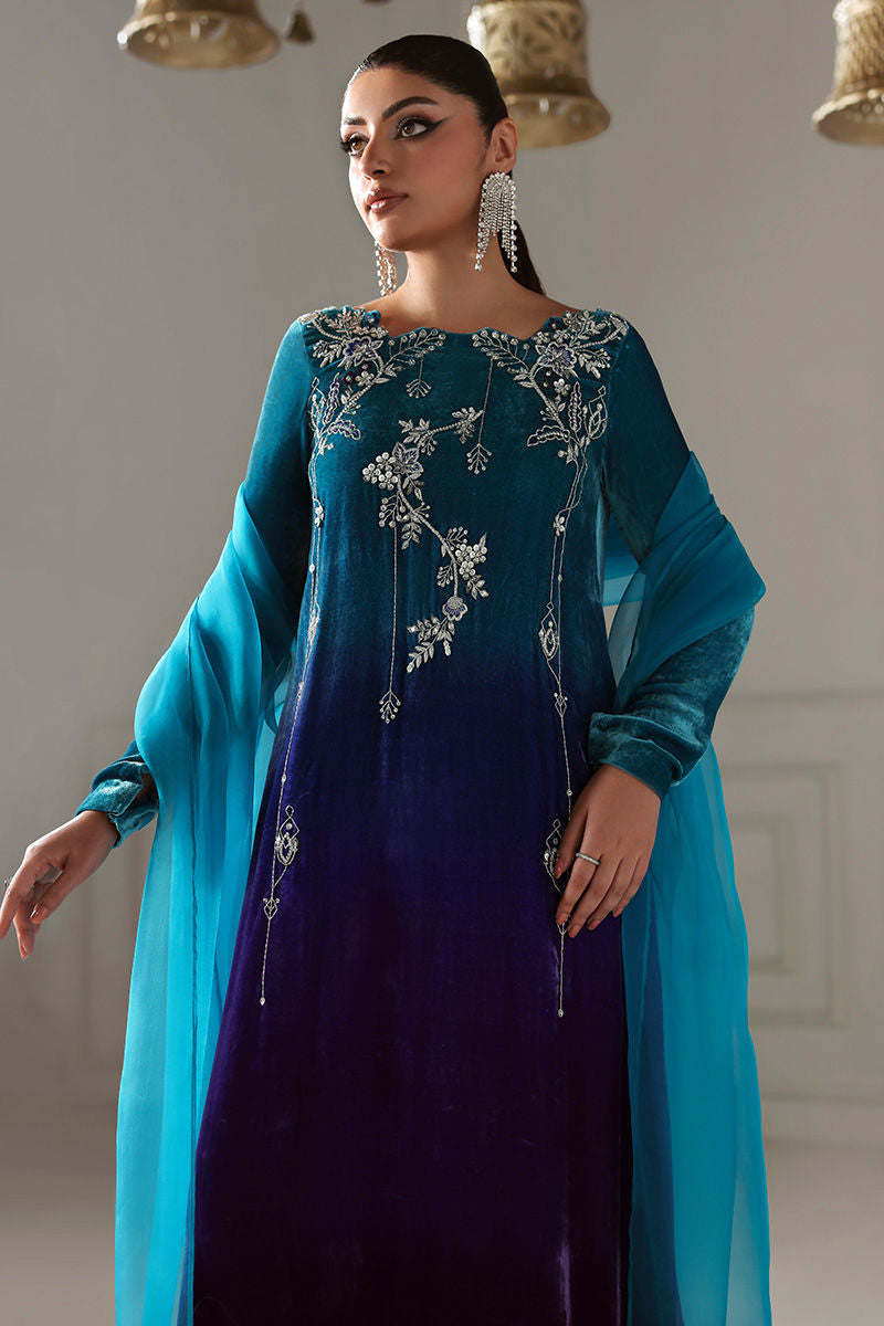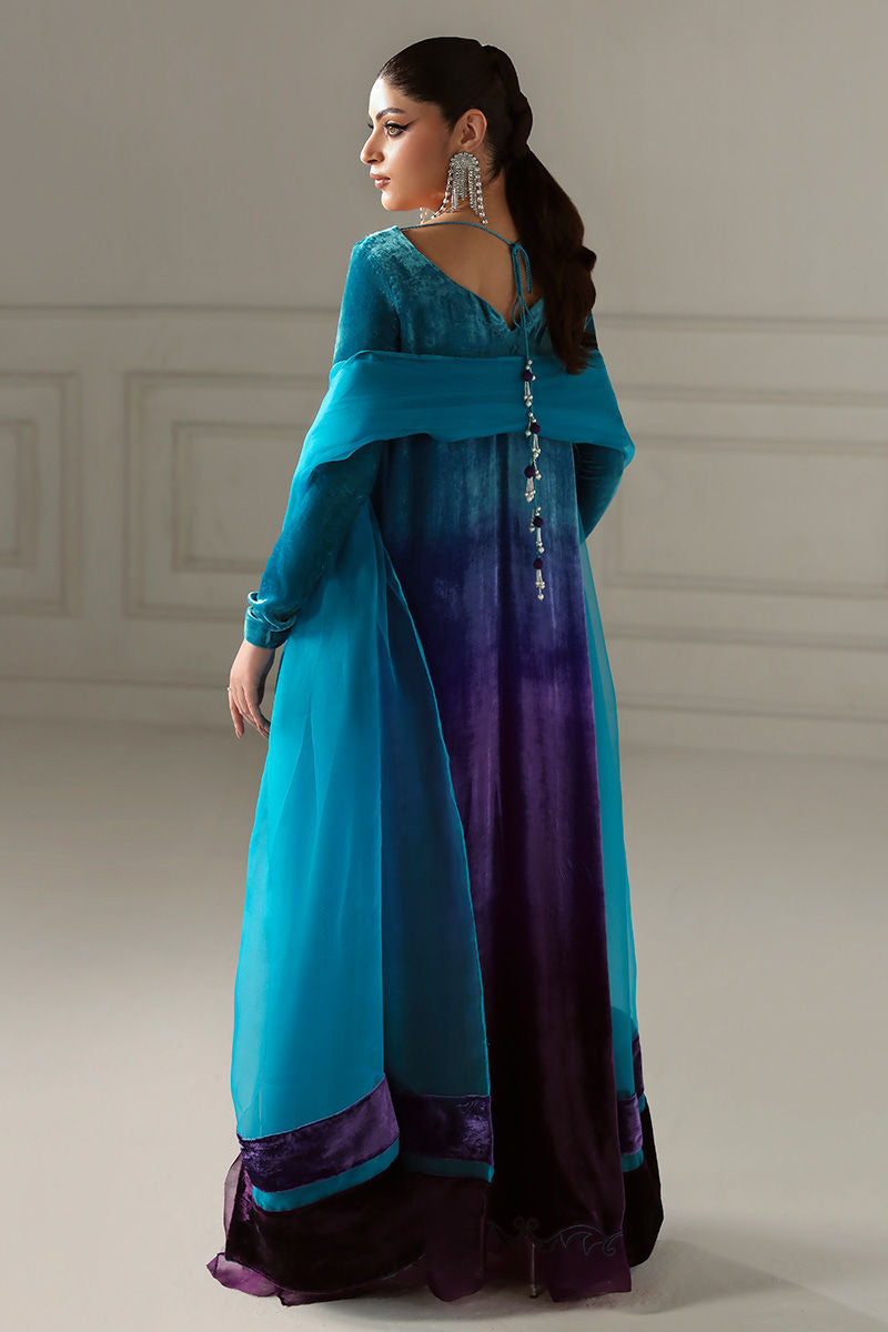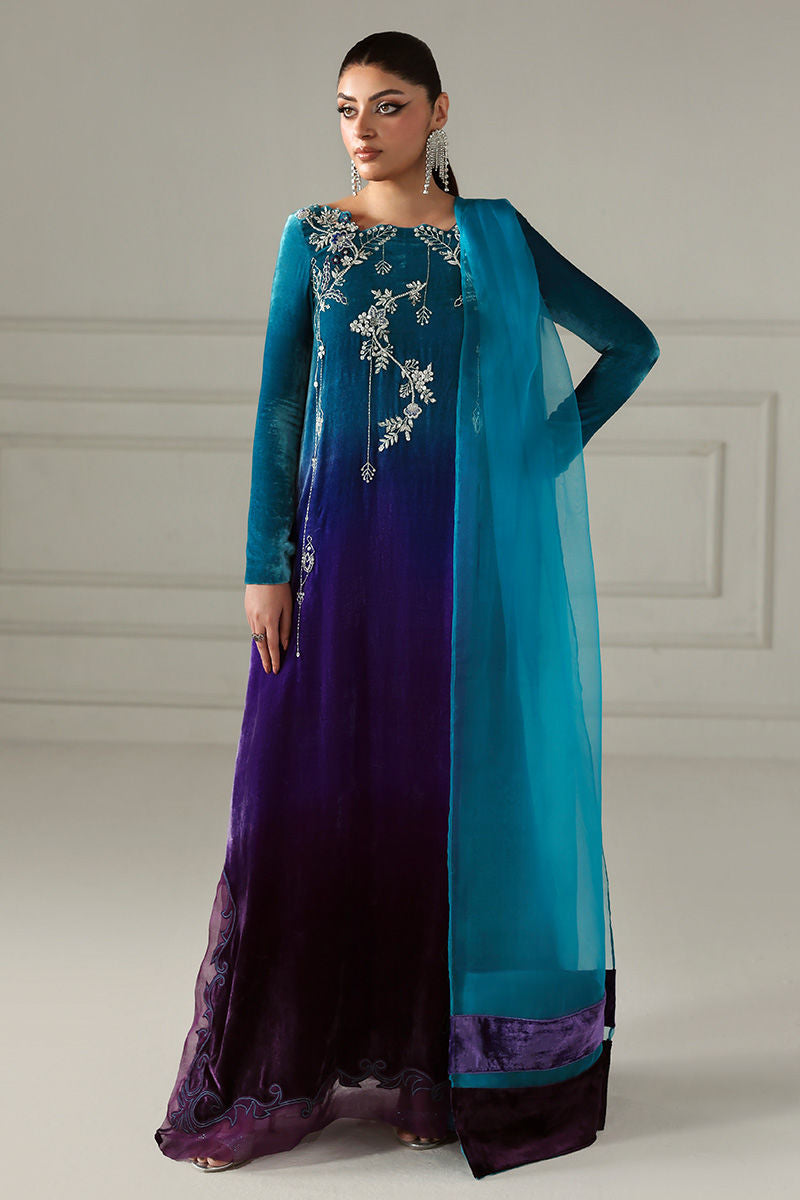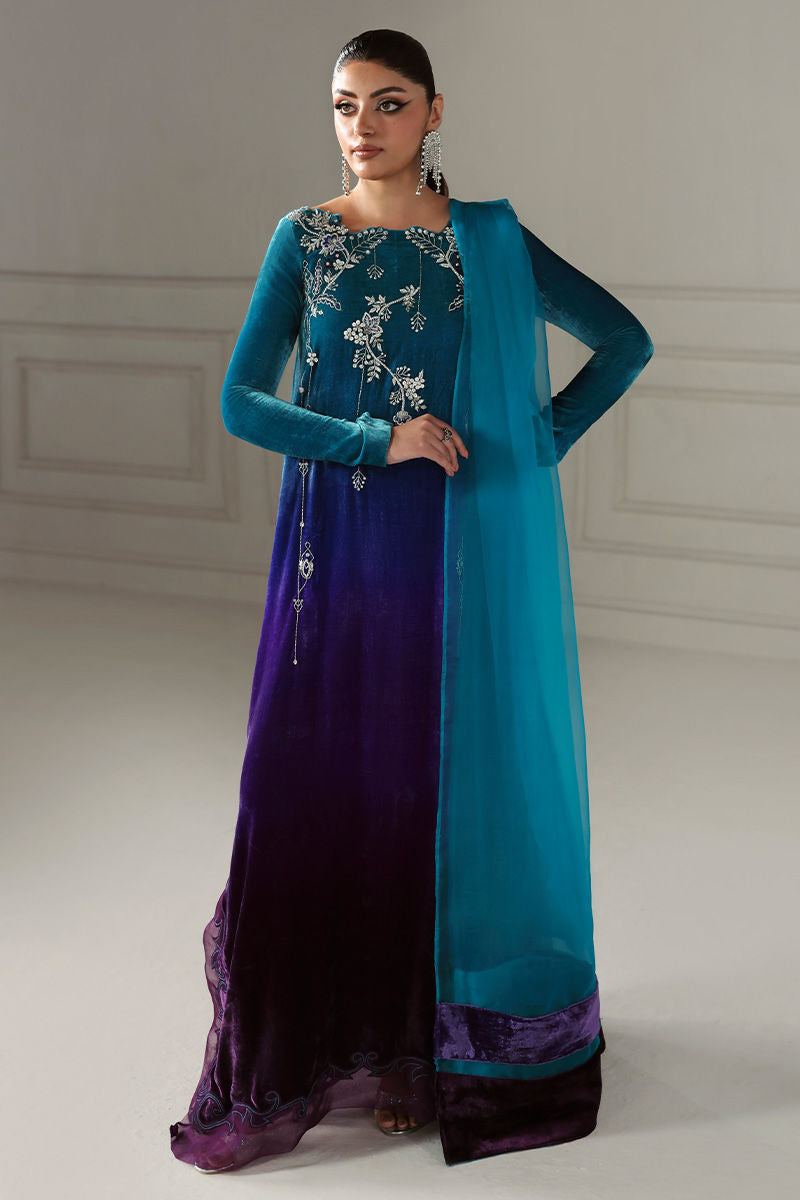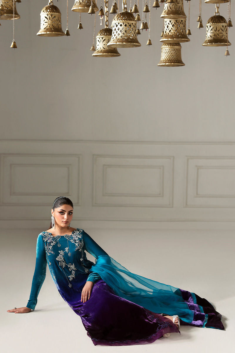 Draped in pure velvet, NORELLE is where graceful gradient meets ethereal elegance — featuring stunning ferozi and purple ombre with embroidery and floral stem-shaped embellishments, paired with pure medium organza dupatta for flowing, sophisticated presence.
