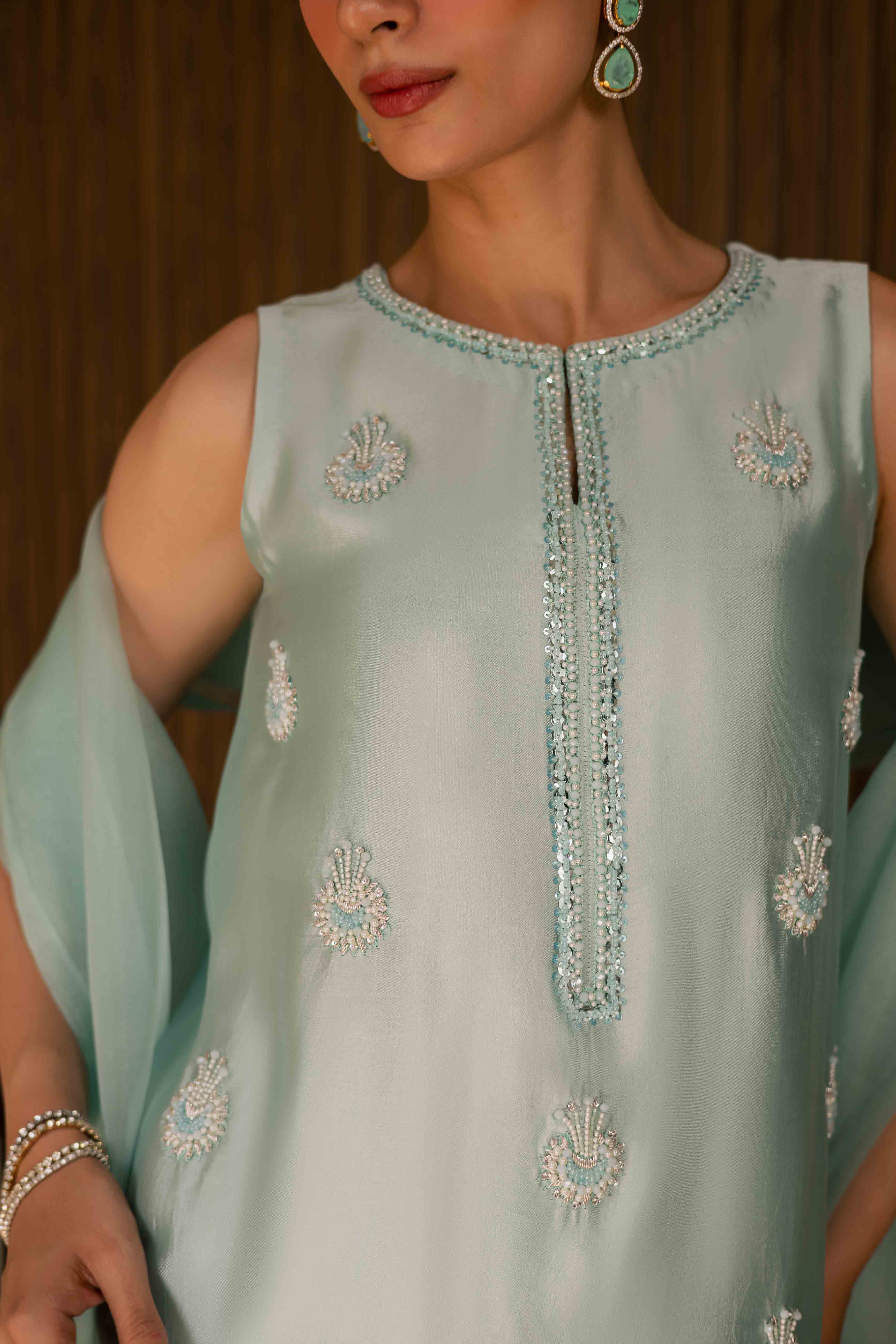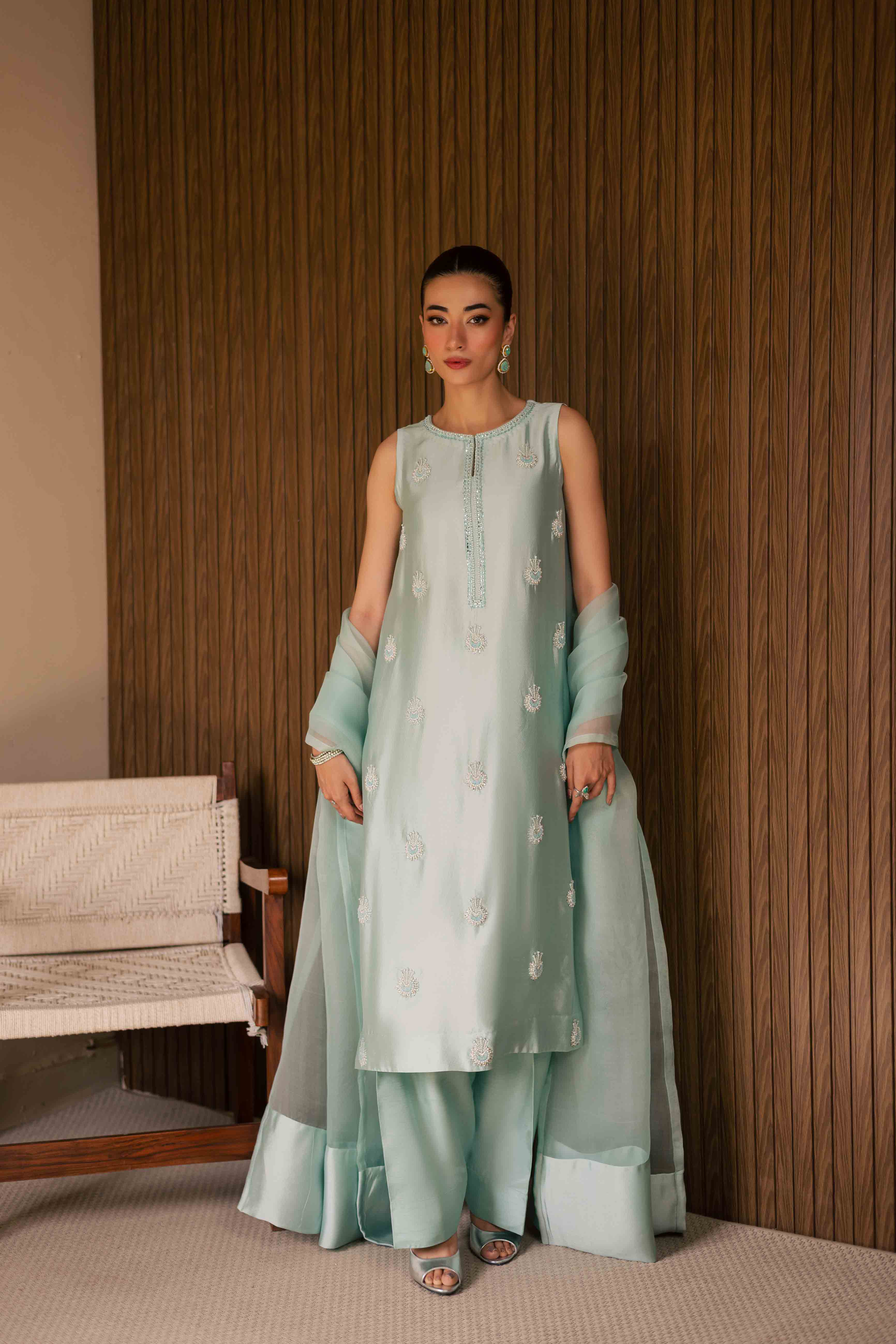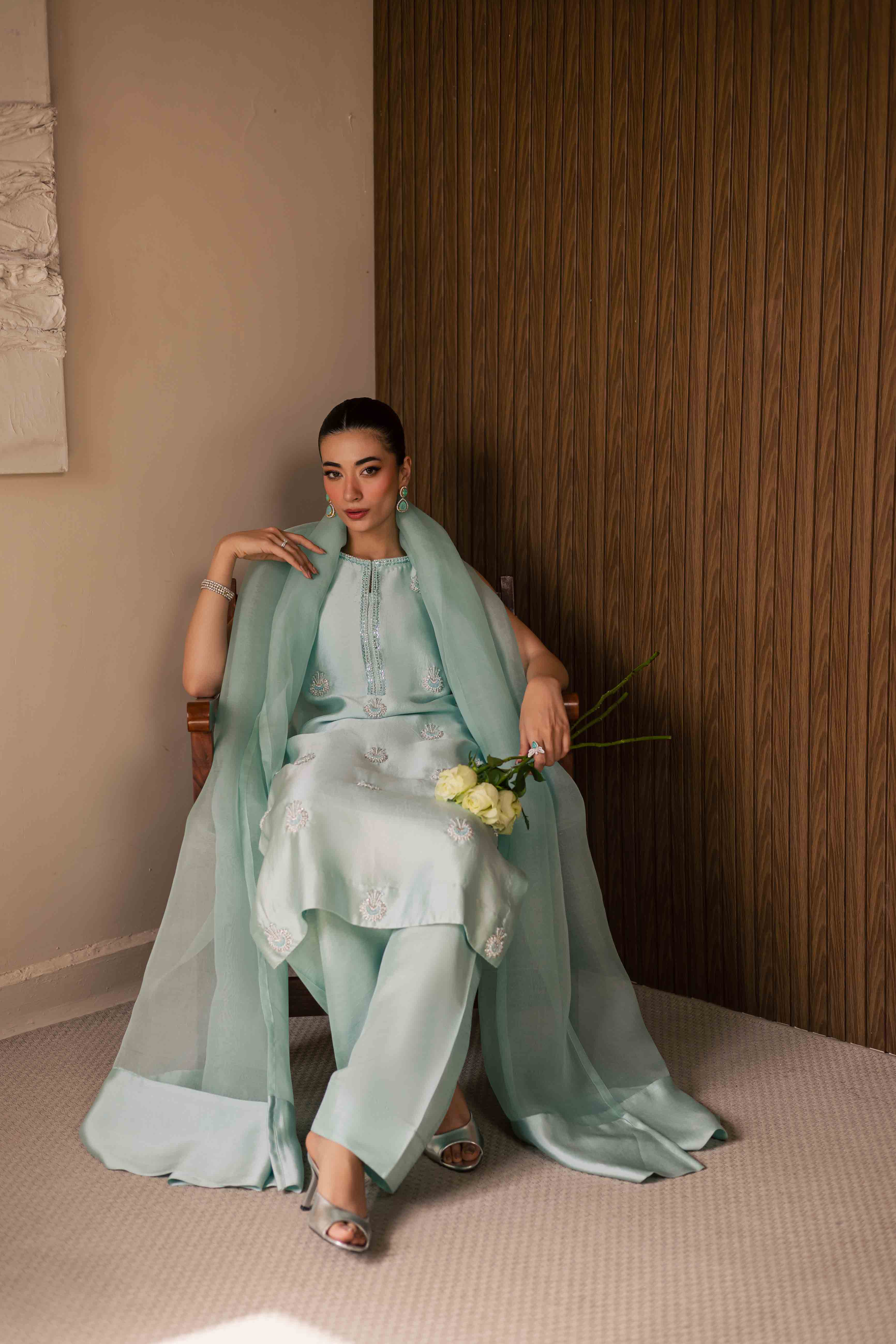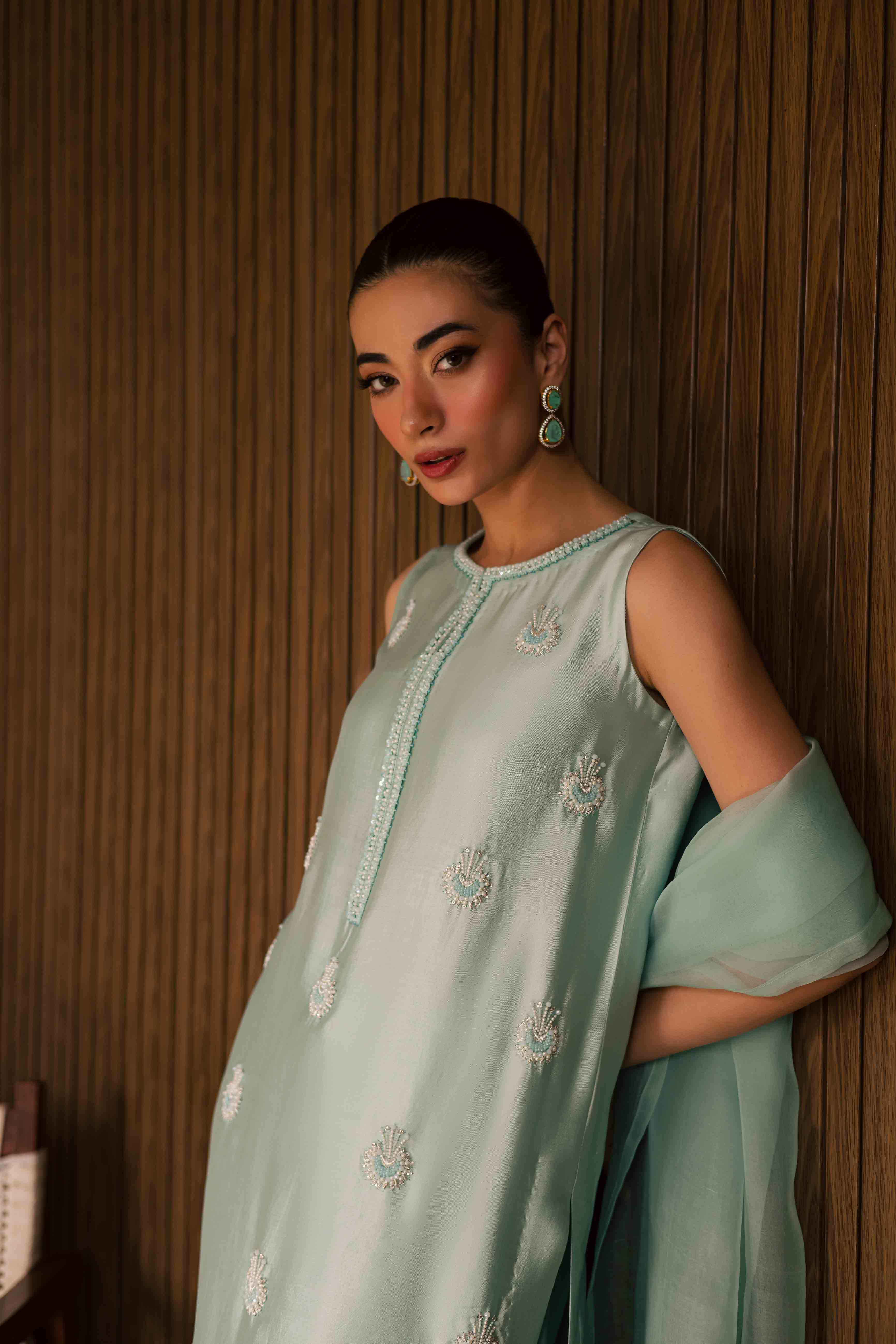 Draped in luxurious fabric, OPAL is where hand-crafted artistry meets elegant sophistication — featuring long shirt with fully hand-crafted embellished front adorned with pearls and crystals, paired with traditional shalwar and pure organza dupatta for refined, luxurious presence.