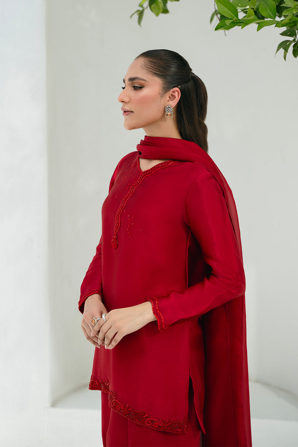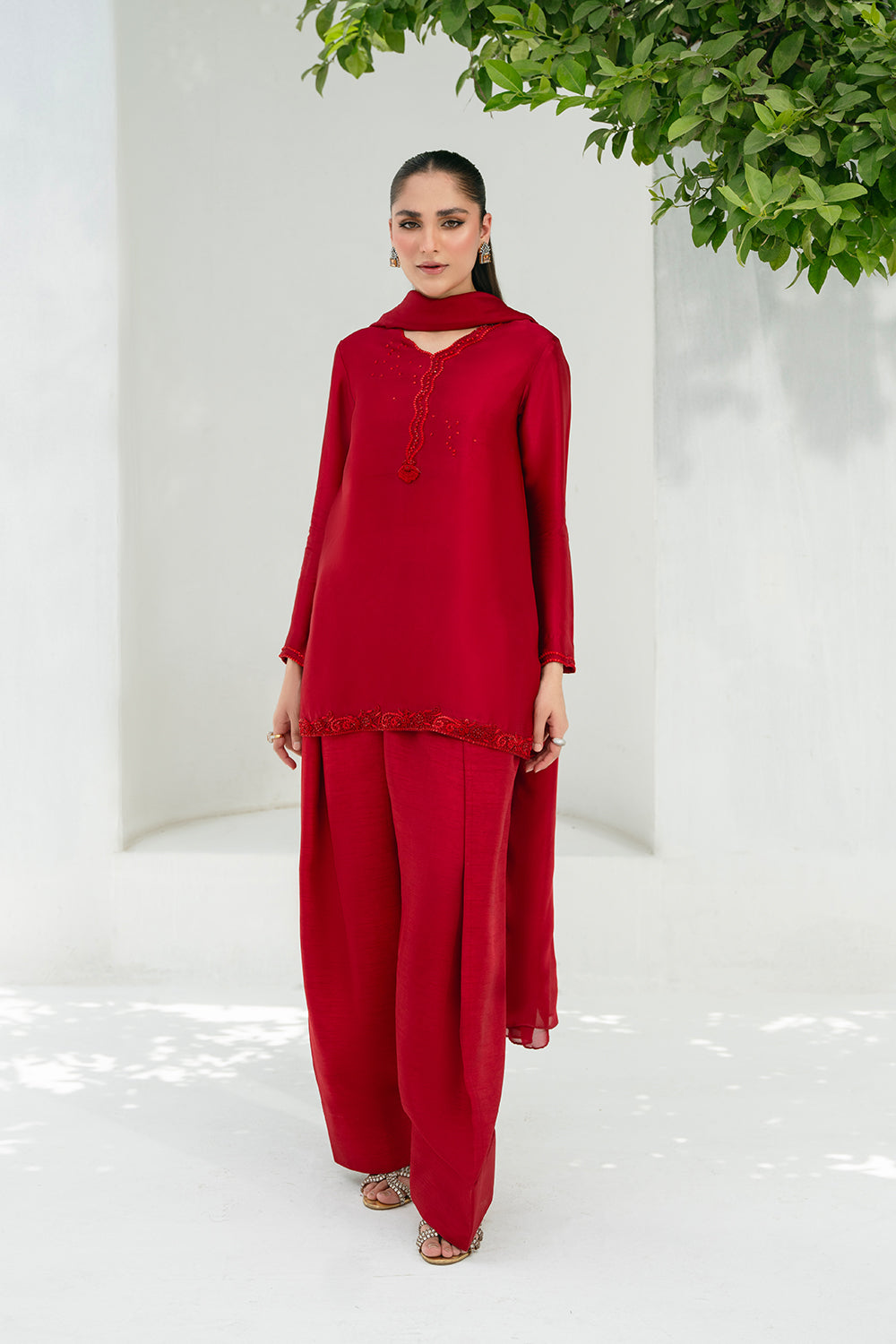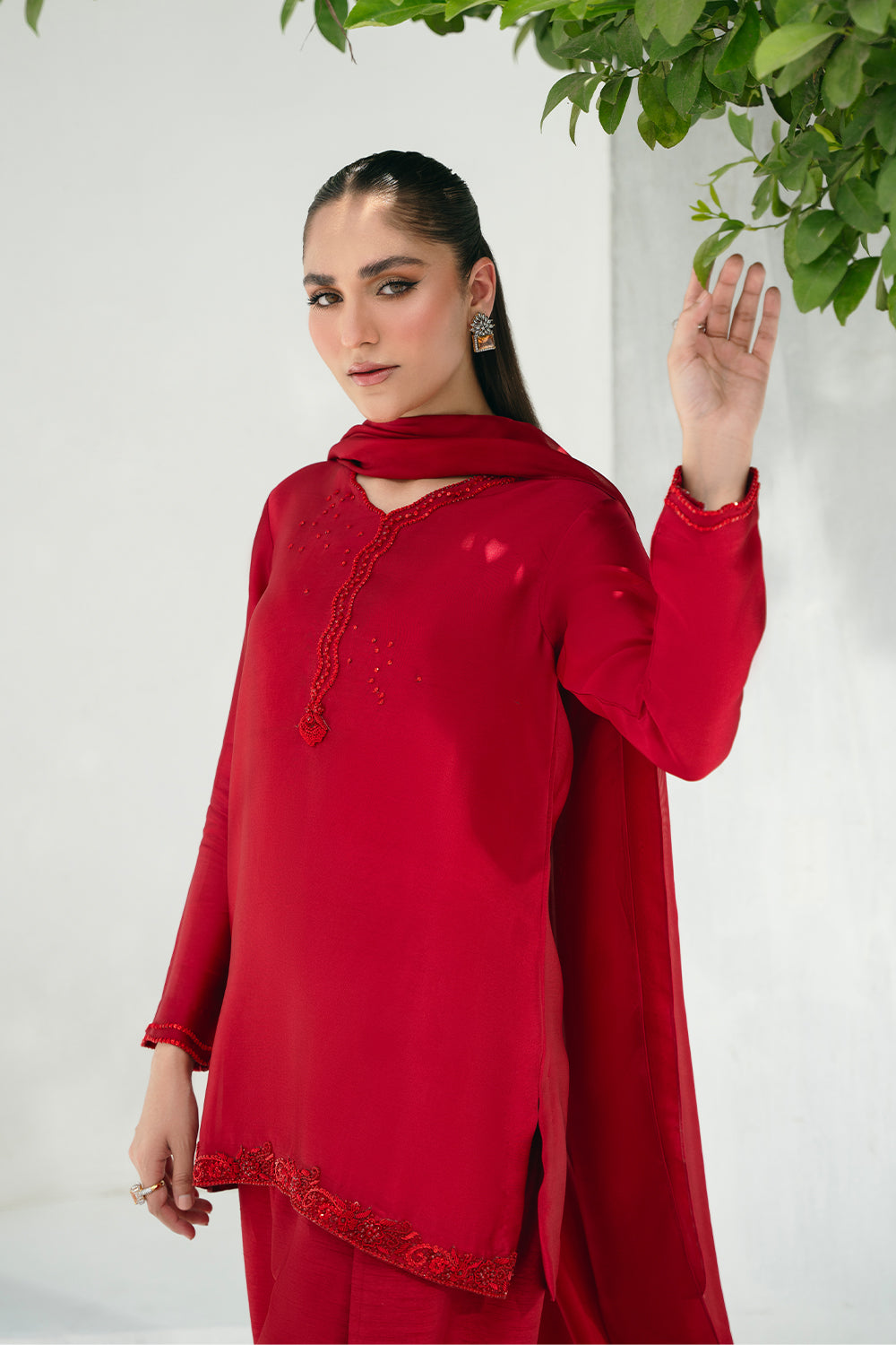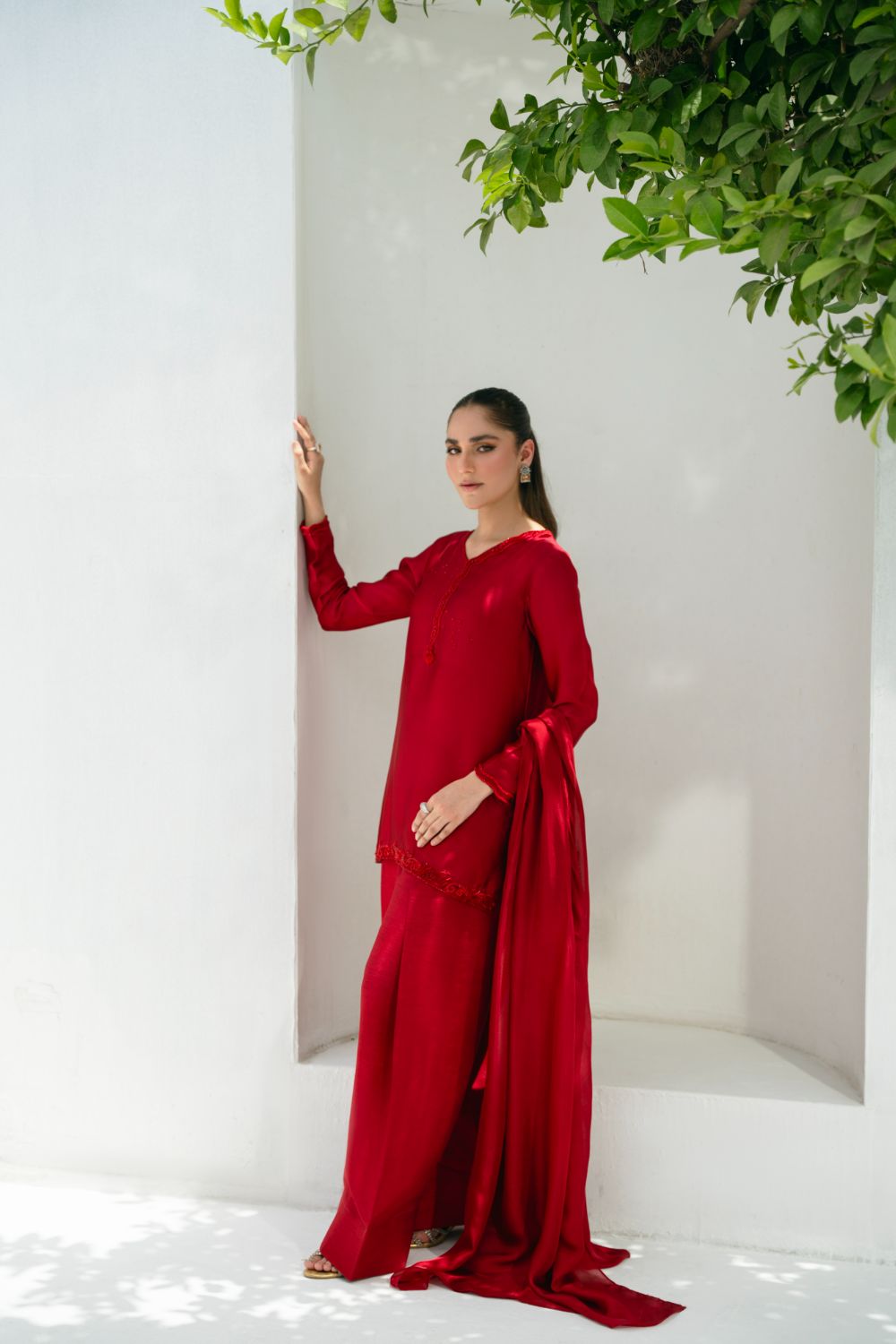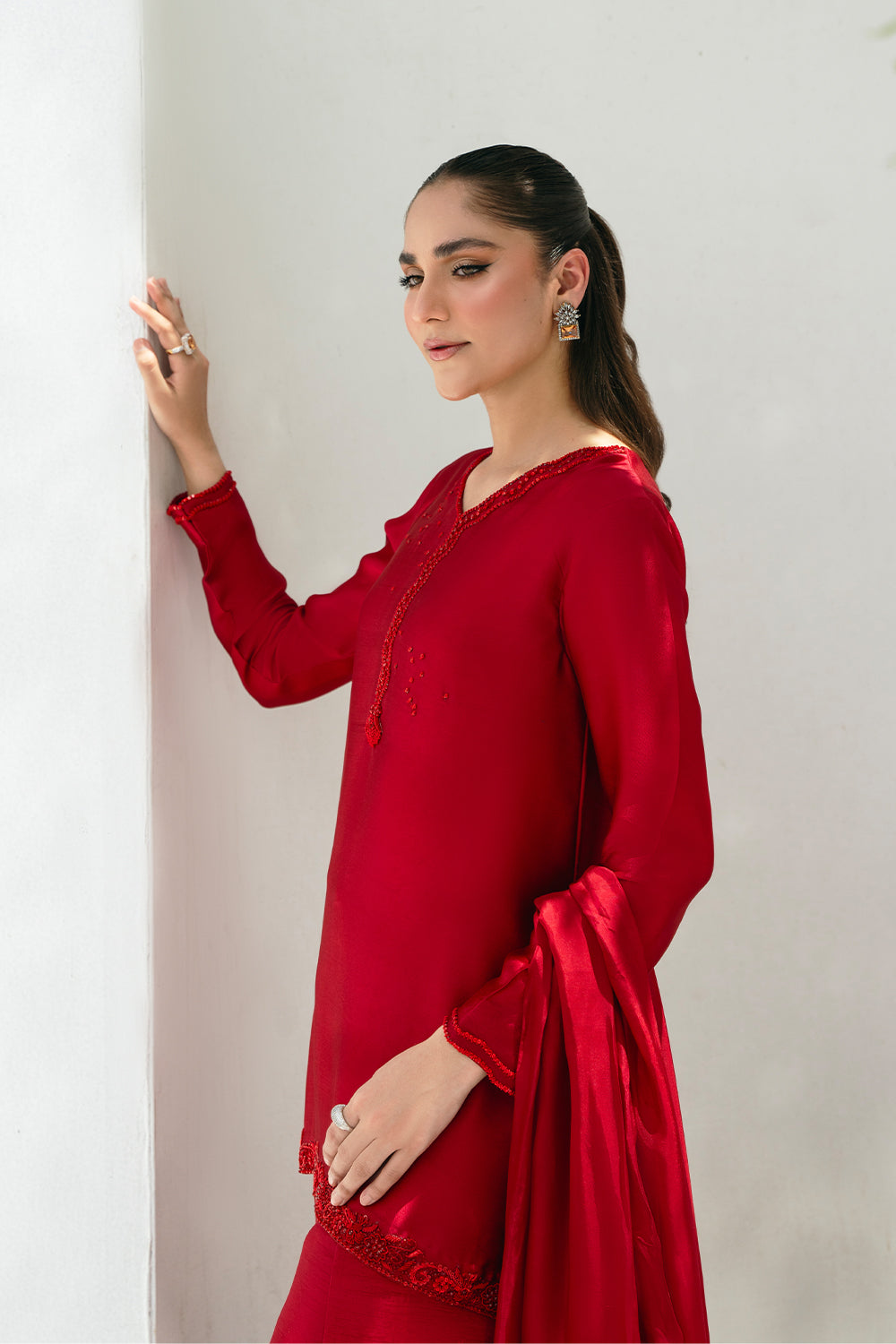 Draped in pure sheesha silk, RAMEESA is where refined craftsmanship meets timeless sophistication — featuring beautifully tailored shirt with medium silk dupatta and Korean raw silk farshi shalwar for elegant formal charm.