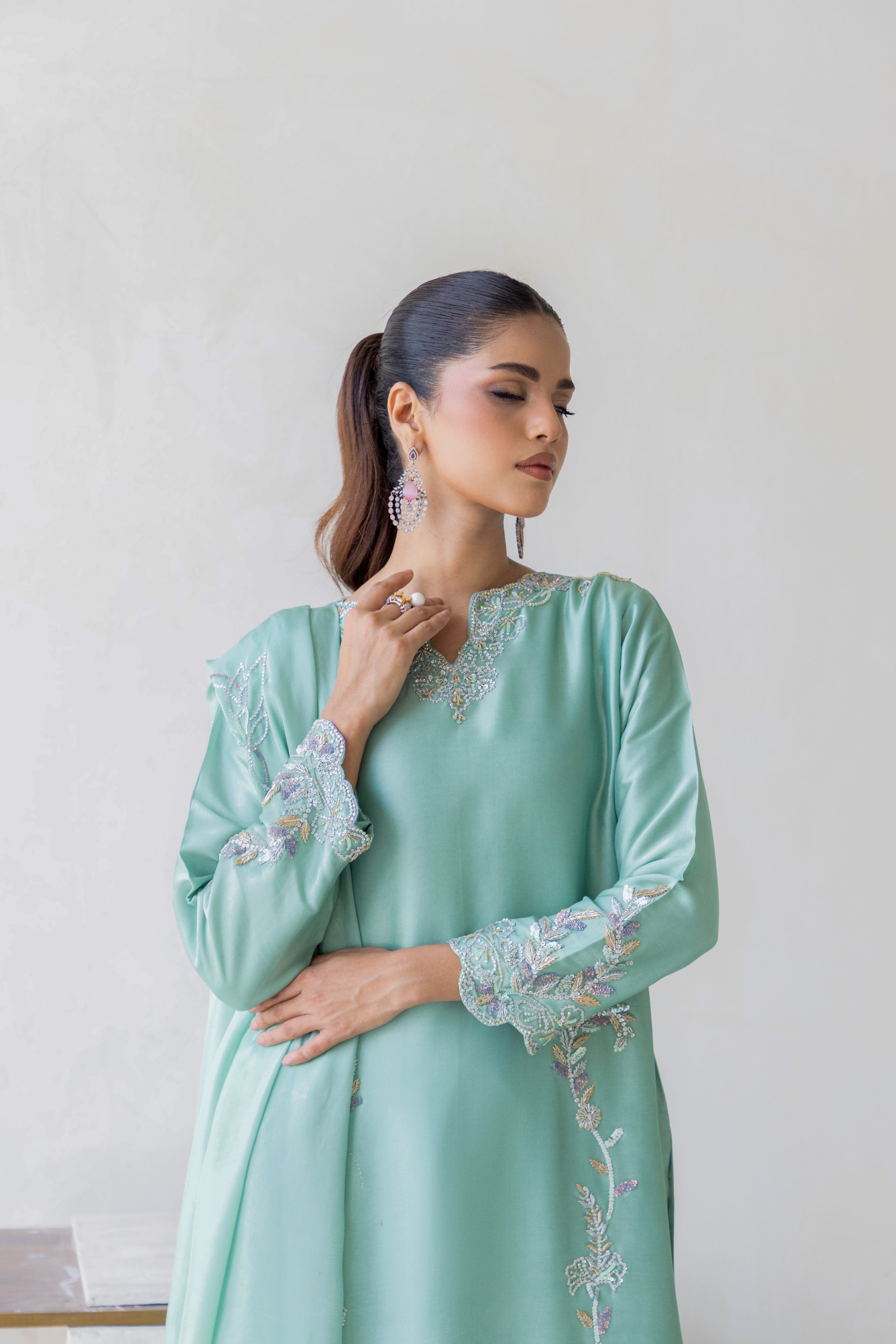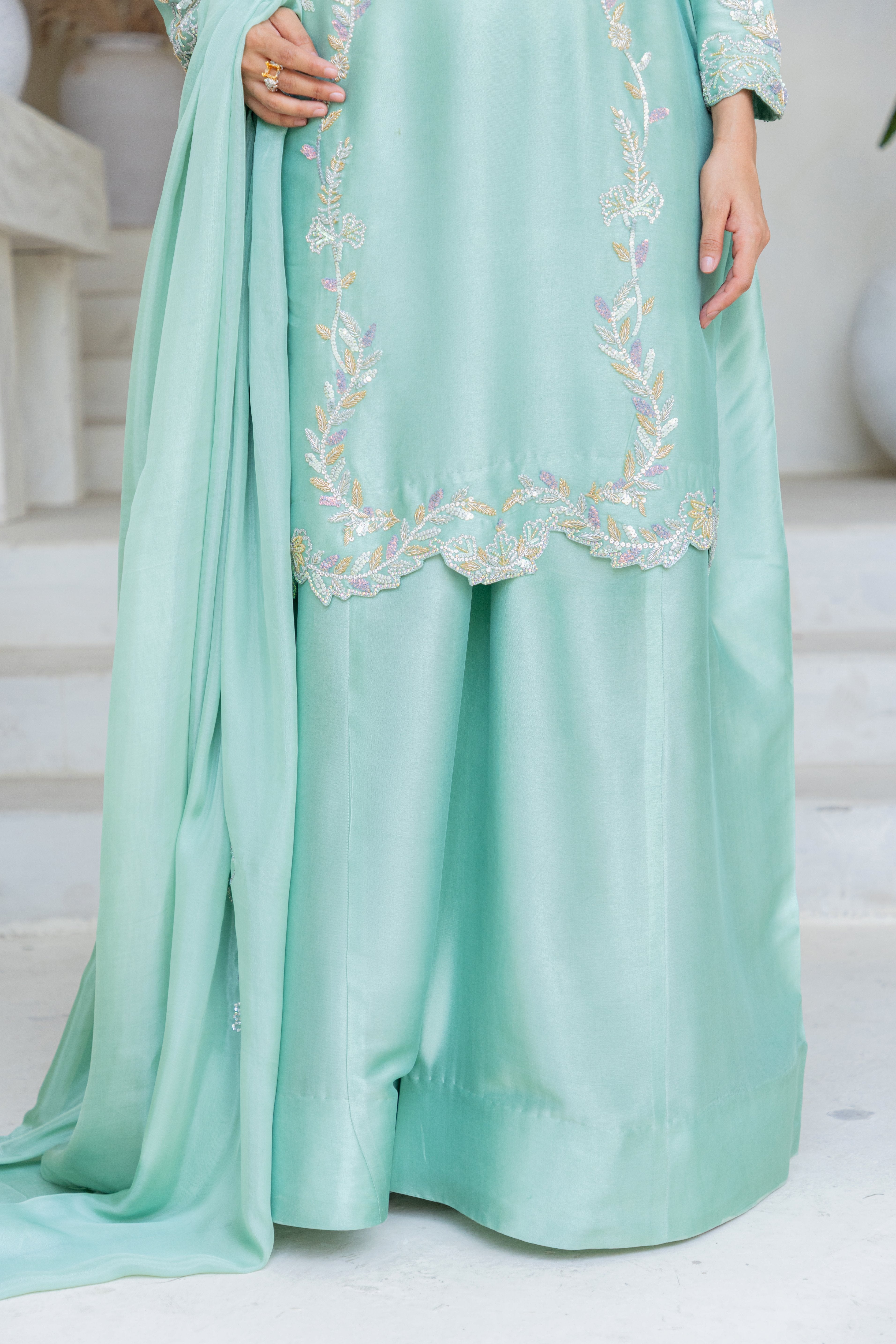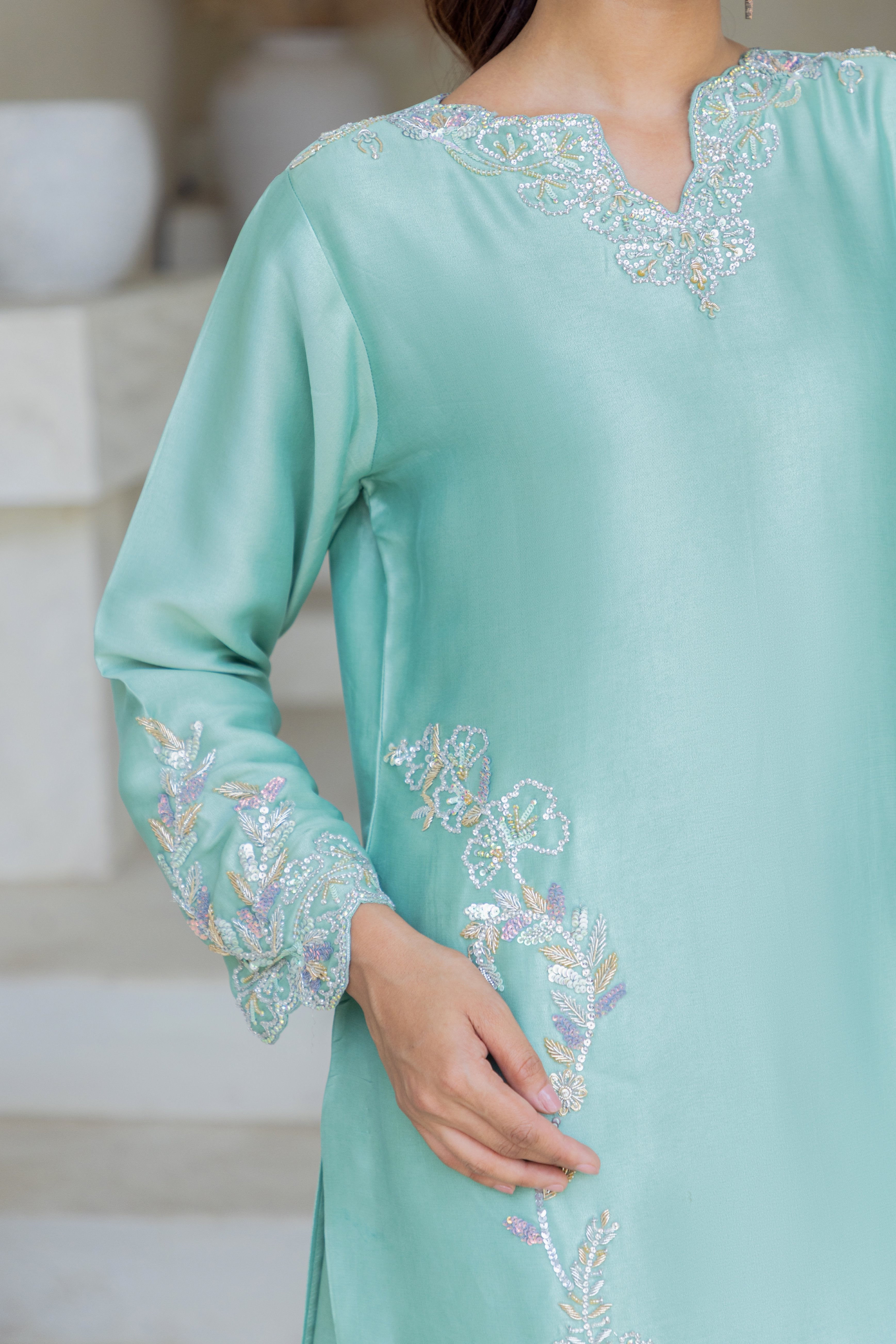 • Shirt: Mint green with Swarovski stones, zardozi & aari embroidery