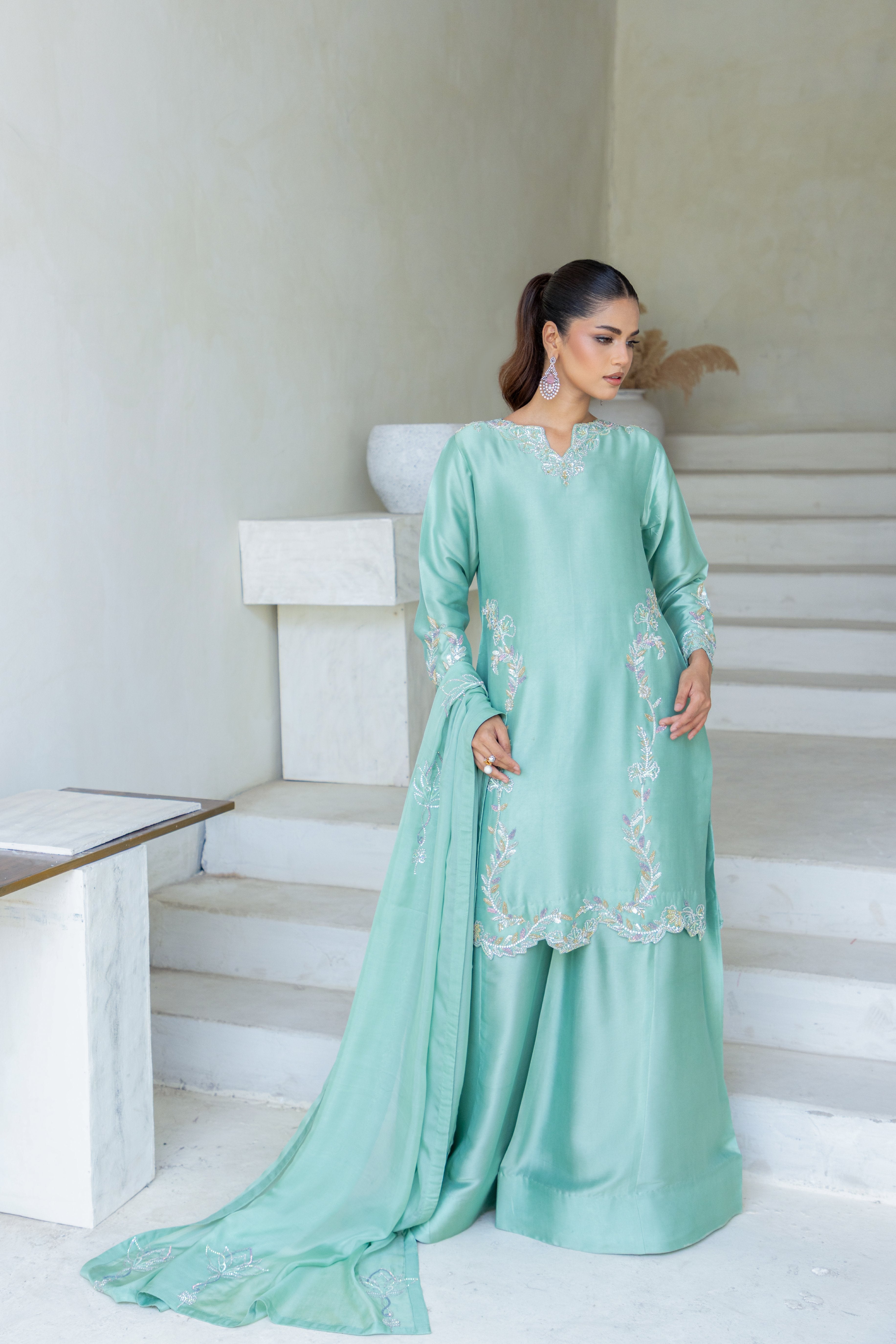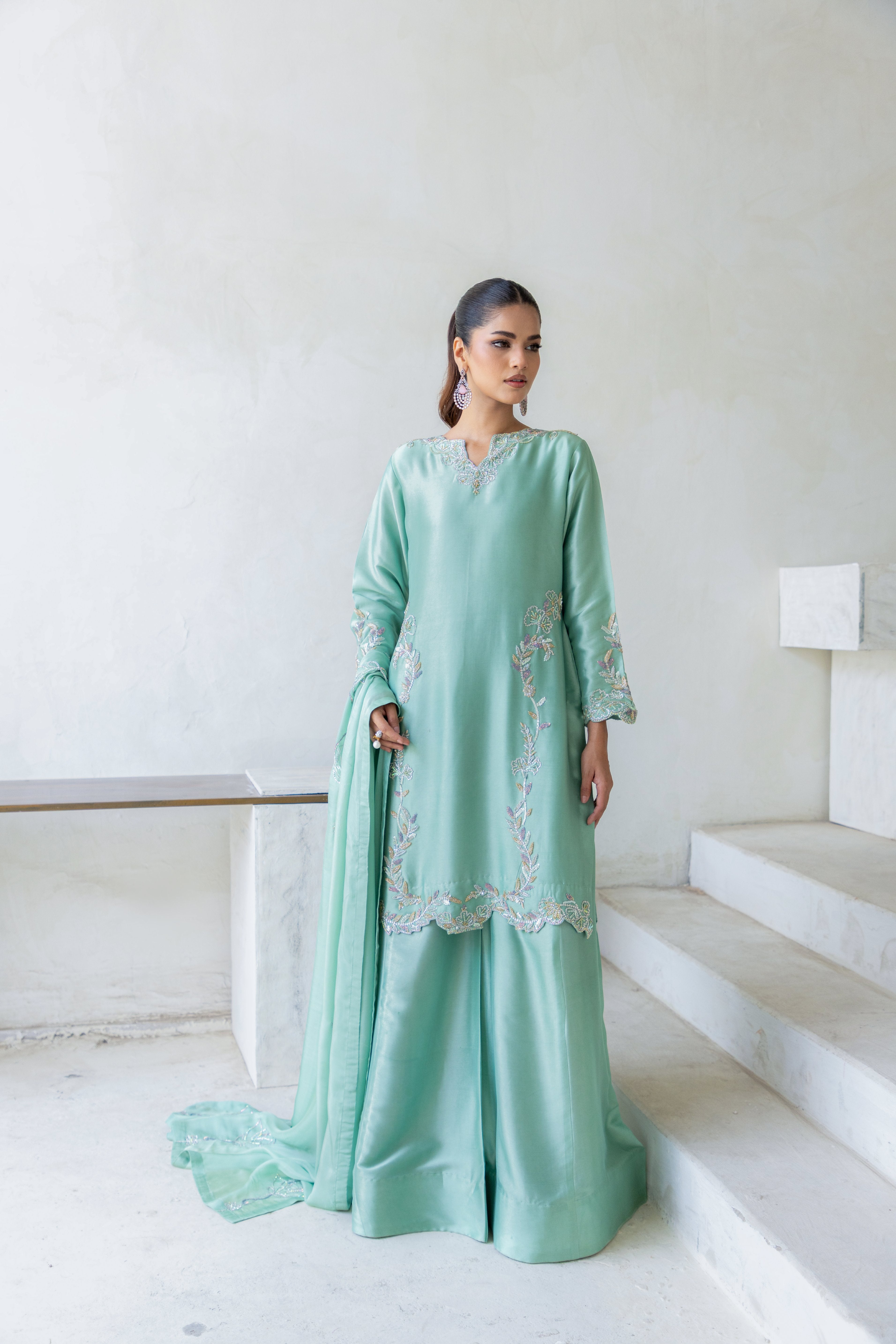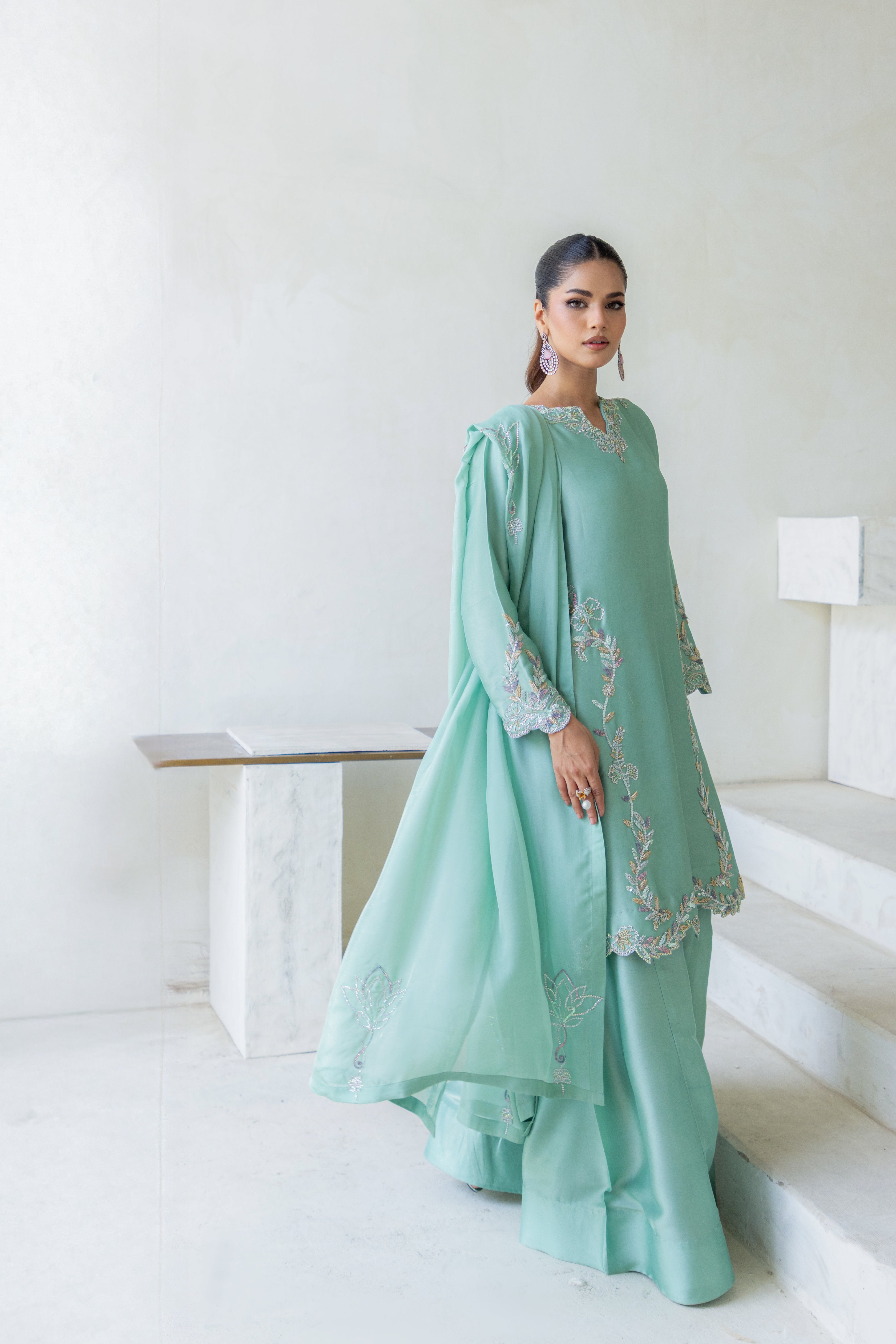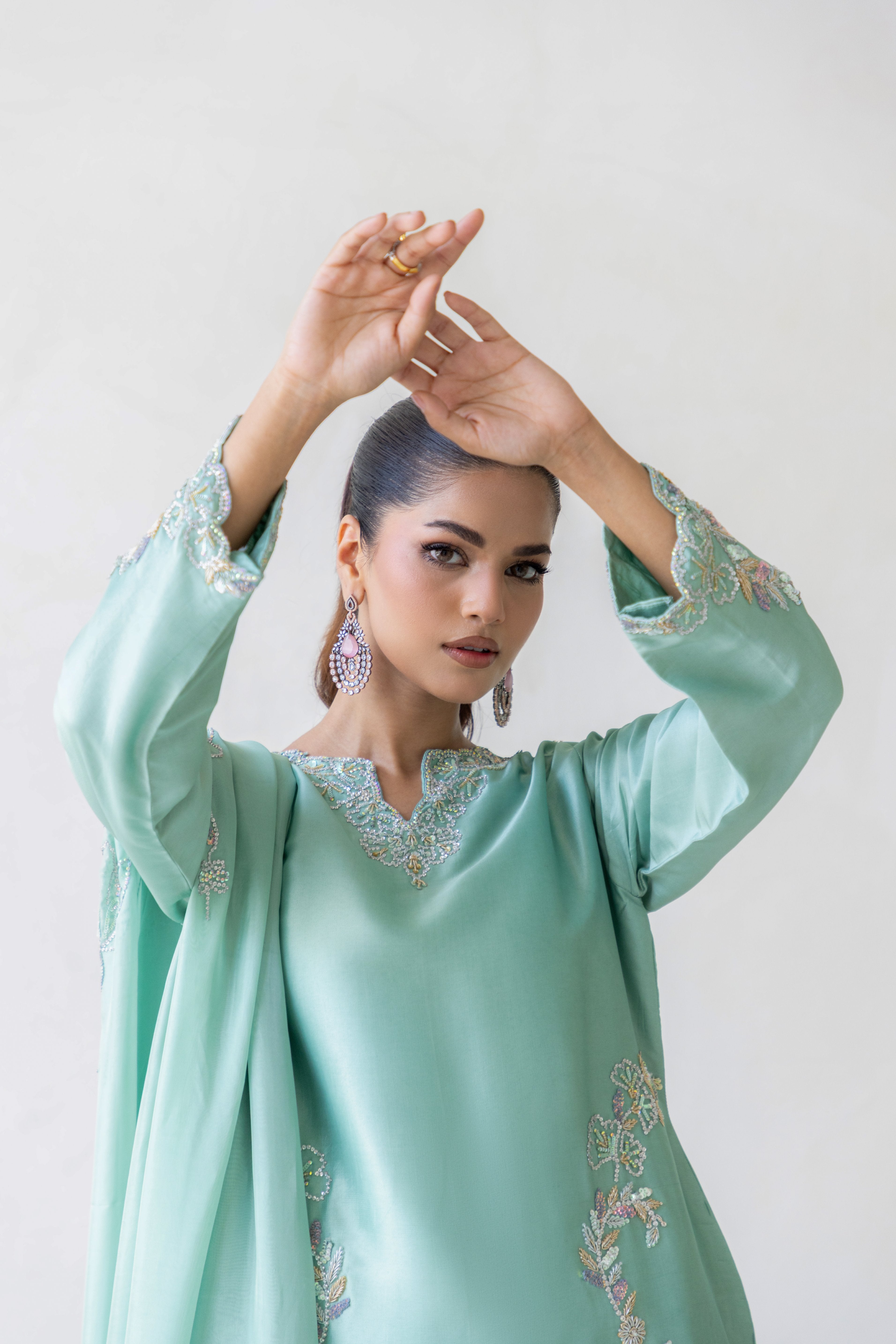 • Shirt: Mint green with Swarovski stones, zardozi & aari embroidery