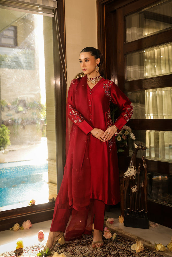 Draped in pure sheesha silk, ROSELLA is where intricate hand embellishment meets bold celebratory charm — adorned with sequins, resham, salma, and stone embellishment for rich, festive sophistication.