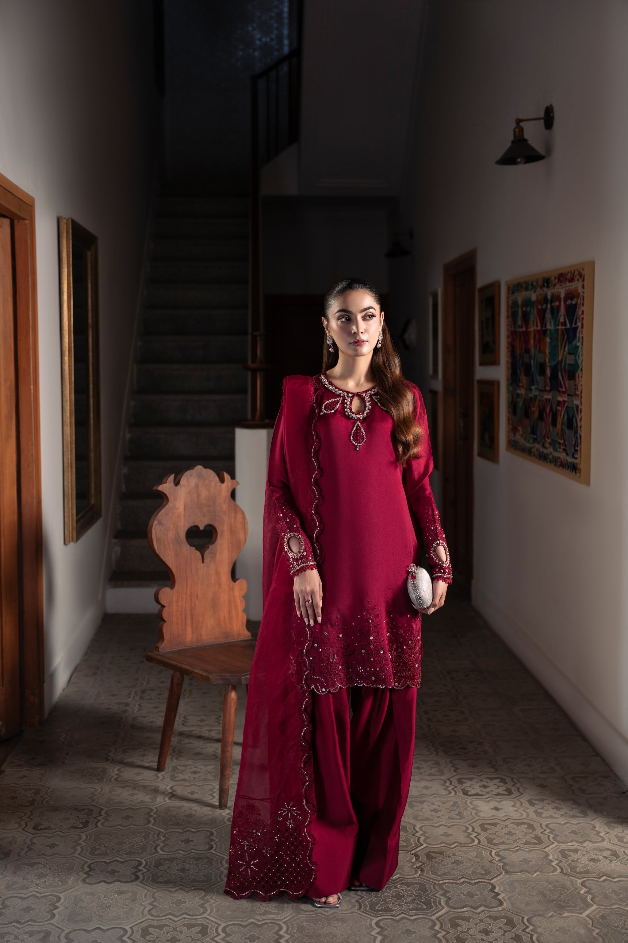 ROSETTE is crafted from pure shisha silk in a rich wine-cherry hue, exuding regal sophistication. The shirt features hand-embellished neckline, sleeves and hem, adorned with crystals, sequins, dabka and beads. The hem also features intricate embroidery and cutwork detailing.