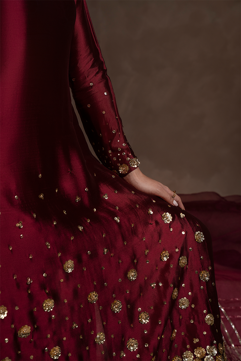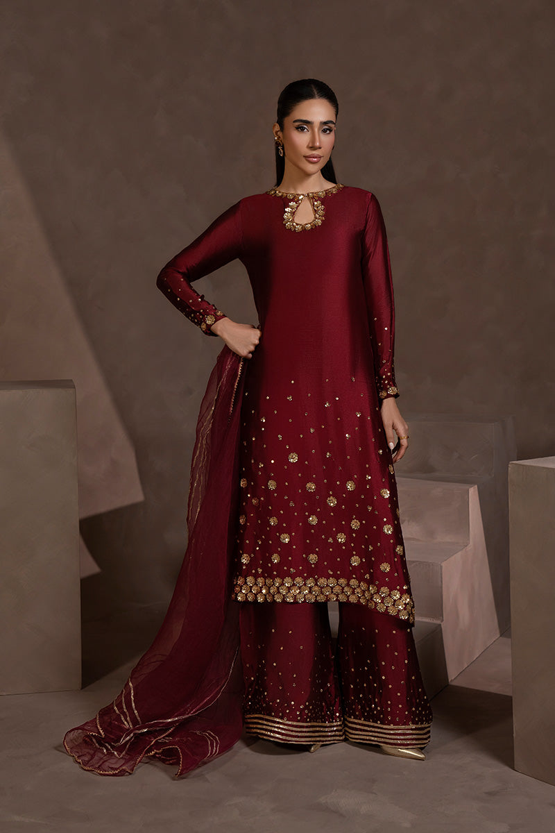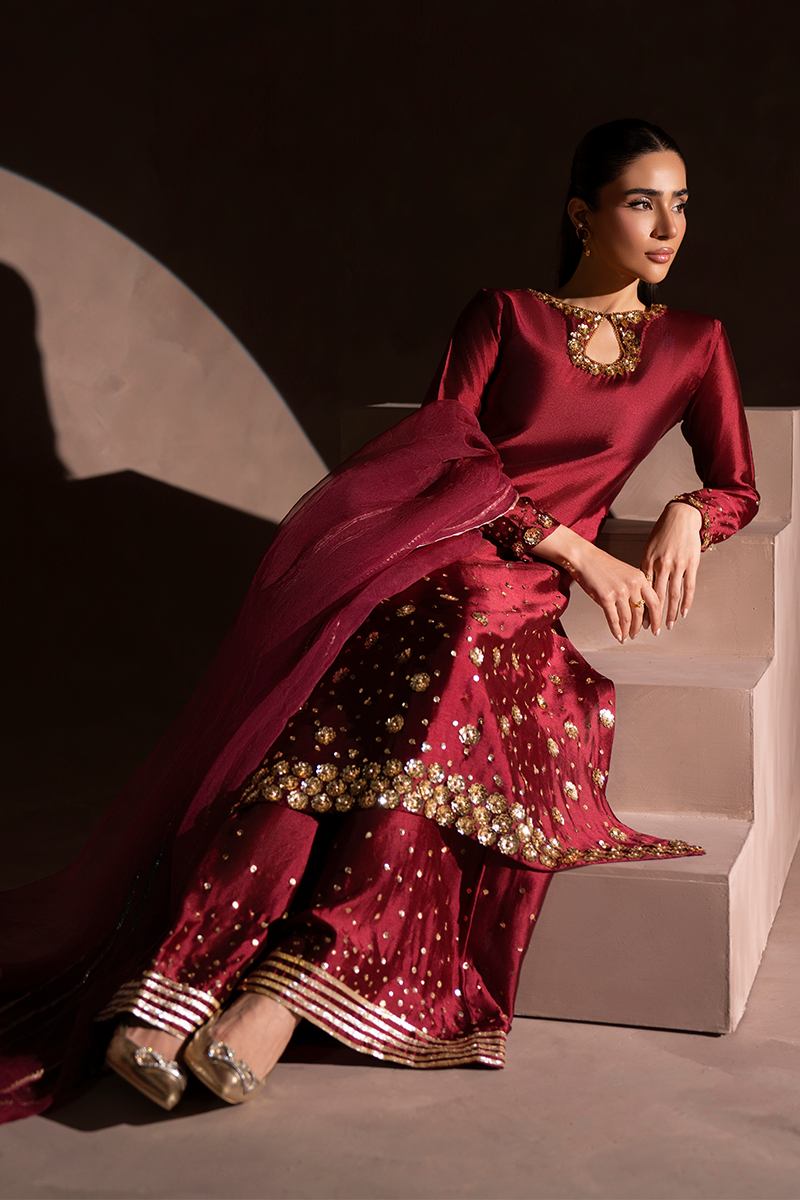 Wrapped in pure sheesha silk, RUBY is where effortless glamour meets refined craftsmanship — a stunning 3-piece ensemble featuring a beautifully tailored silk shirt, flowing palazzo pants, and a delicate pure organza dupatta, all fully lined for a flawless, ready-to-wear finish.