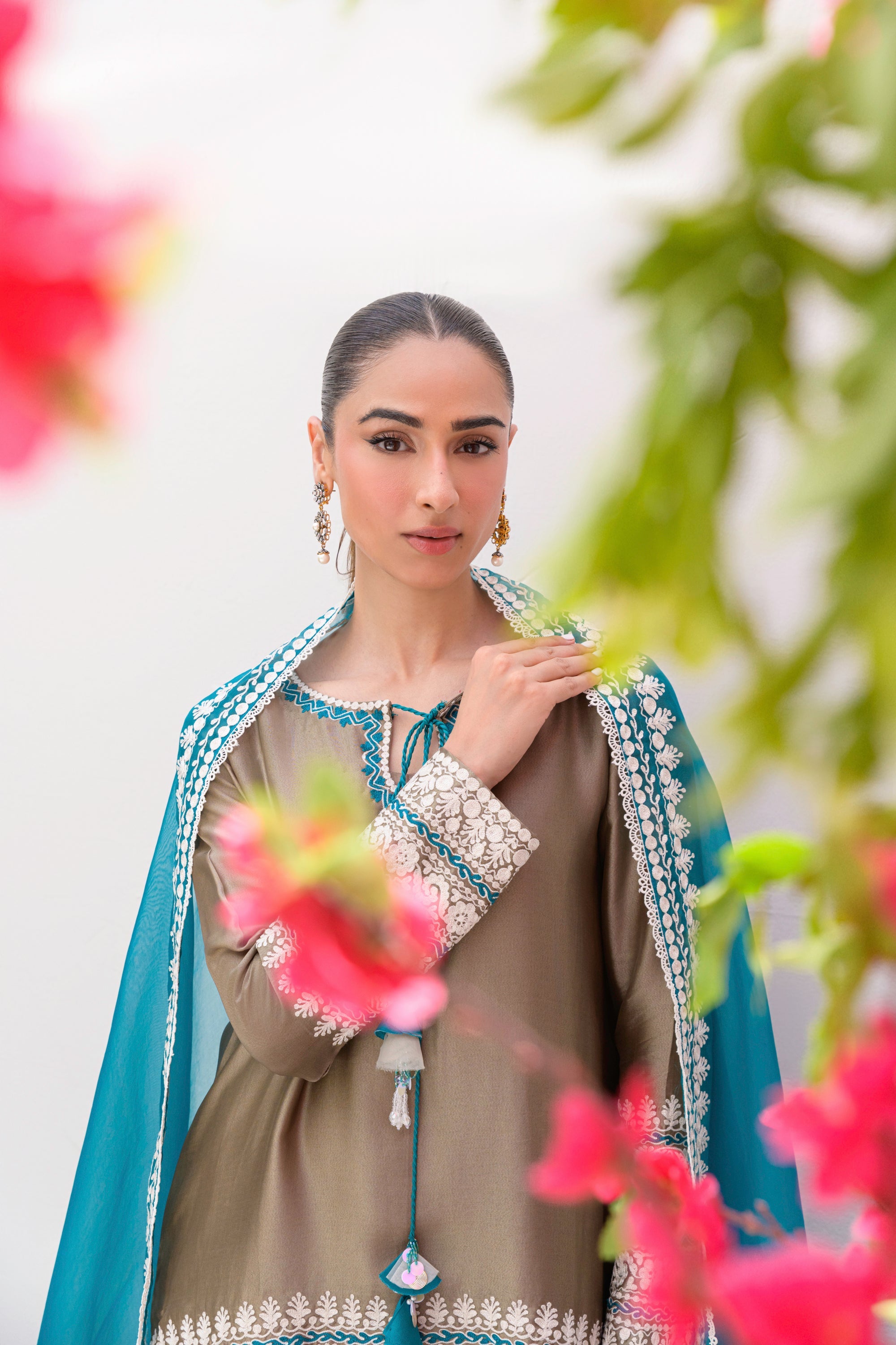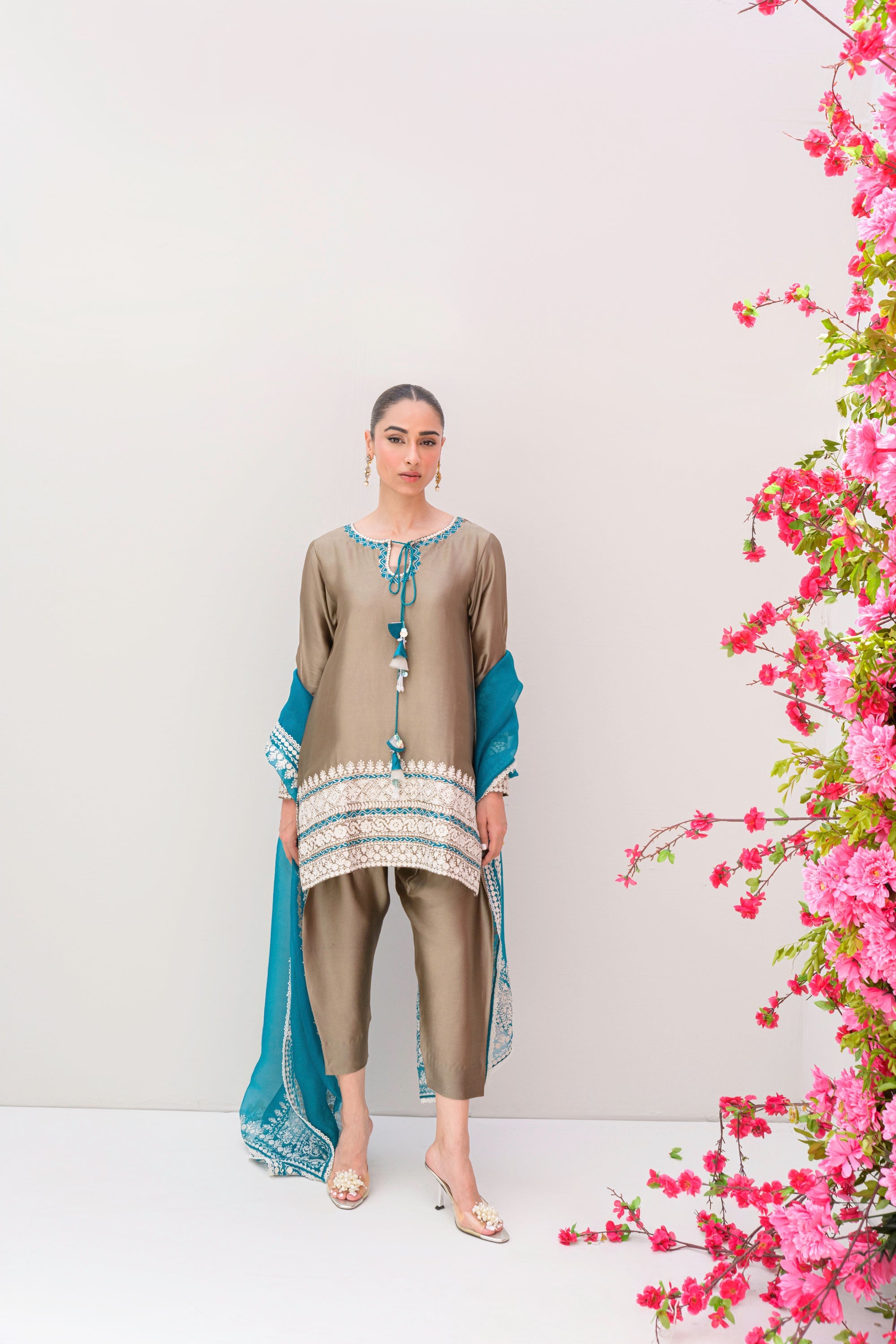 Smokey Beach is a sophisticated ensemble that blends subtle tones with modern detailing. This contemporary three-piece features a dusty olive short-style shirt paired with sleek skinny shalwar, both tailored in premium pure sheesha silk for a luxurious feel.