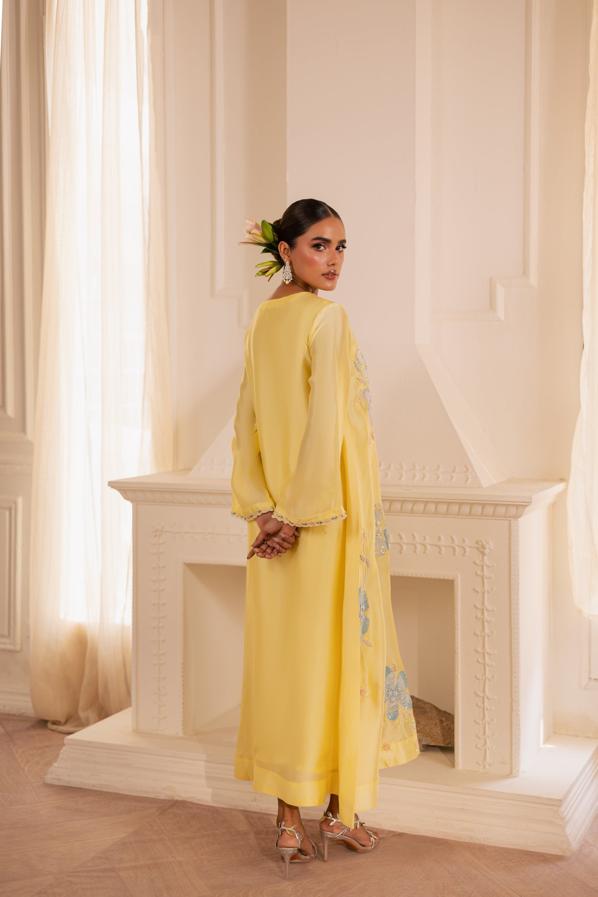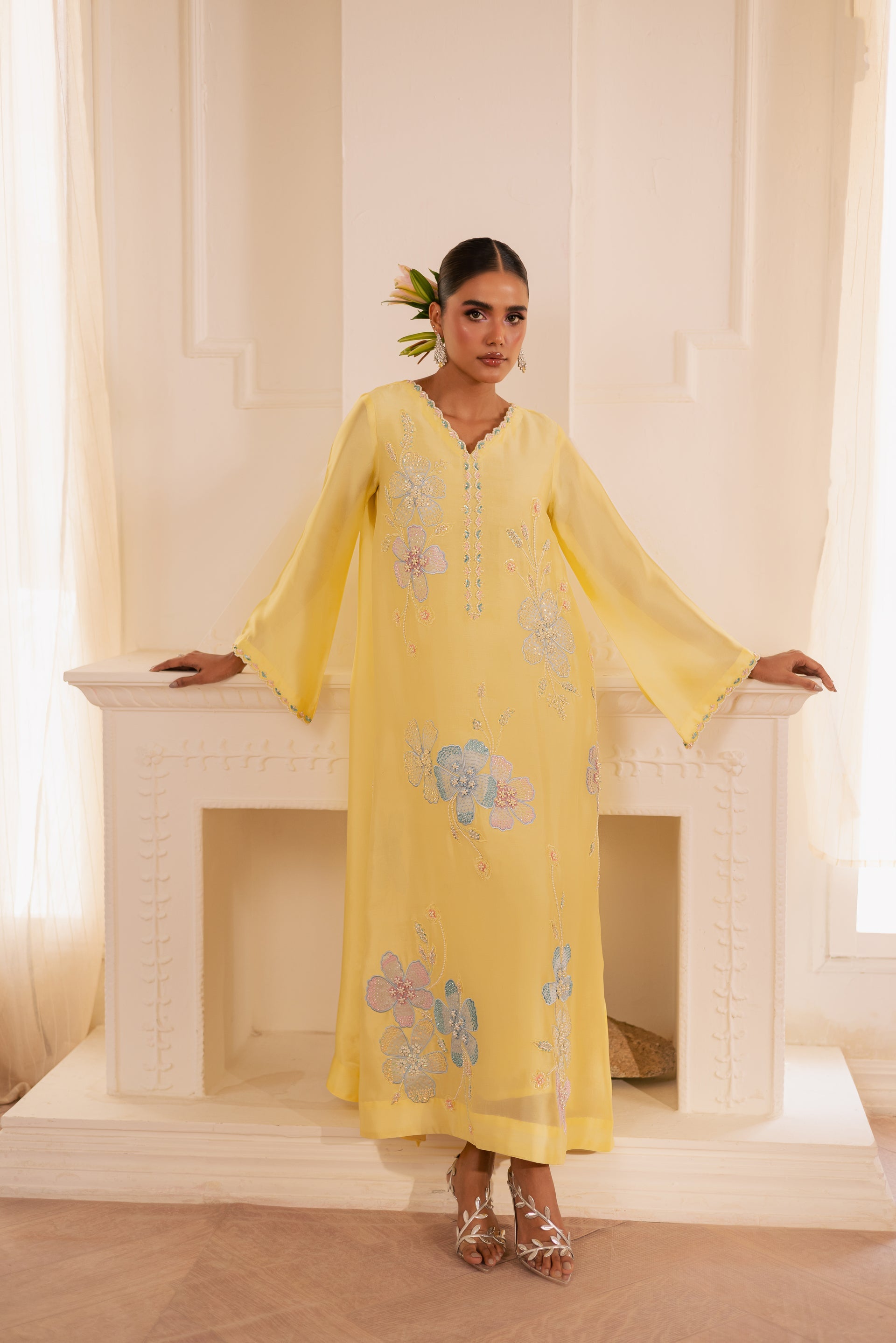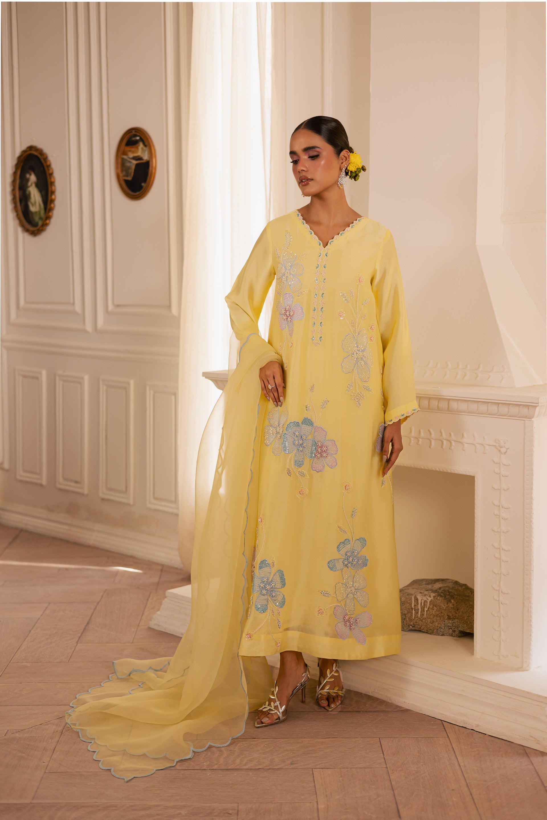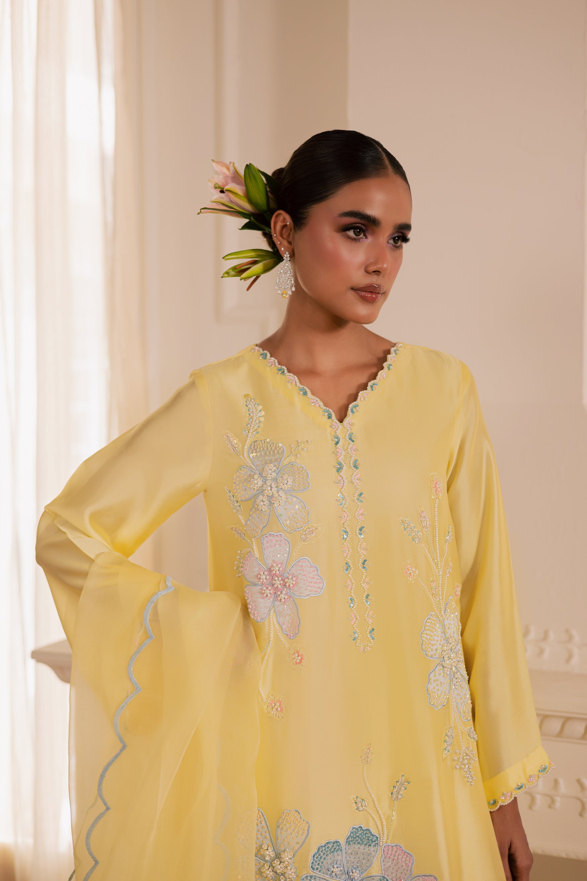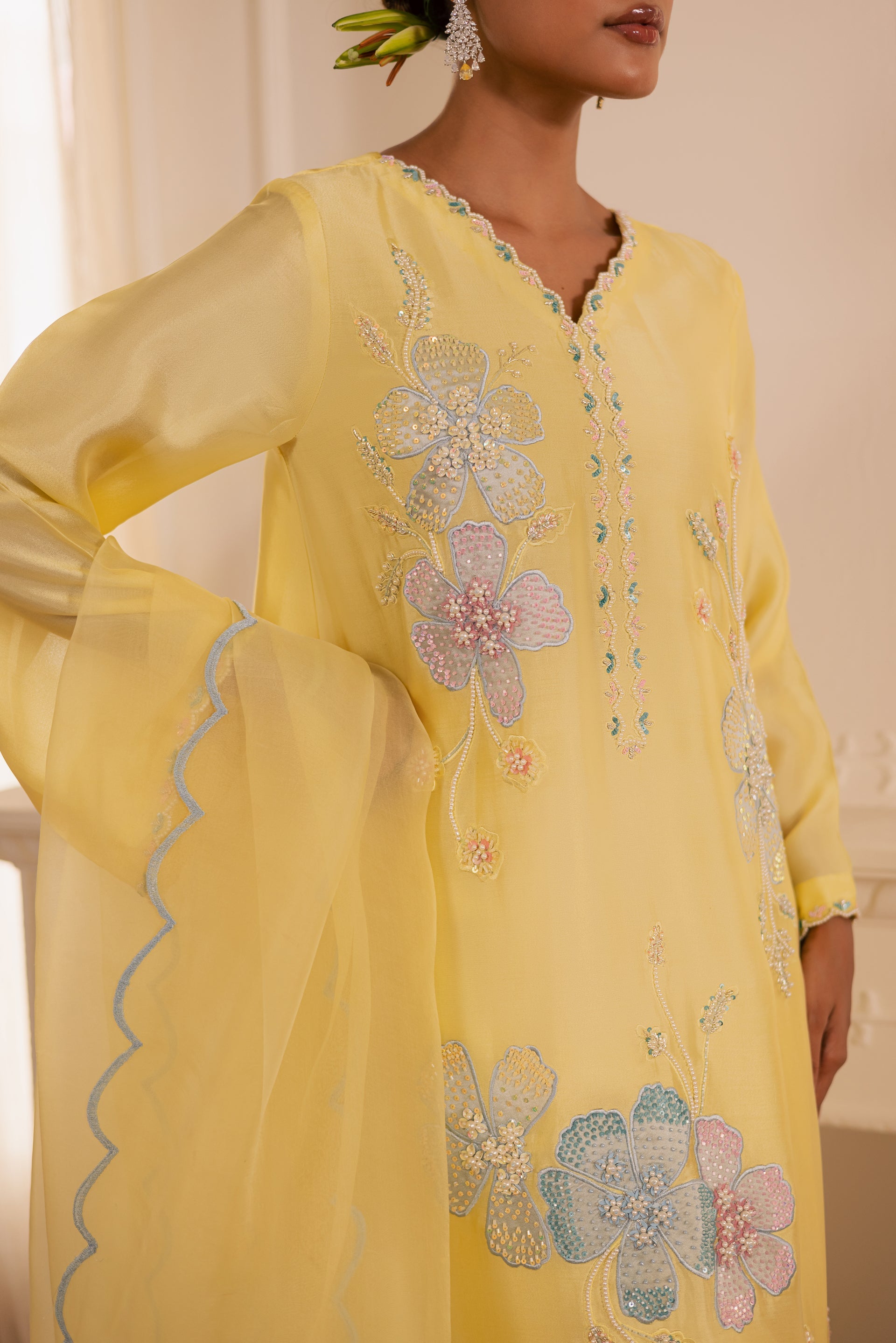 Draped in soft luxurious fabric, SOLEVIA is where breezy elegance meets delicate artistry — featuring loose-fit long A-line shirt with flattering V neckline adorned with delicately embellished floral motifs using pearls, sequins, and katdana, paired with classic straight trouser and flowing organza dupatta with scalloped edges on all four sides for perfect ease and elegance.